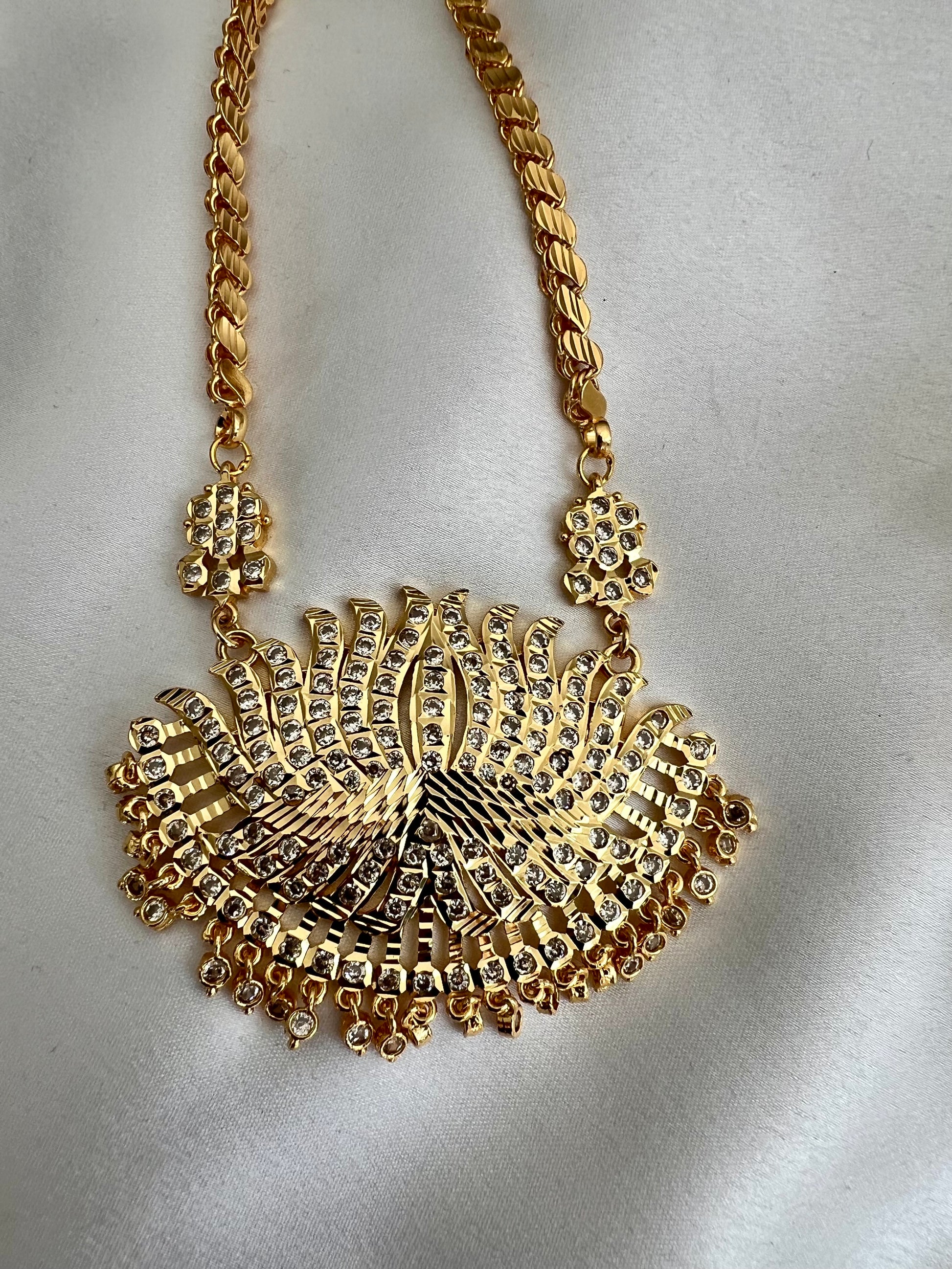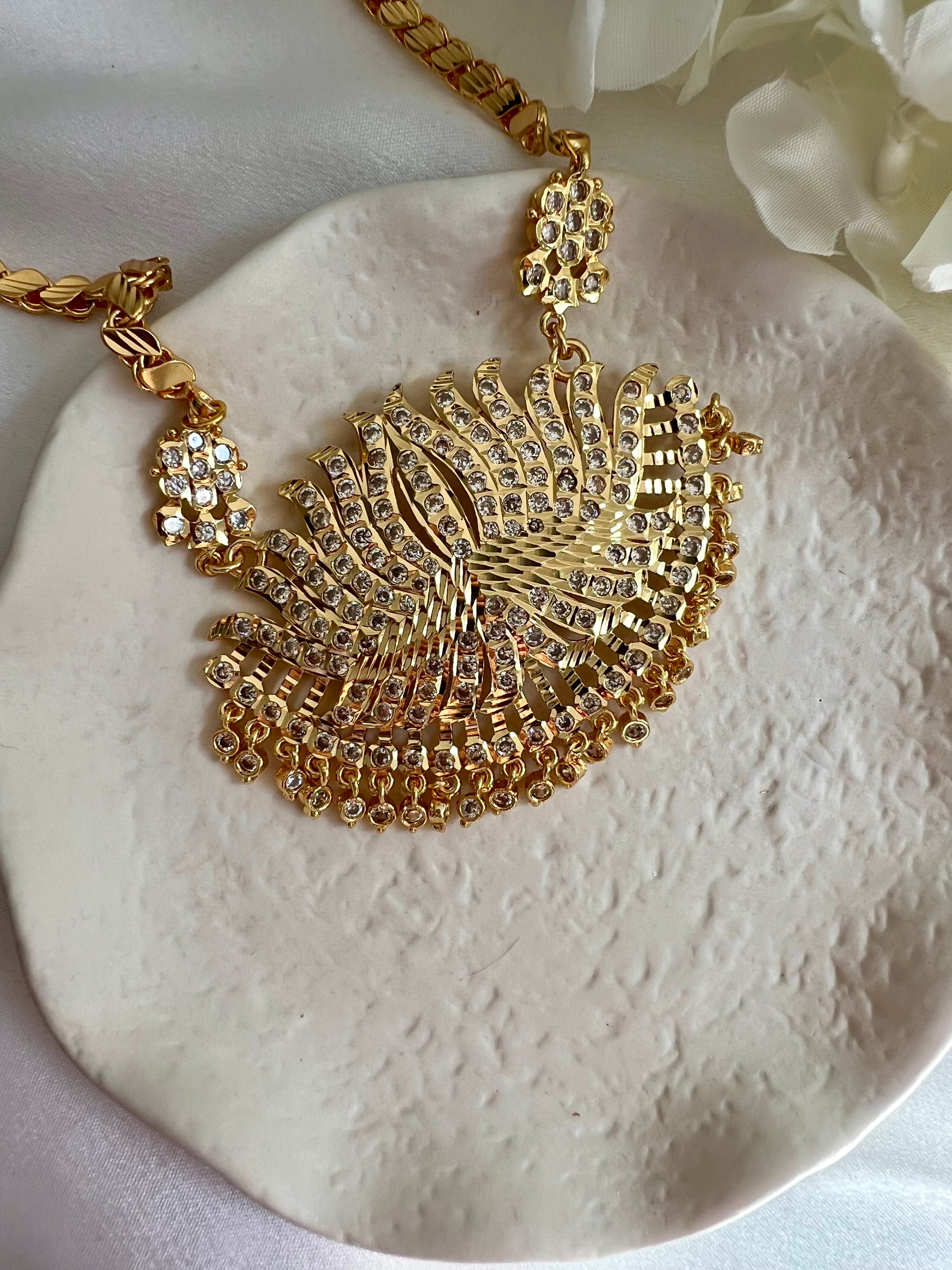 Traditional South Indian long pathakkam necklace with white stones only.