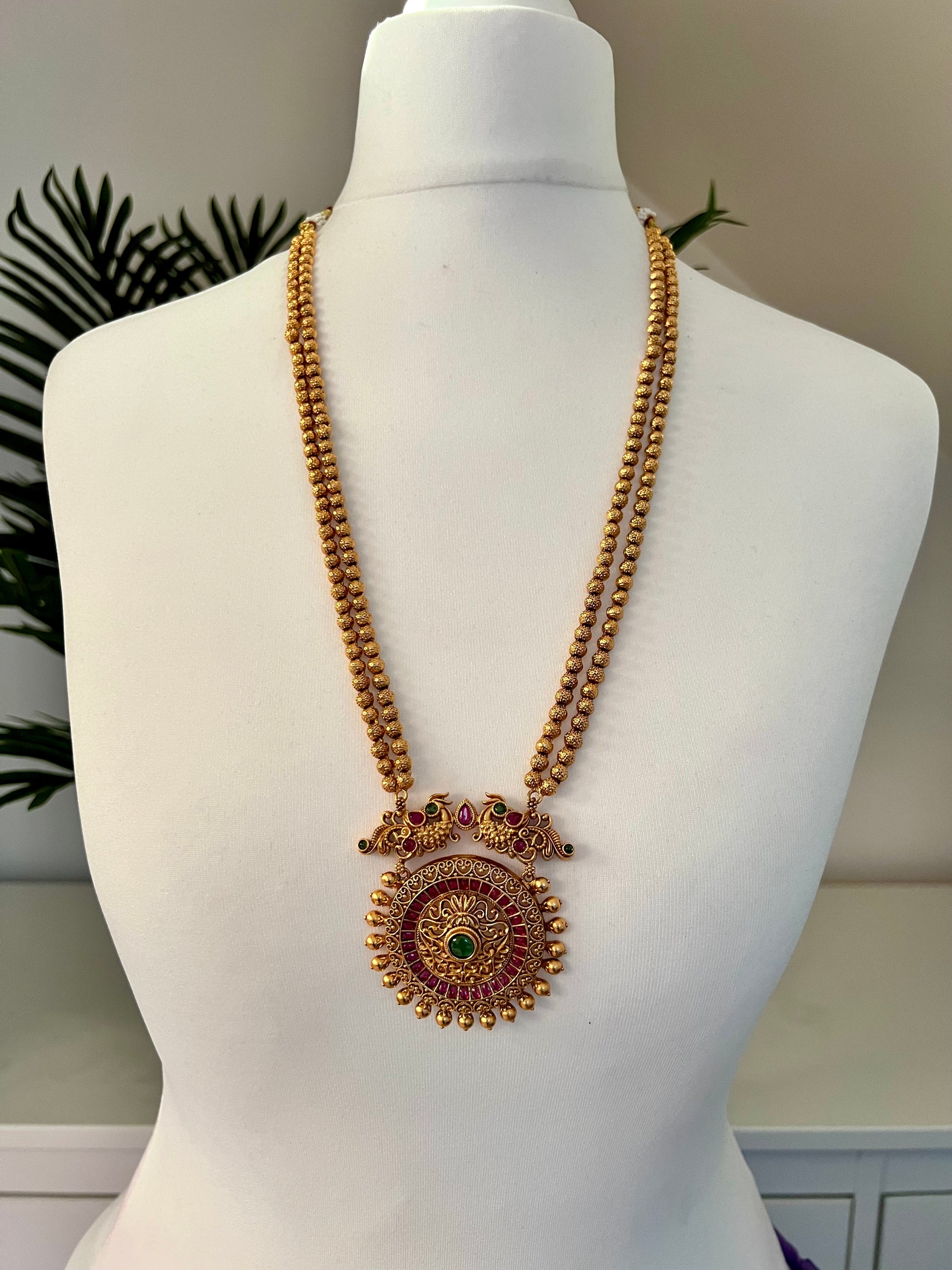 This is a beautiful antique matte necklace set in ruby and green. The pendant is large and round, with two small peacocks embellished in ruby and green stones.