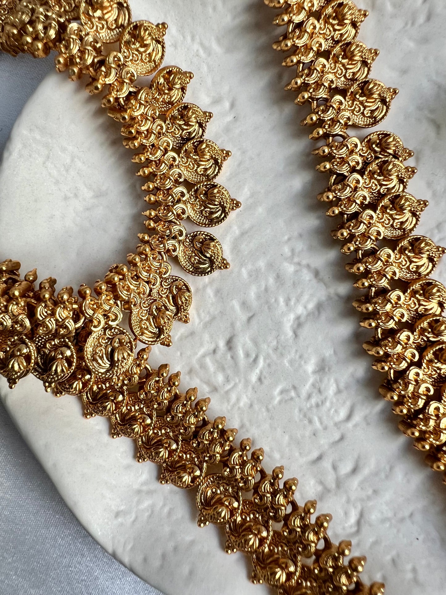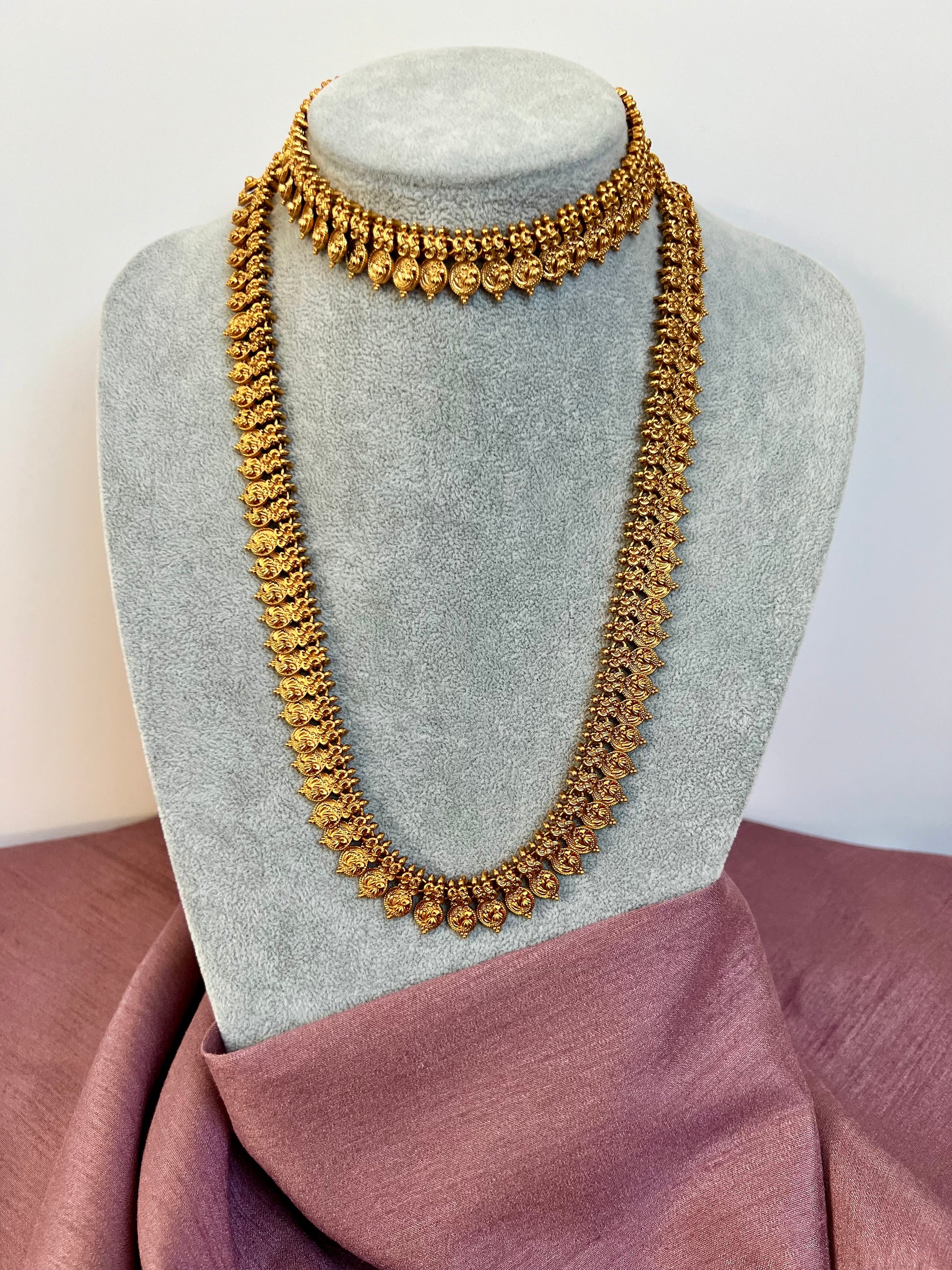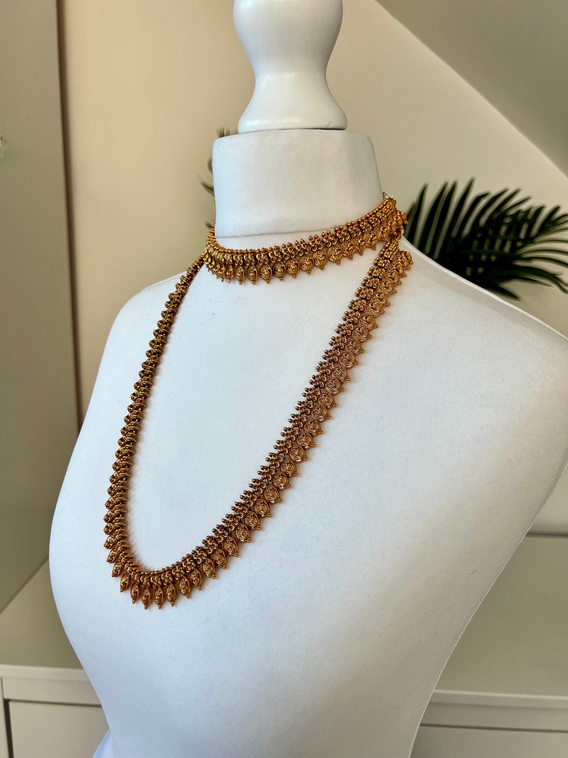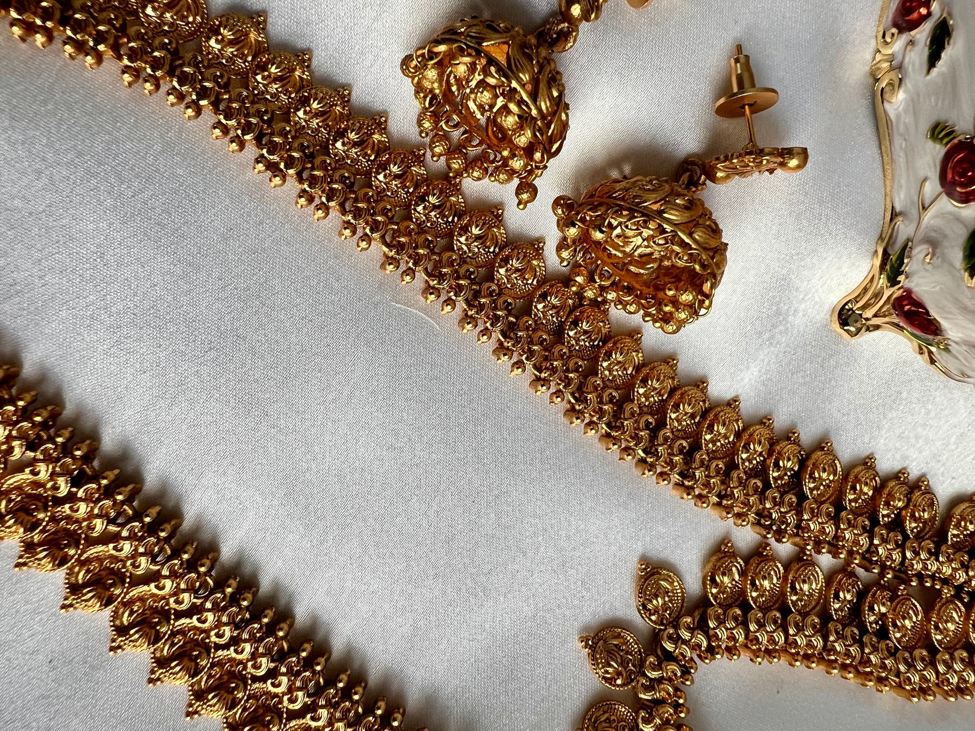 A chunky antique indian necklace jewellery set with a short and long necklace. The jewellery is a plain matte yellow gold which sits nicely on the neckline, giving a rich look to any outfit, comes with matching jhumkas