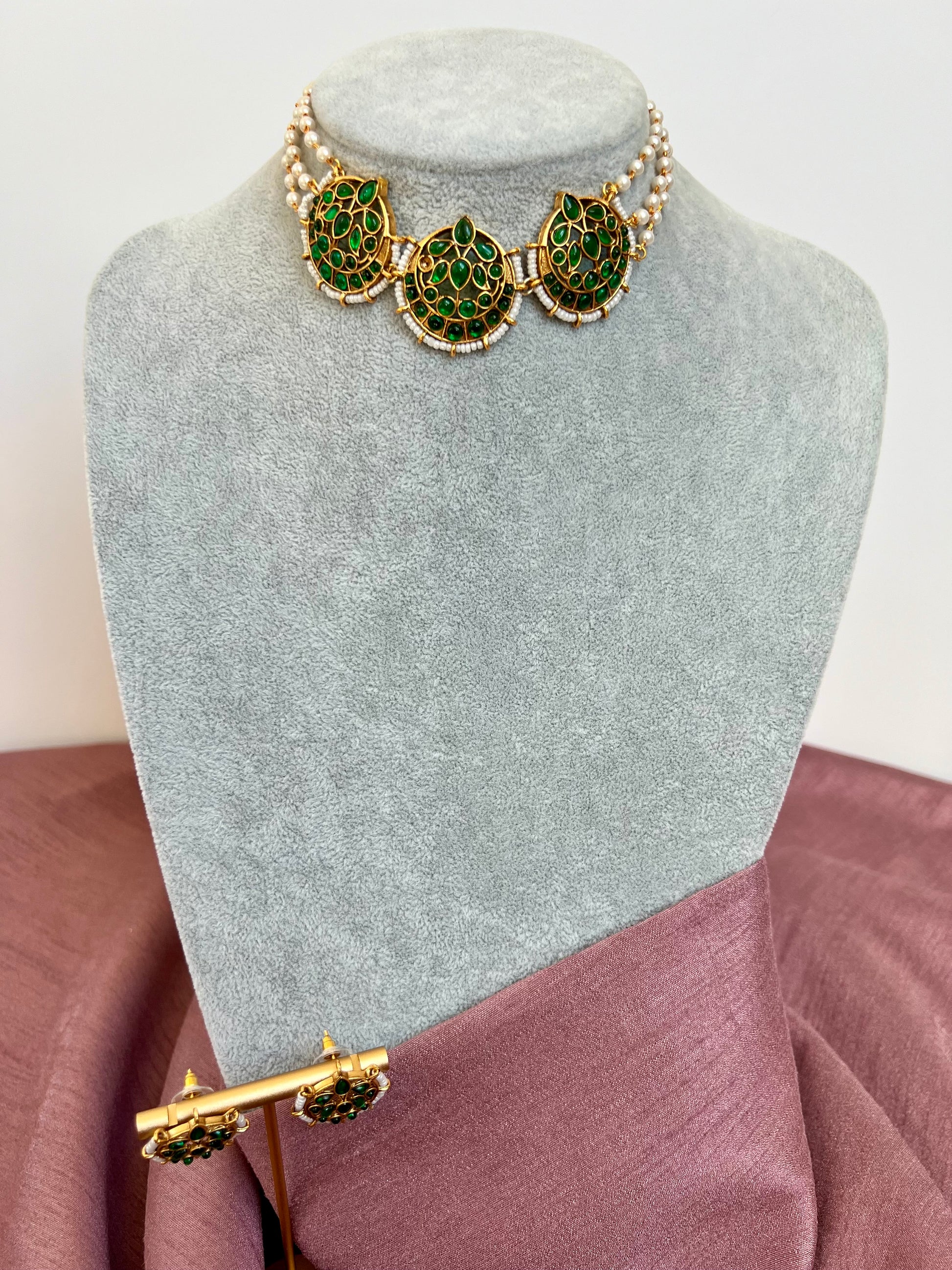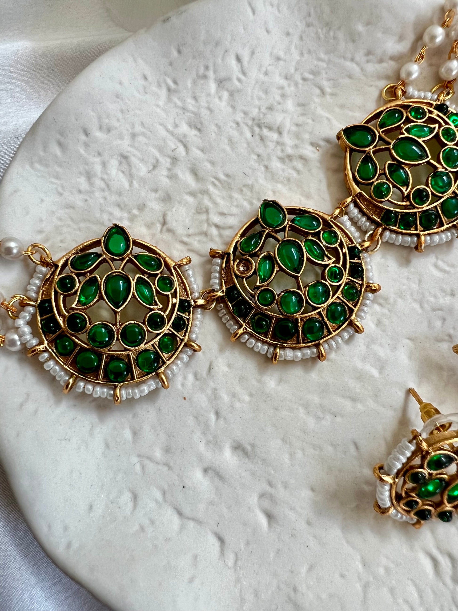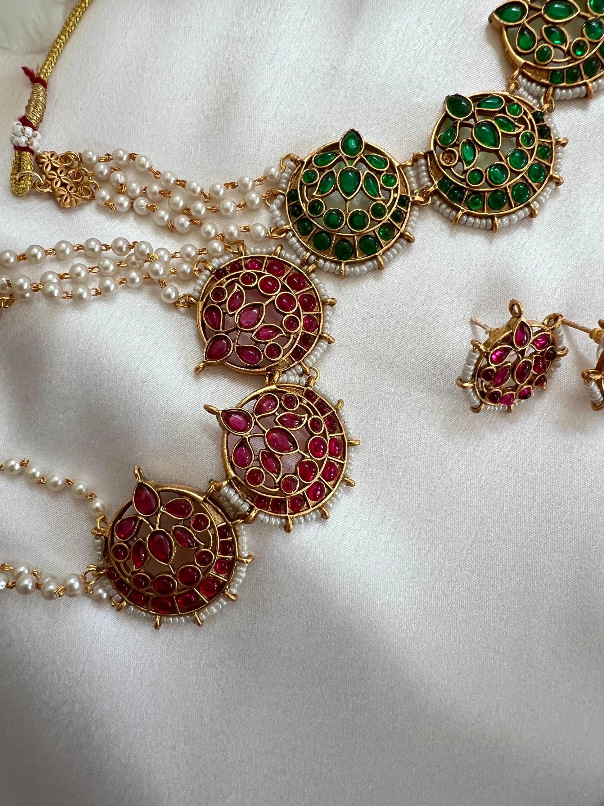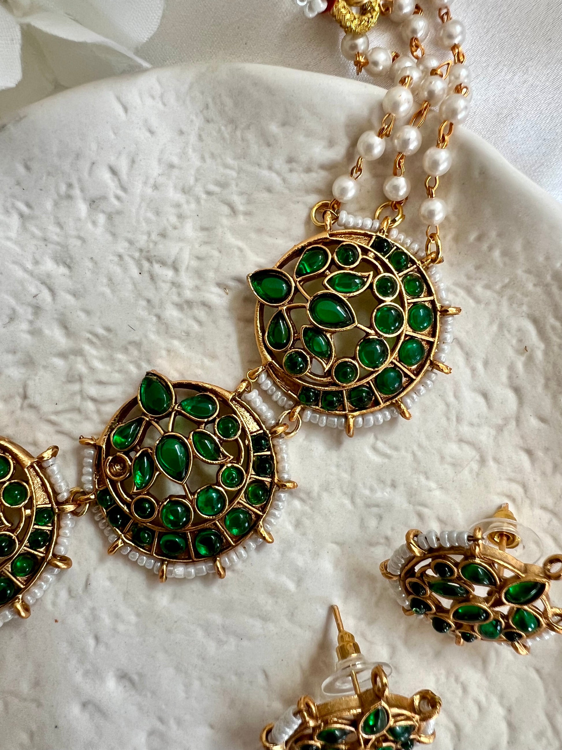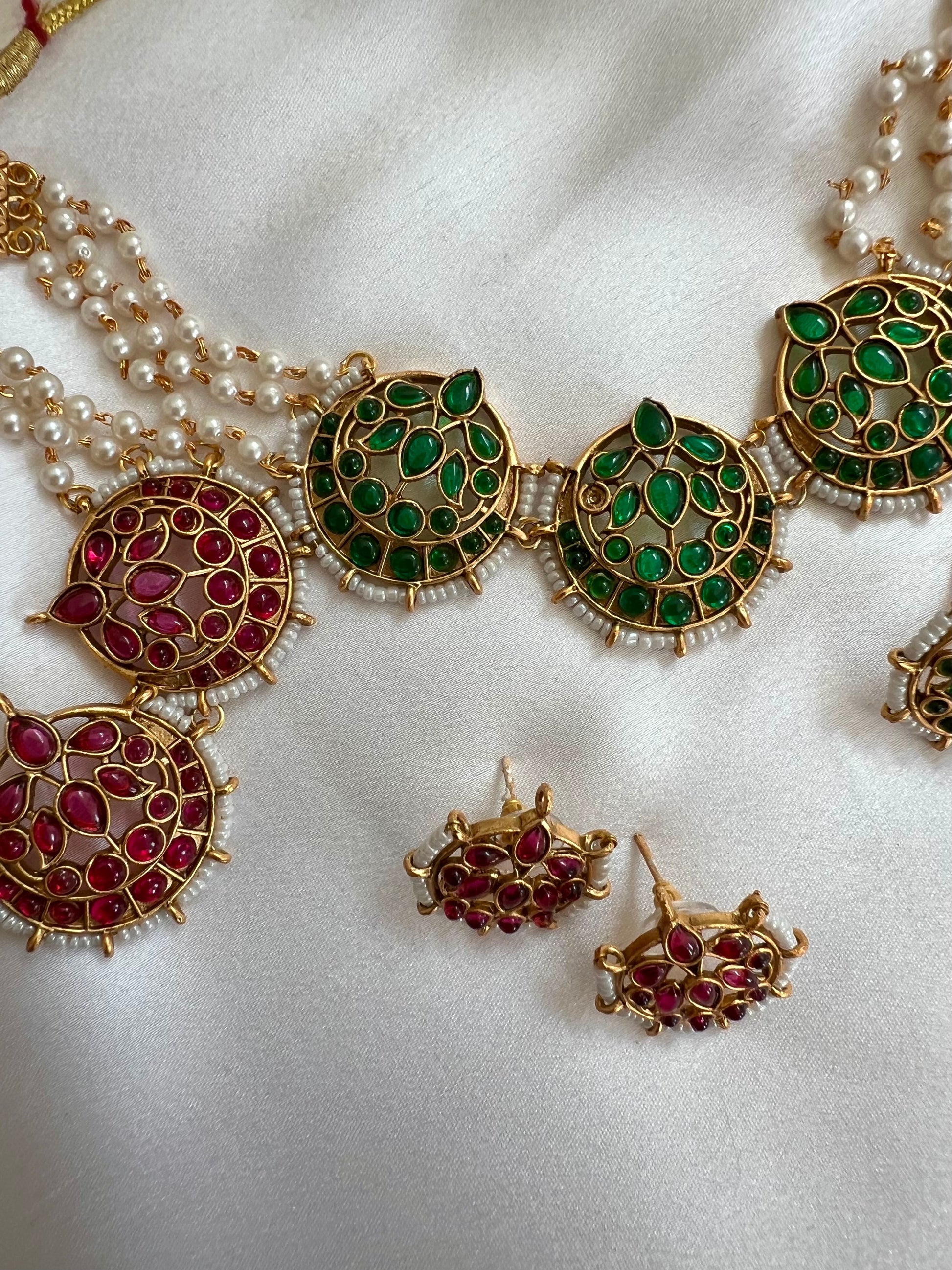 A beautiful traditional South Indian kemp necklace made of either green ruby stones or rubygreen stones, comes with matching small stud earrings.