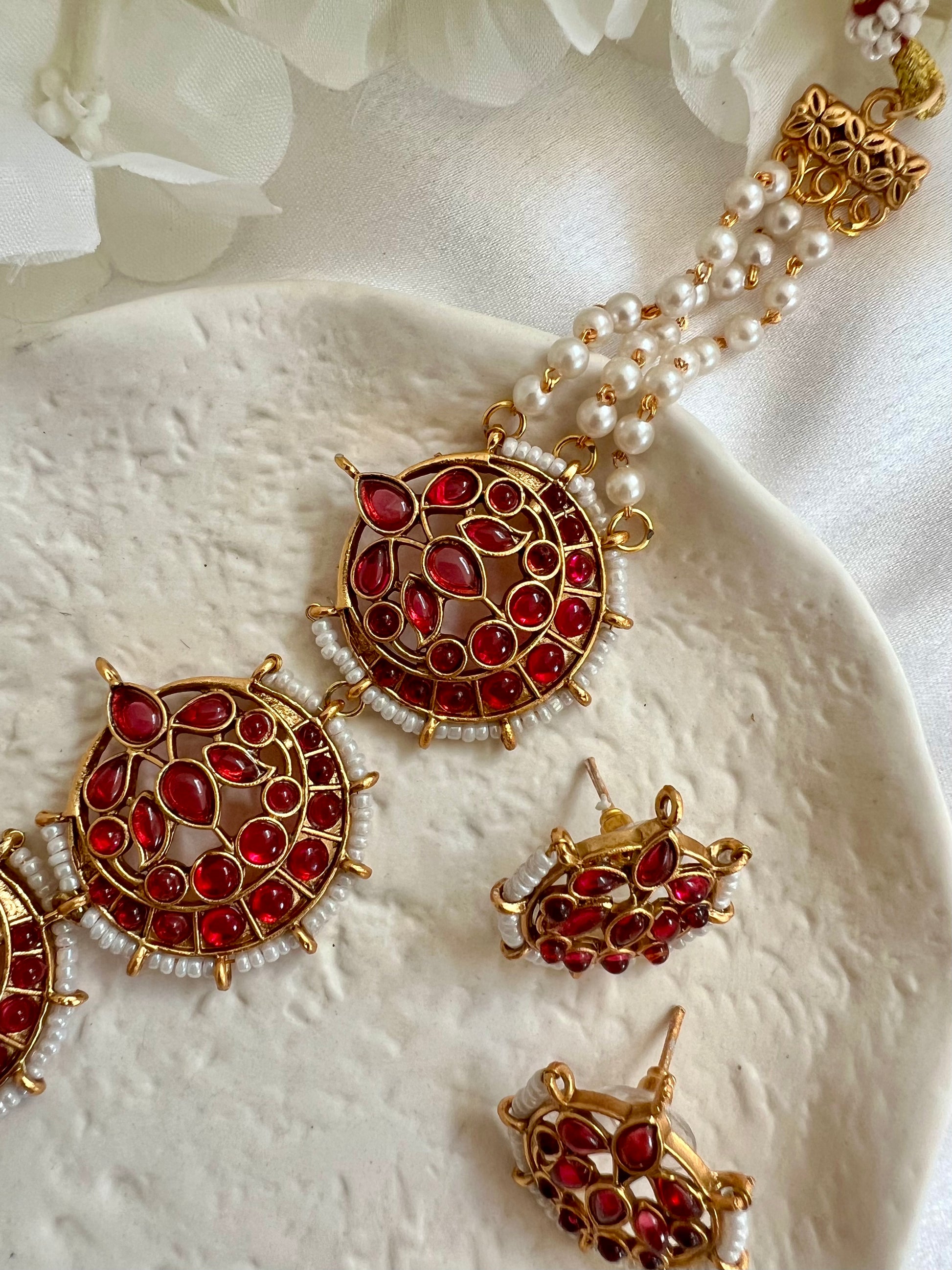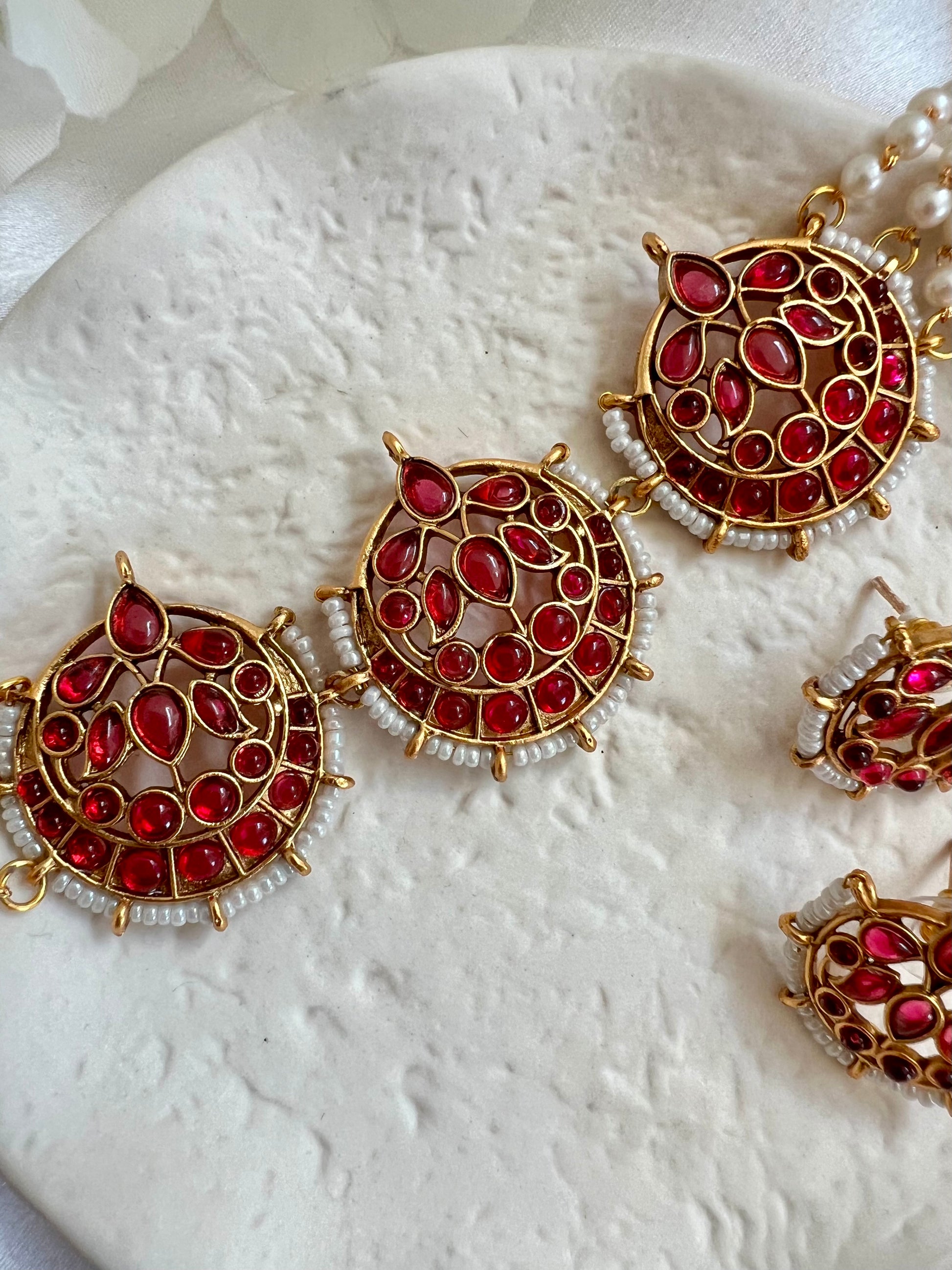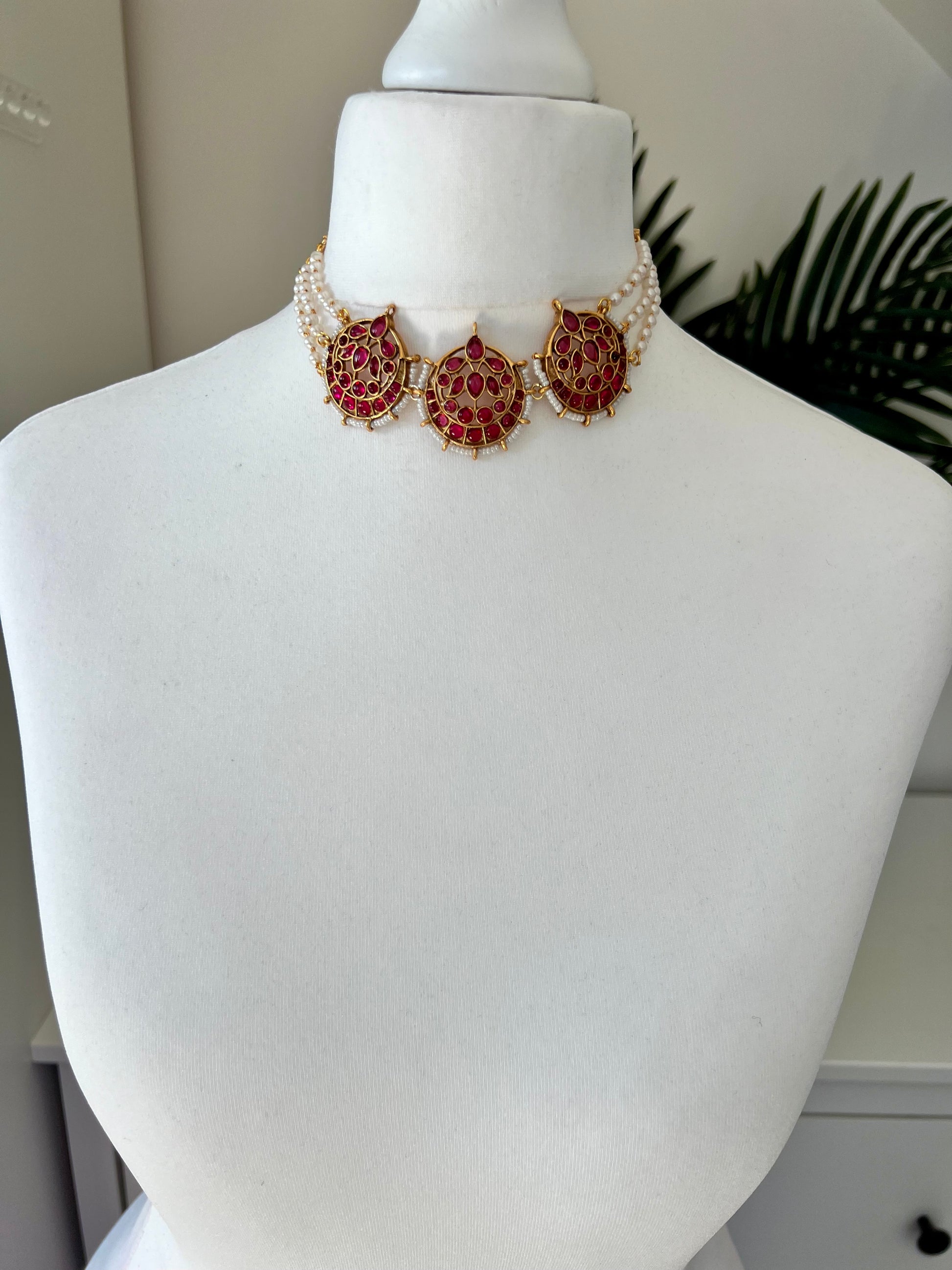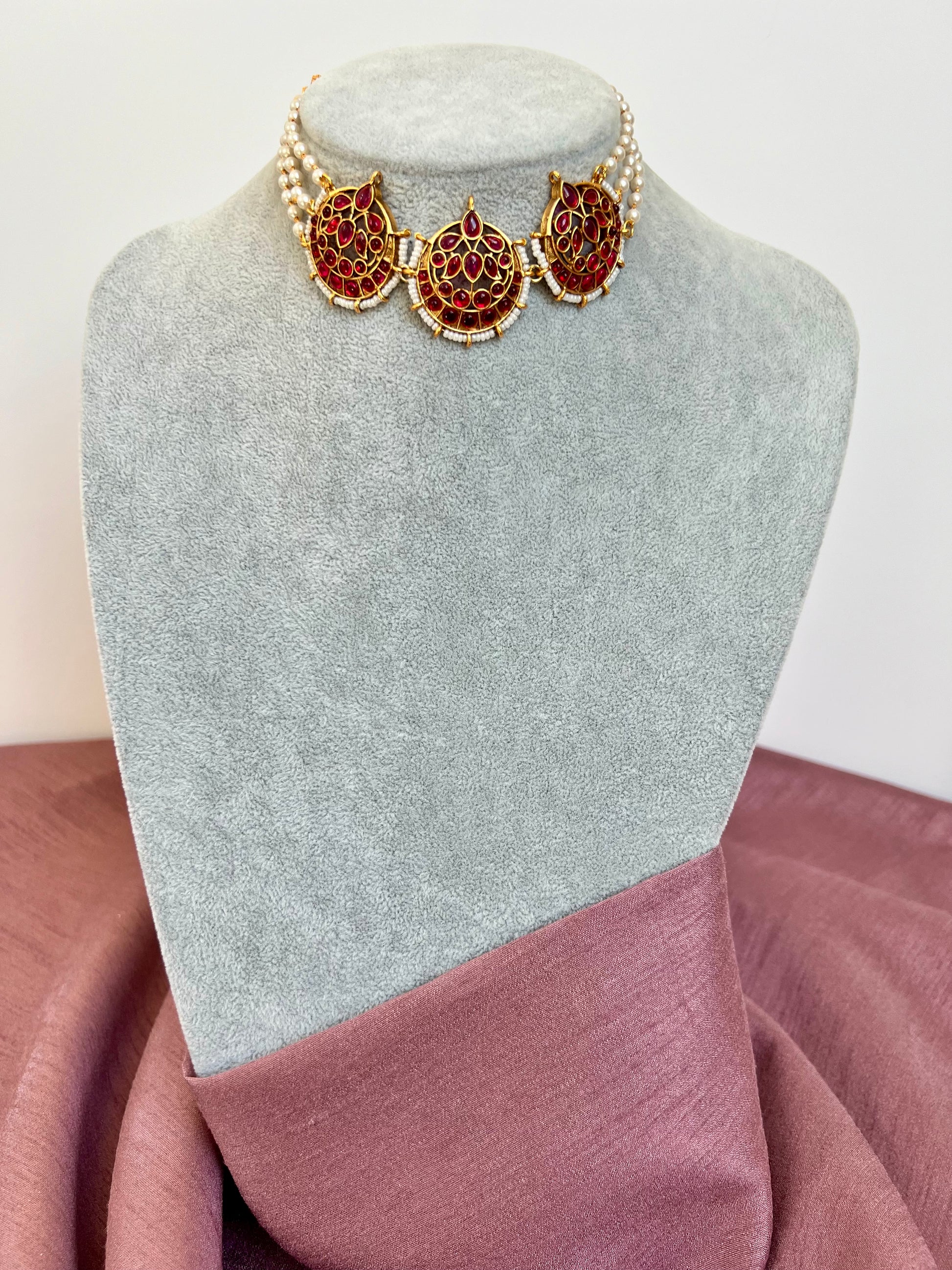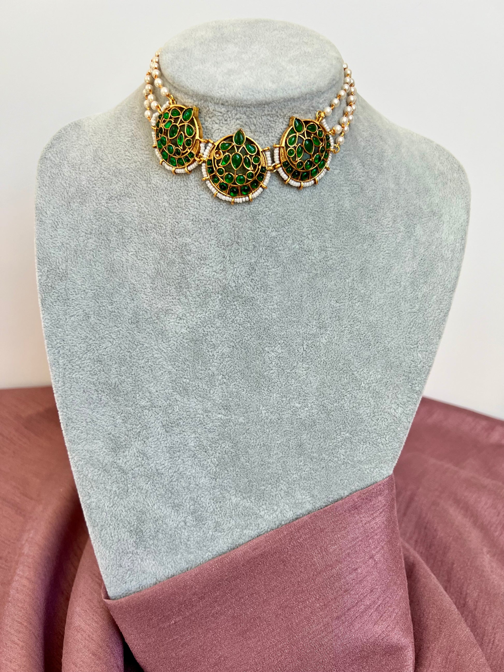 A beautiful traditional South Indian kemp necklace made of either green ruby stones or rubygreen stones, comes with matching small stud earrings.