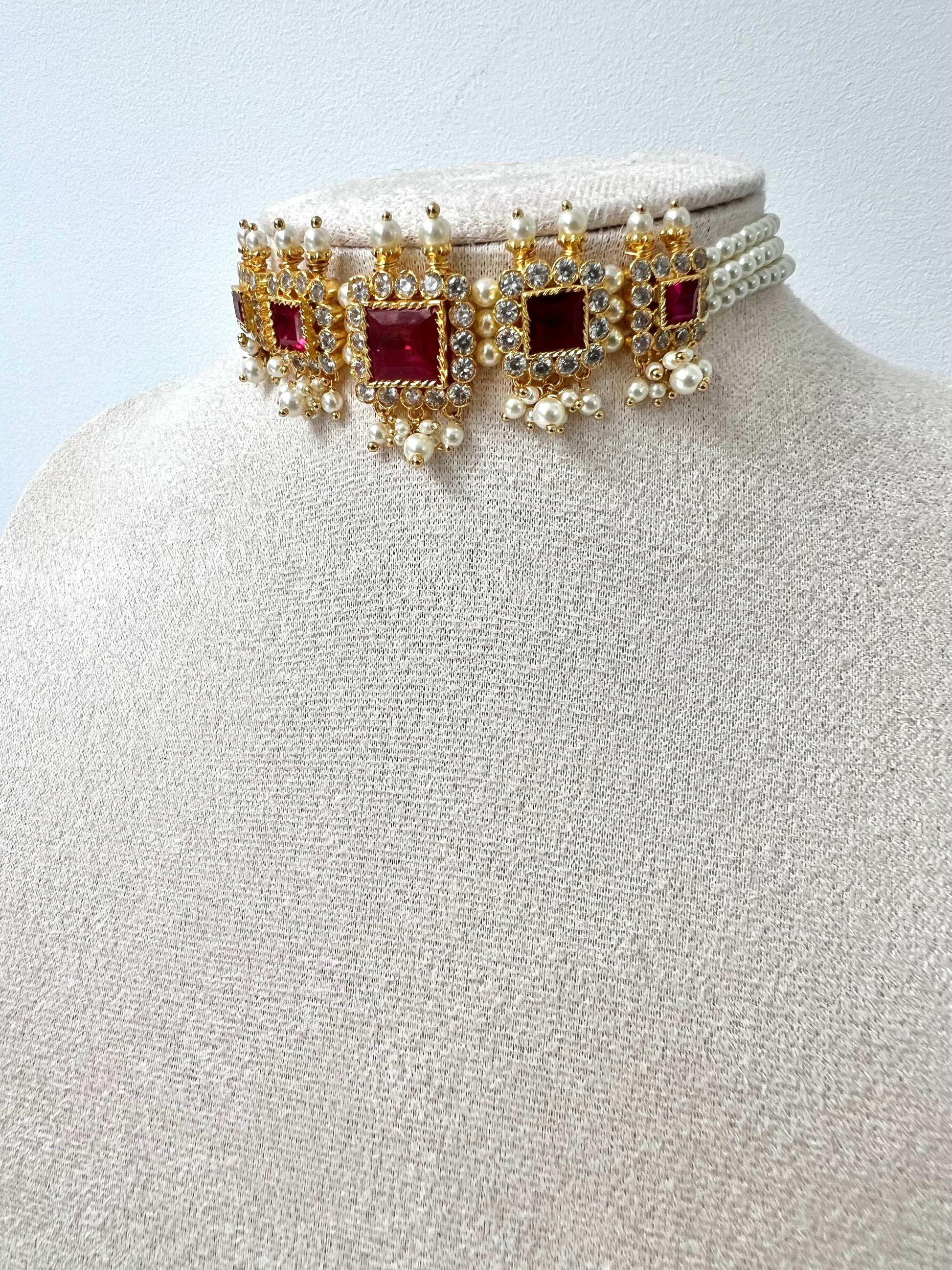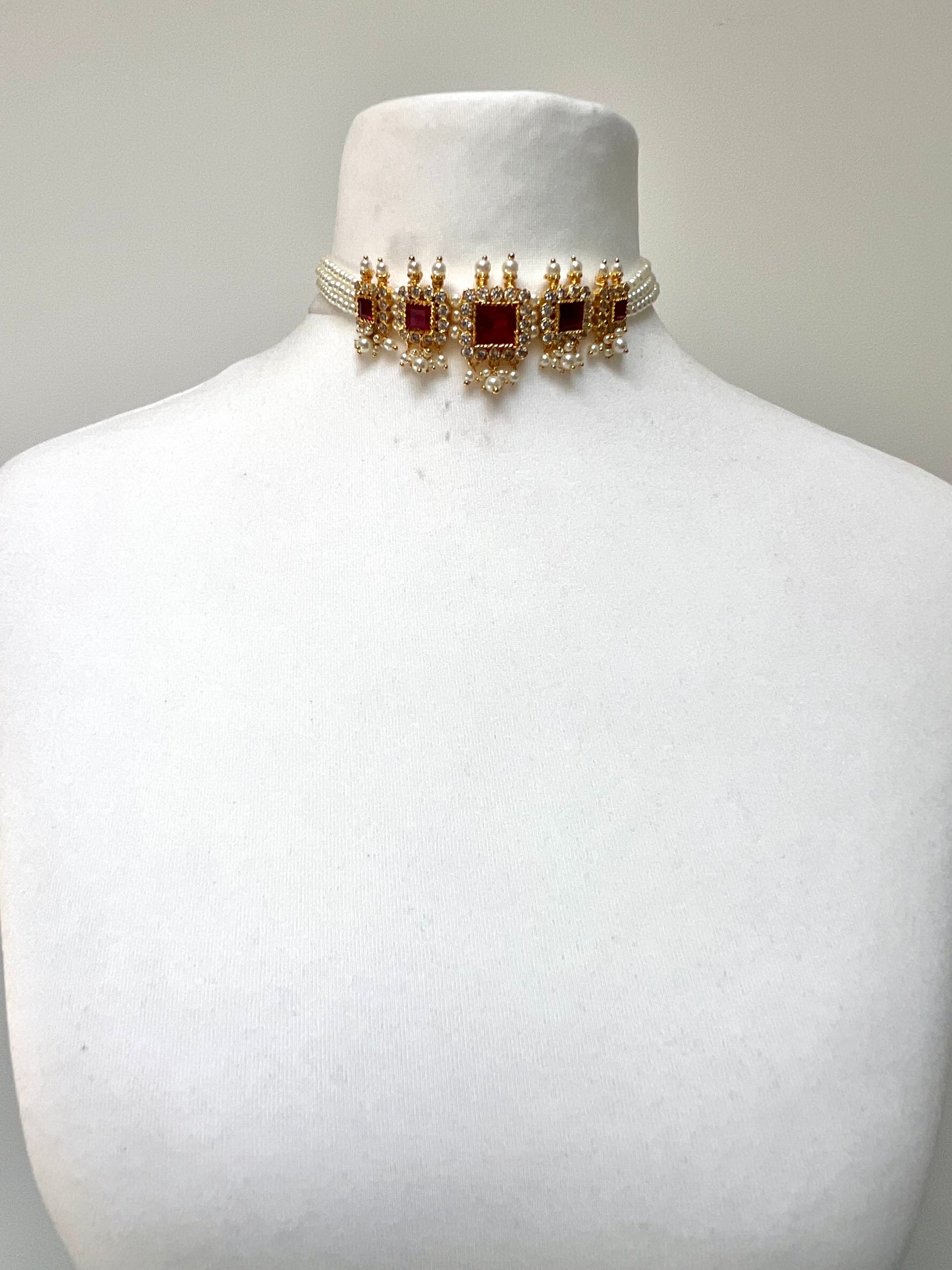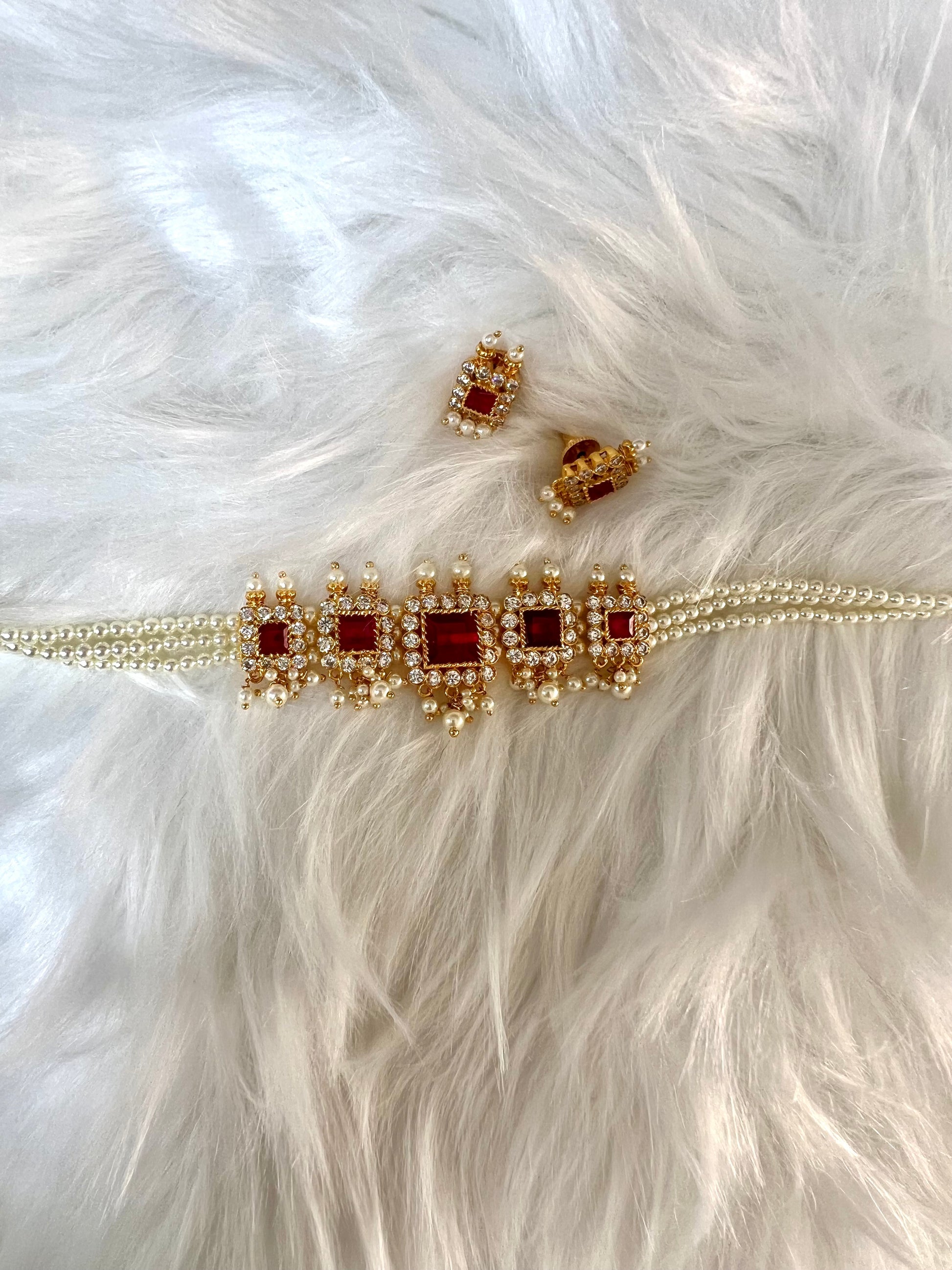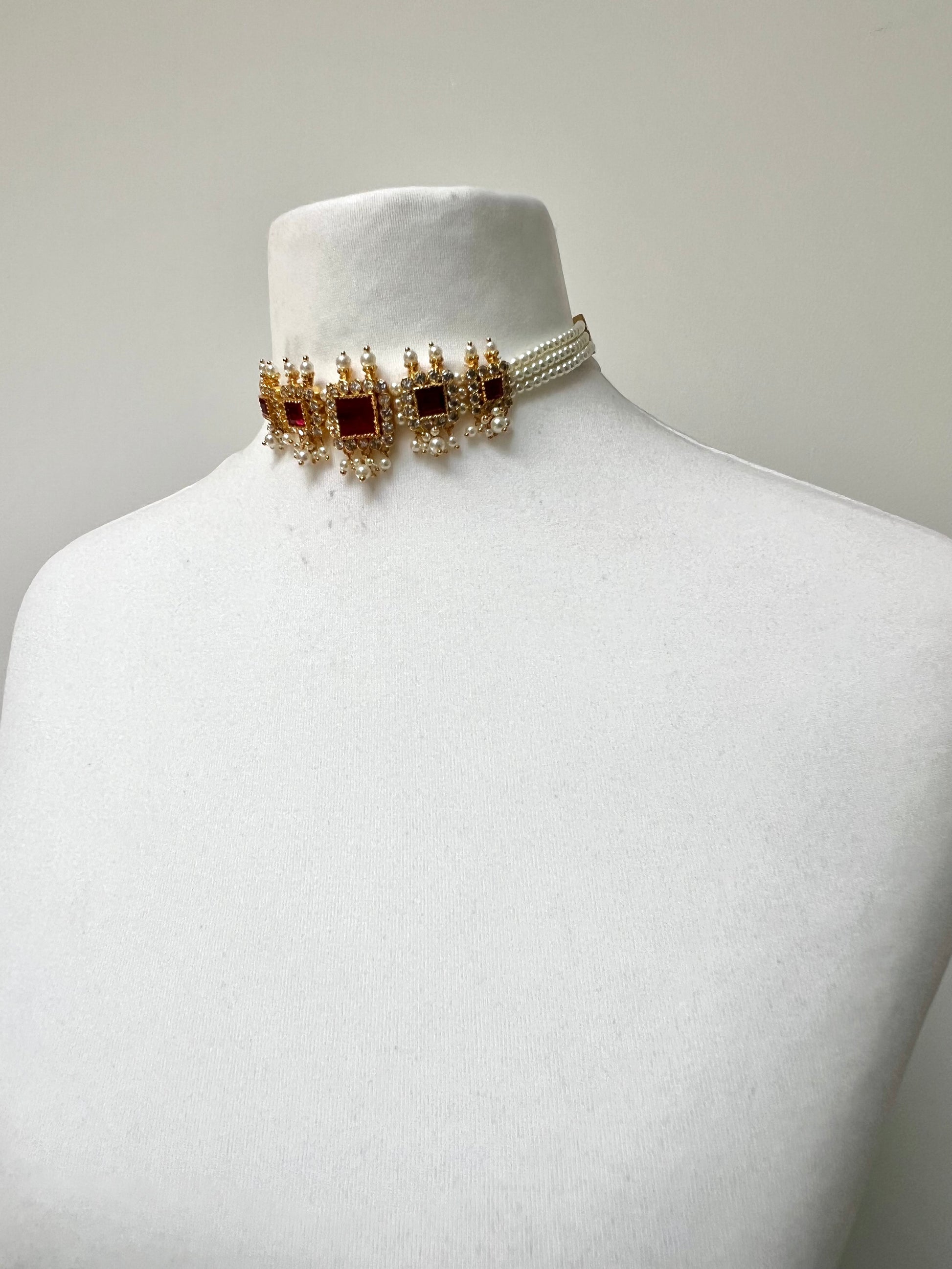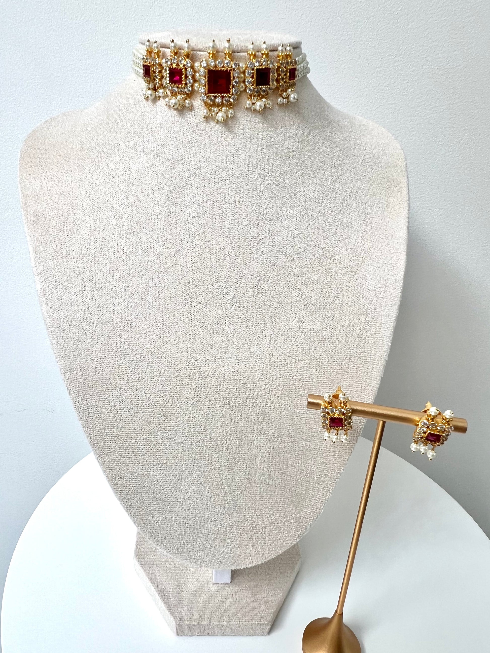 PARVATI - Pearl choker in ruby and white with matching earrings N3305