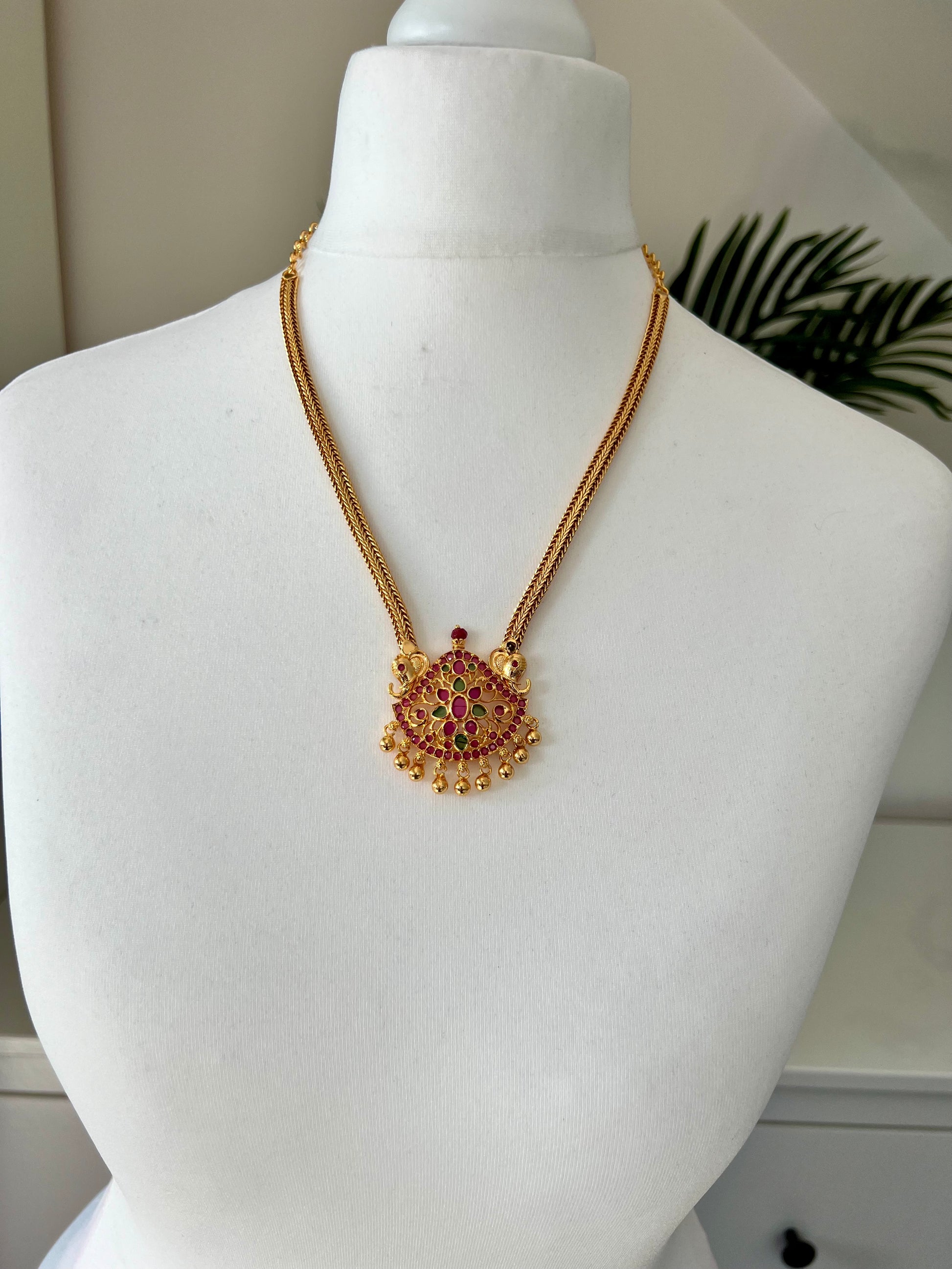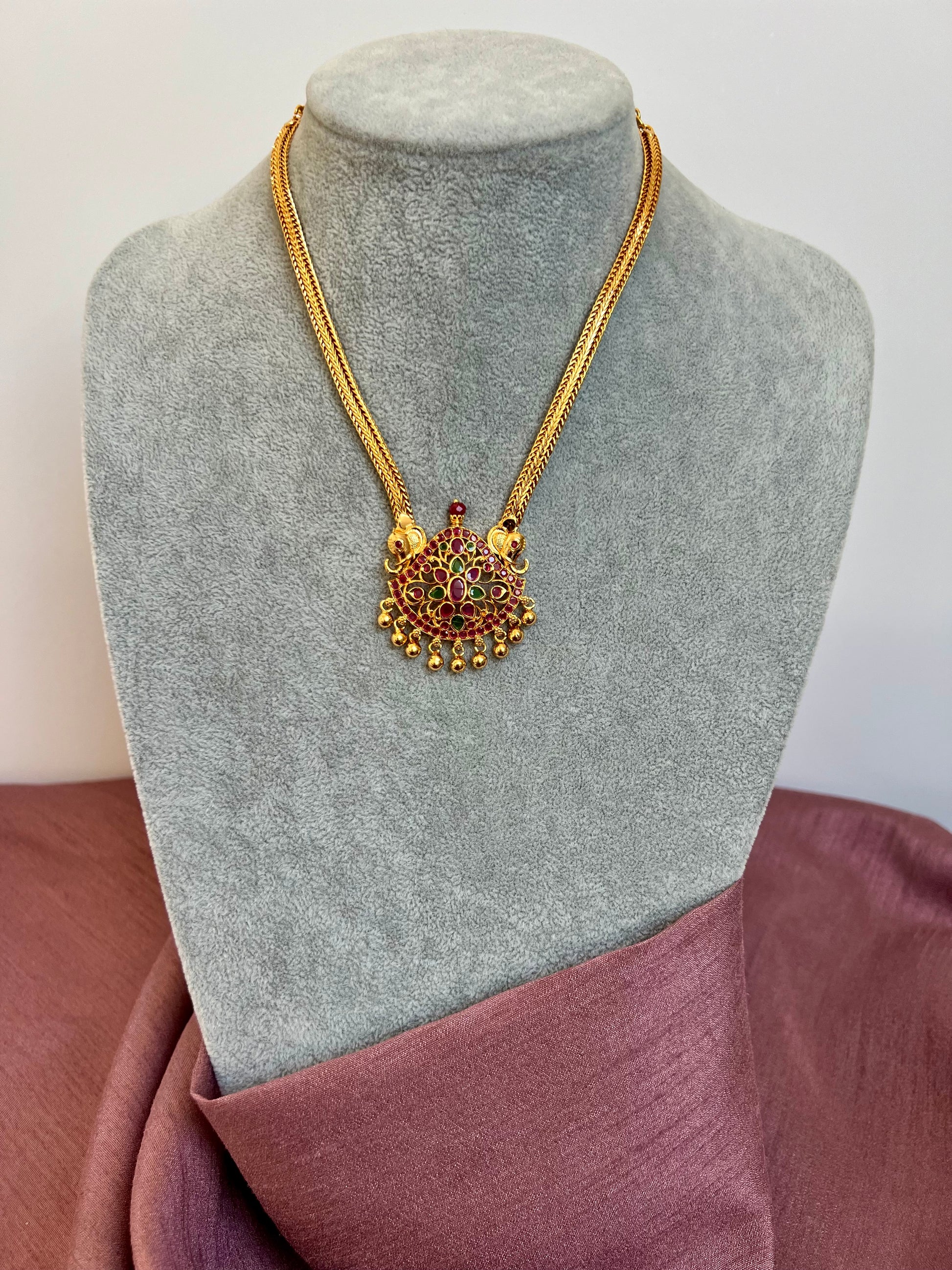 A beautiful short necklace made out of gold and embellished with rubygreen stones and dangling golden beads.