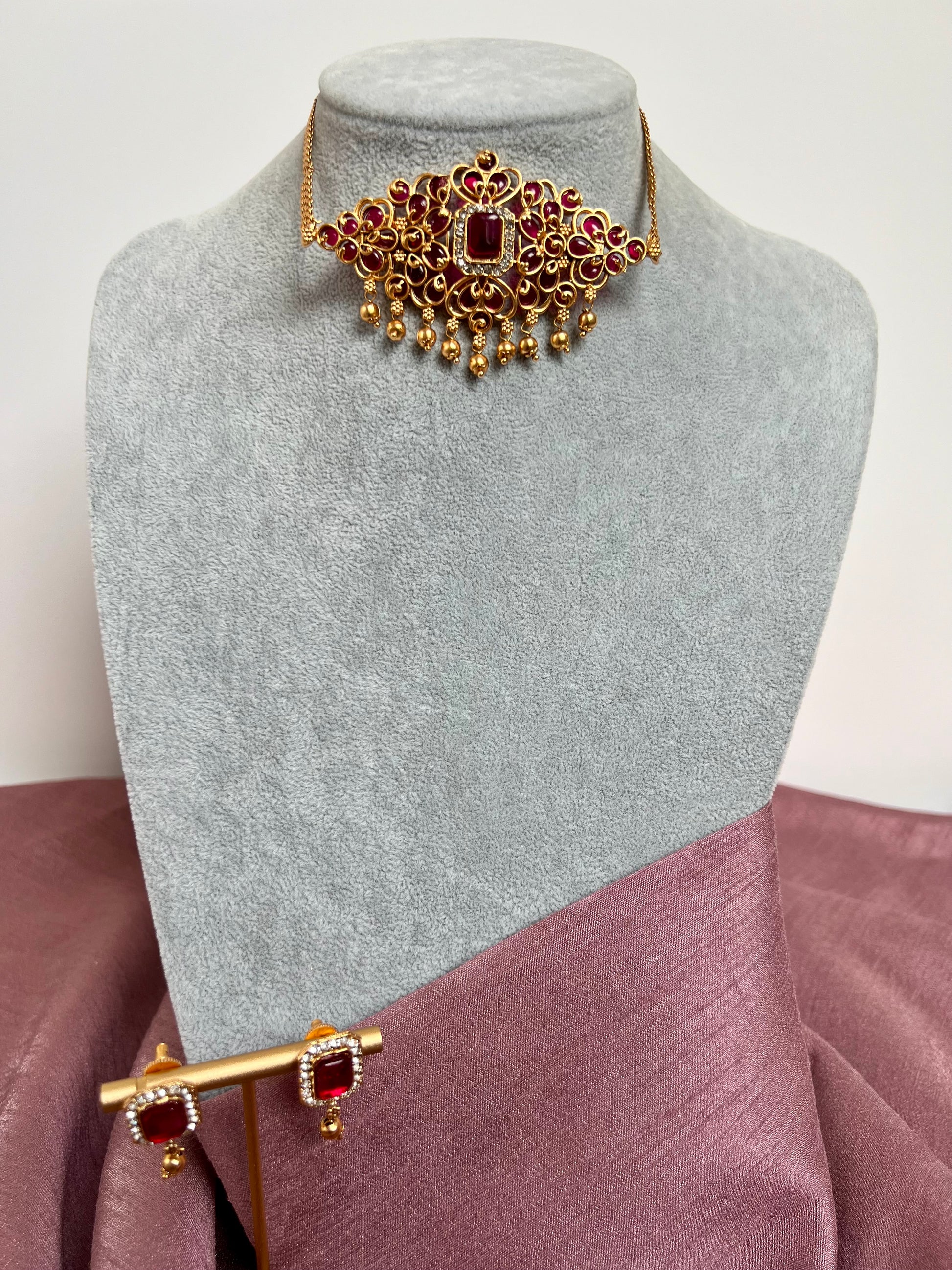 Simple traditional Indian choker necklace with dangling pearls, comes in either ruby stones or rubygreen, comes with matching small studs.