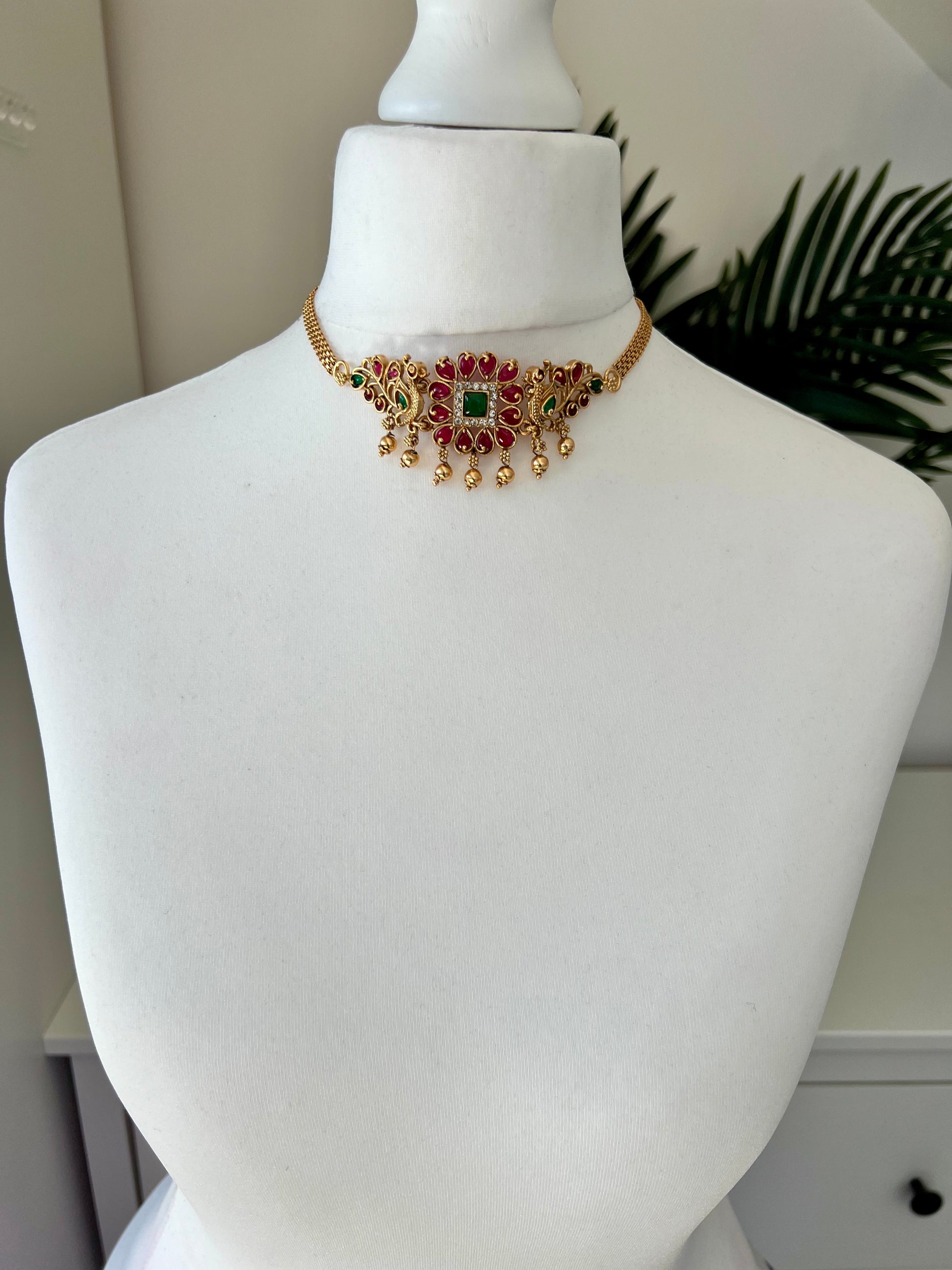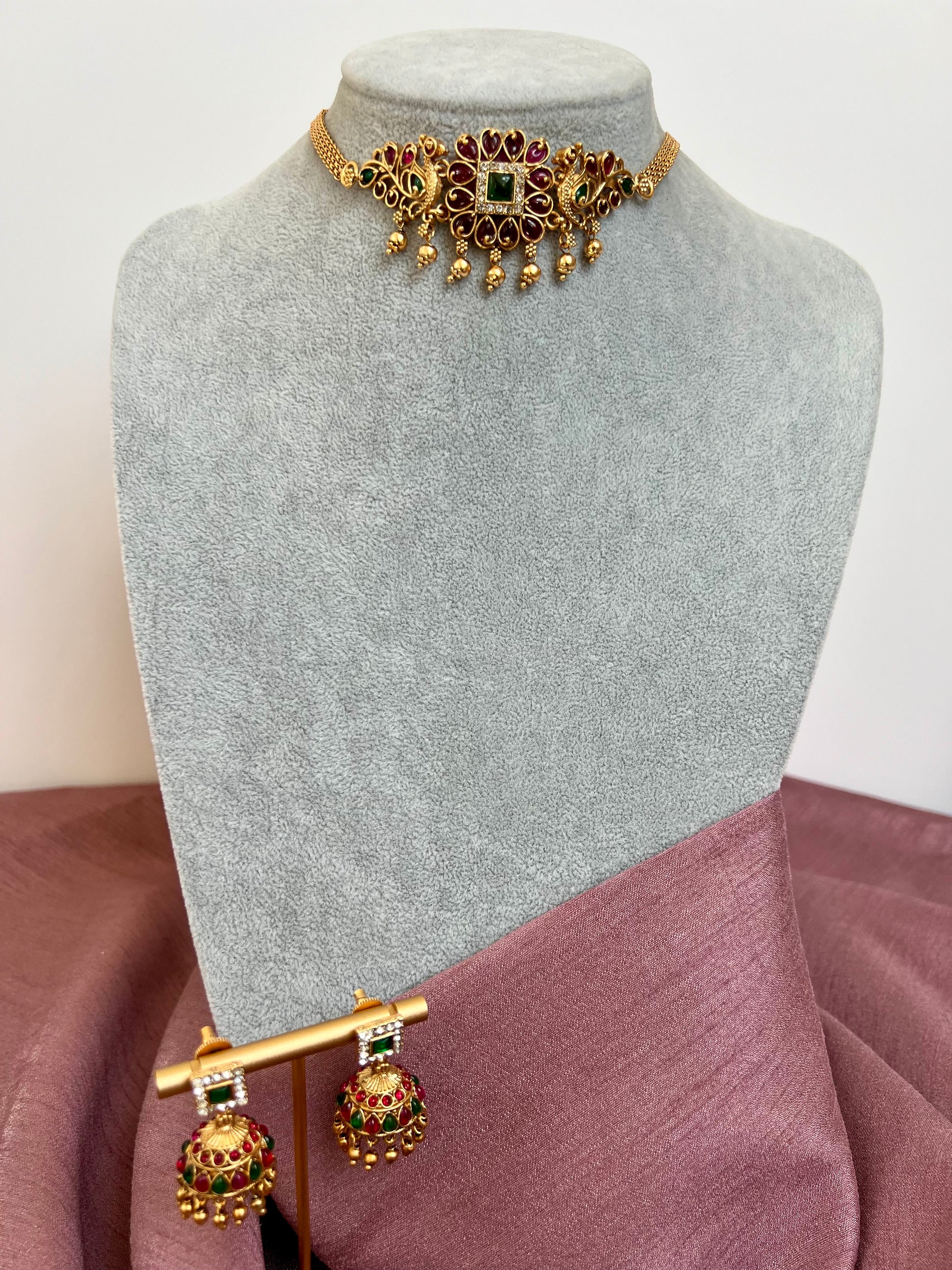 Traditional small rubygreen choker peacock motif with a large green stone in the center, comes with matching small jhumkas.
