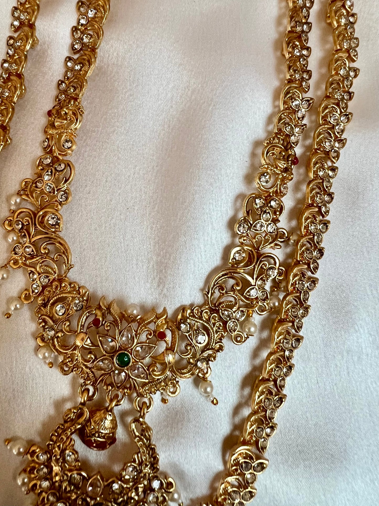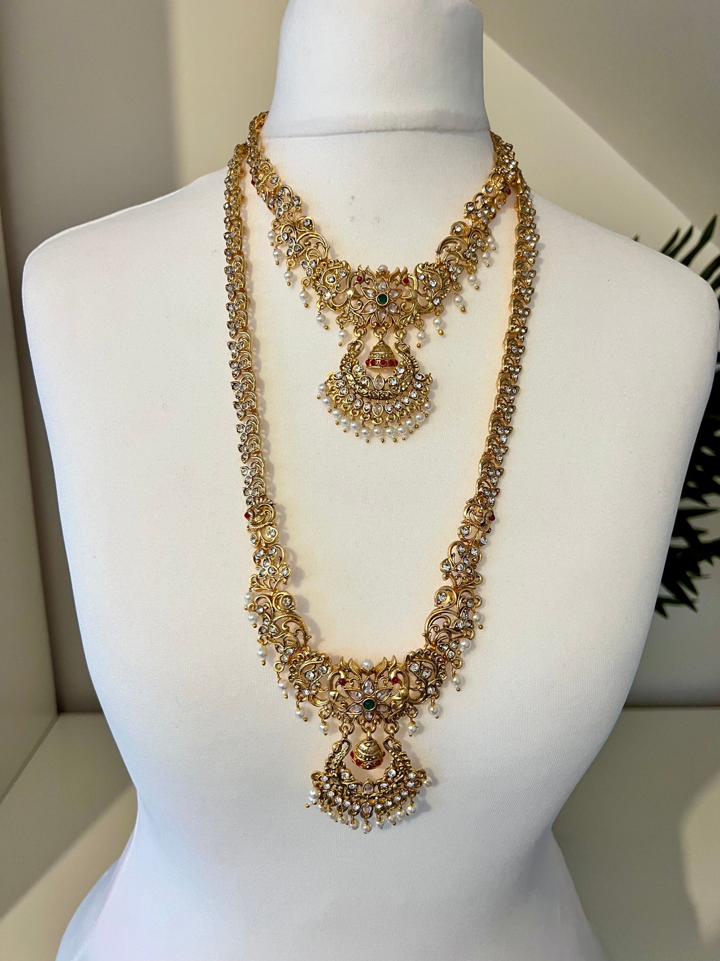 Beautiful necklace set with a long and short necklace that is embellished with white, green and ruby stones and dangling white pearls, comes with matching flat earrings.