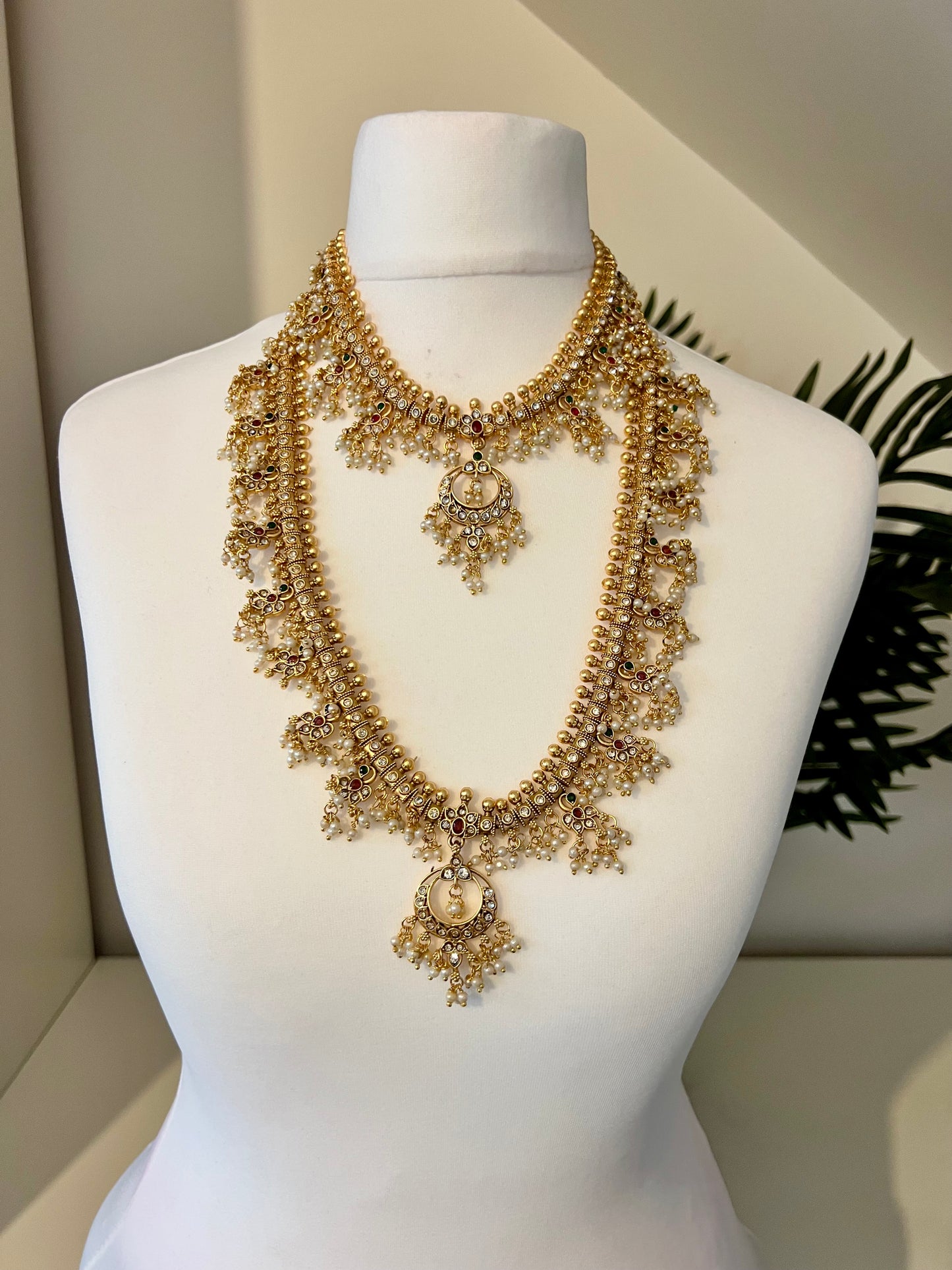 Bridal necklace set consisting of a long and short necklace thats embellished with white, green and ruby stones encased in a golden frame and dangling white pearls, comes with flat earrings and tikka.