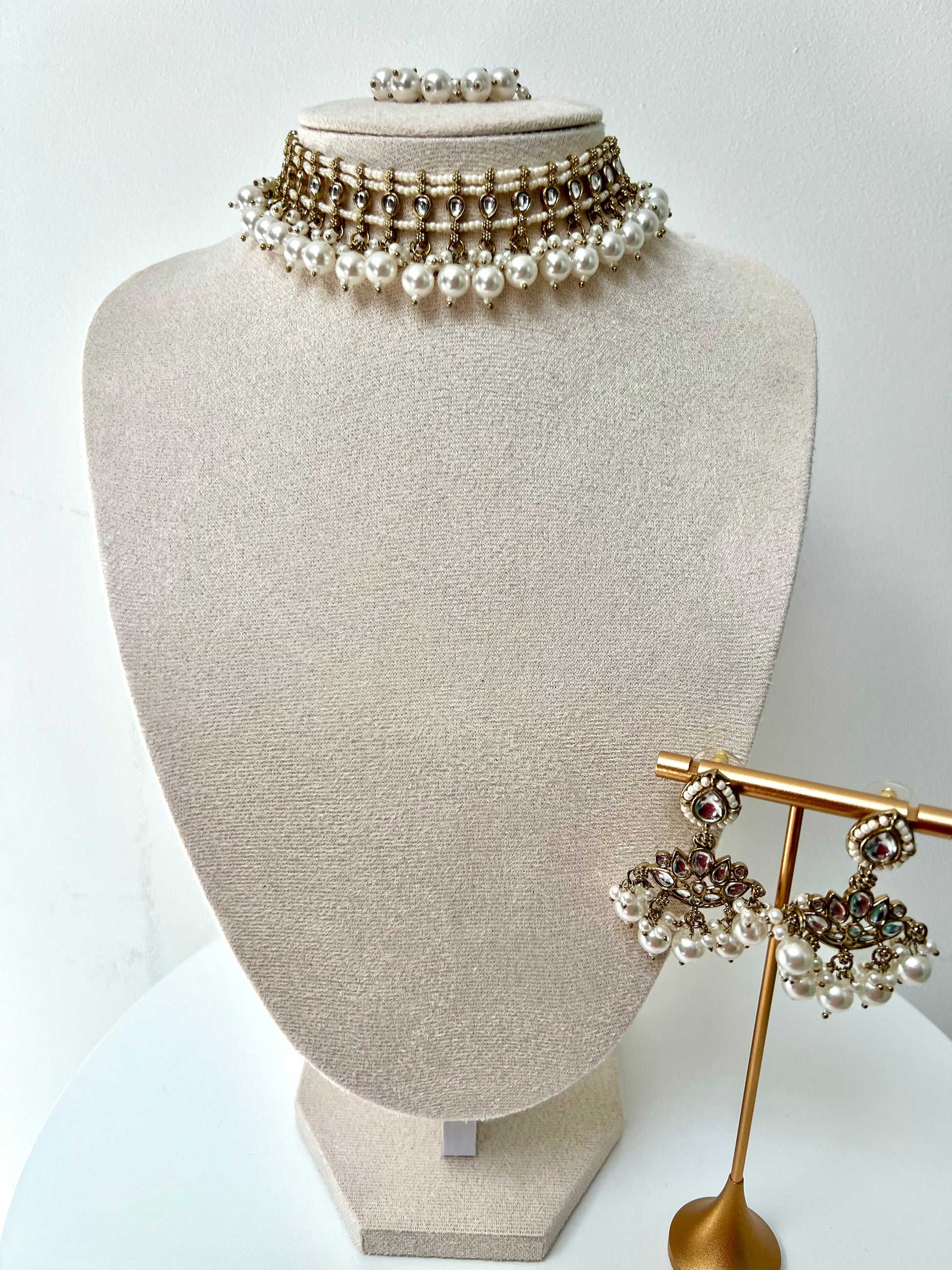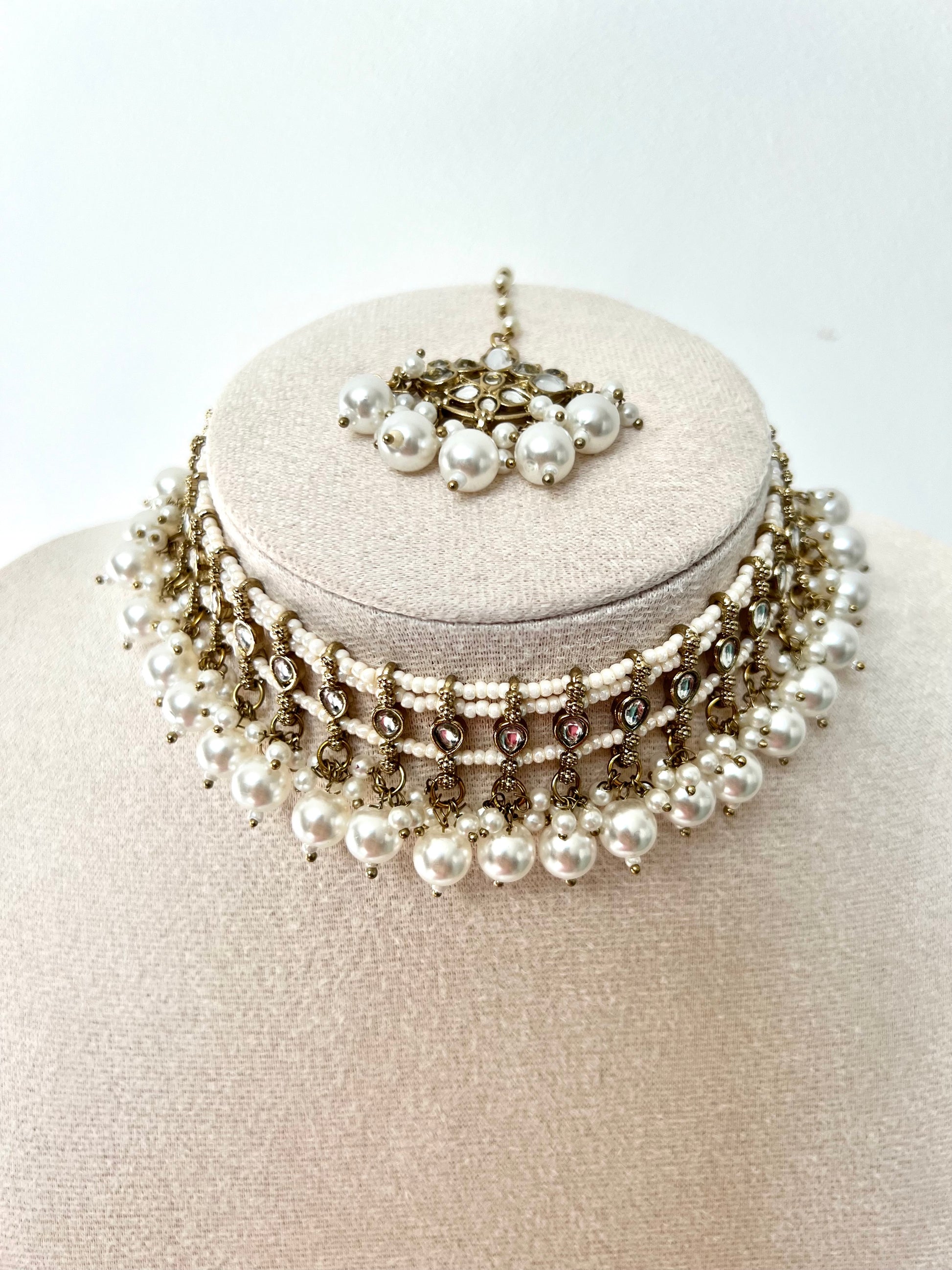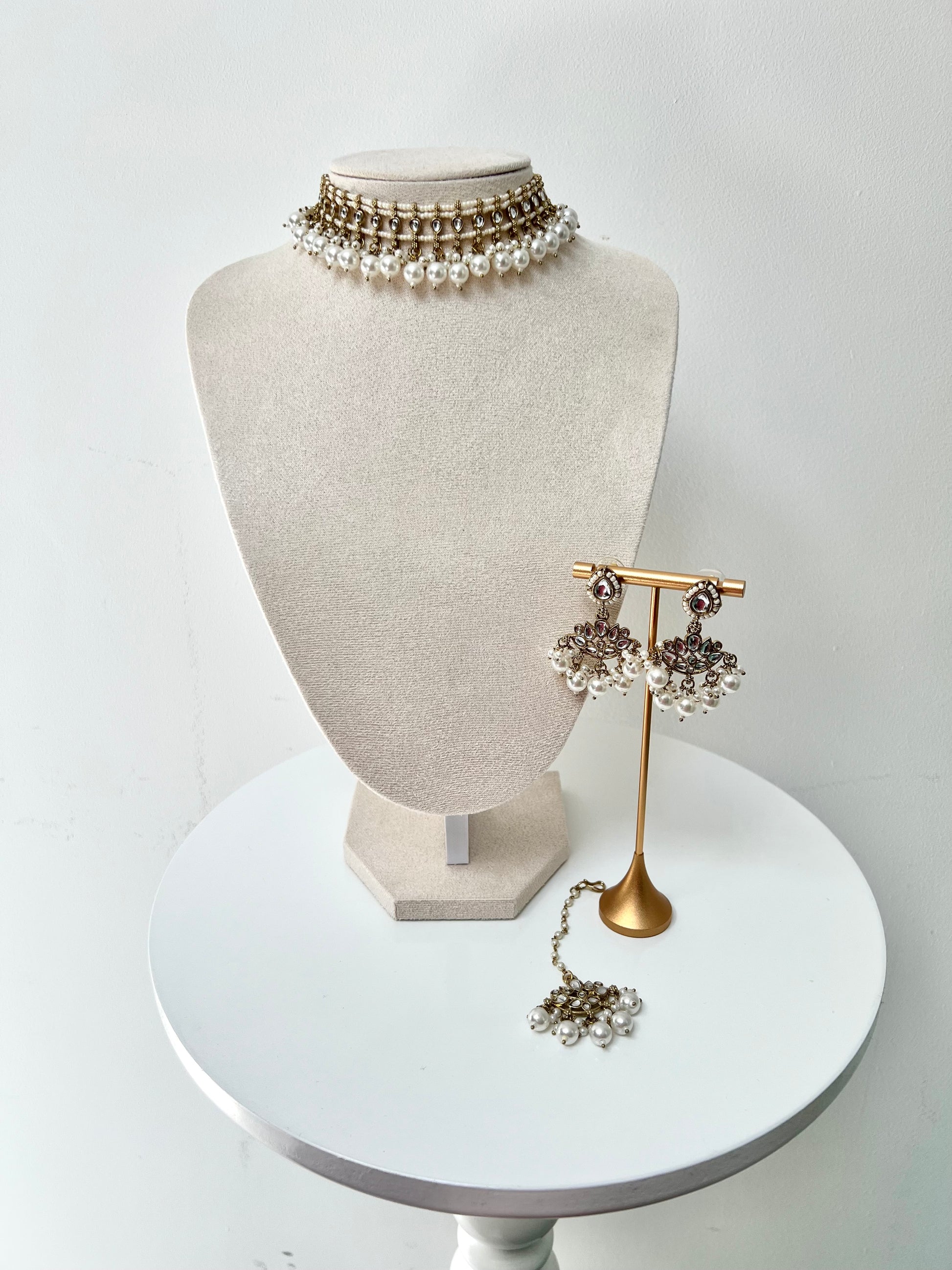 SARELA - Mehndi plated white pearl stoned high band necklace with matching jhumkas and tikka N3294