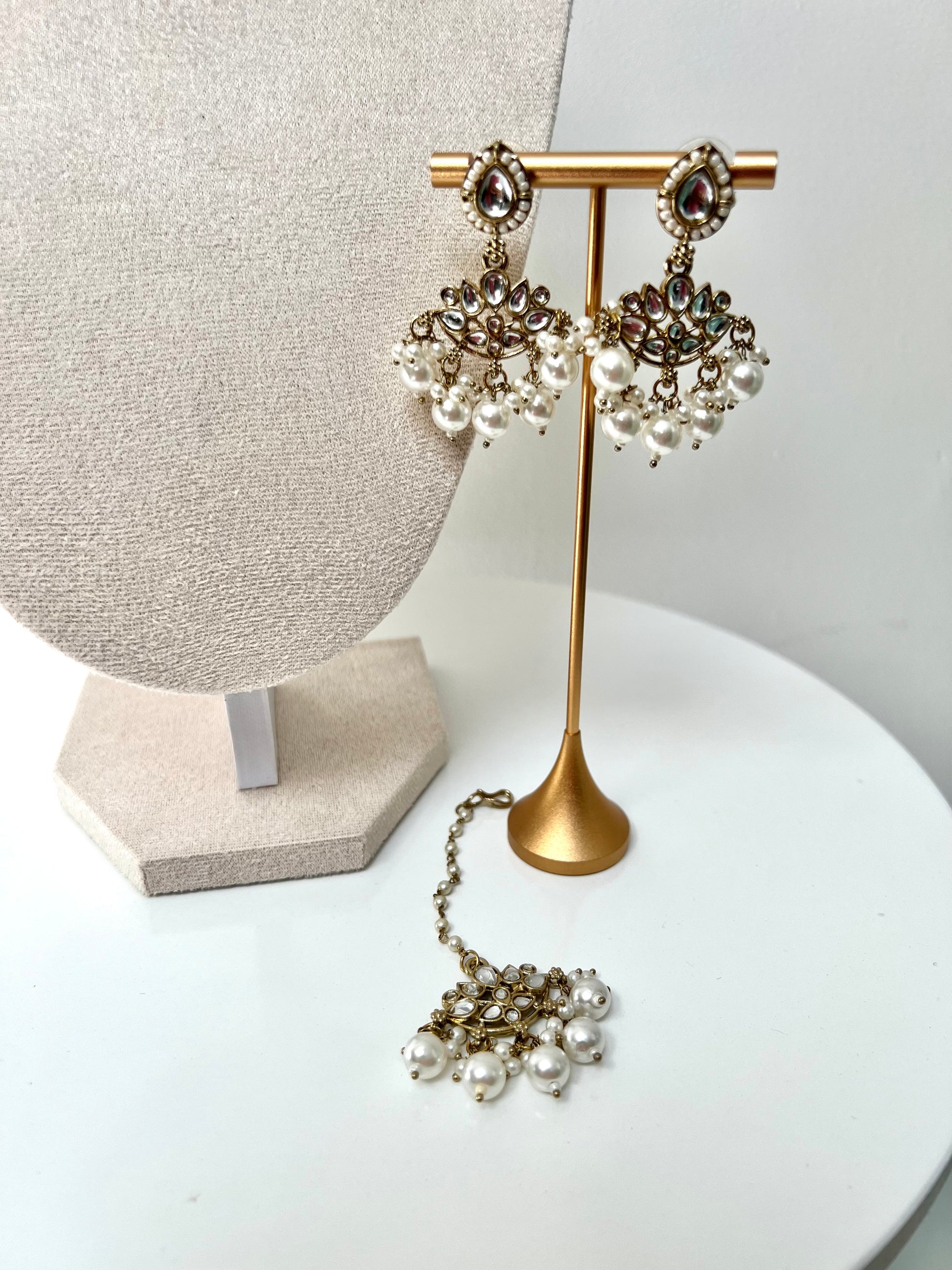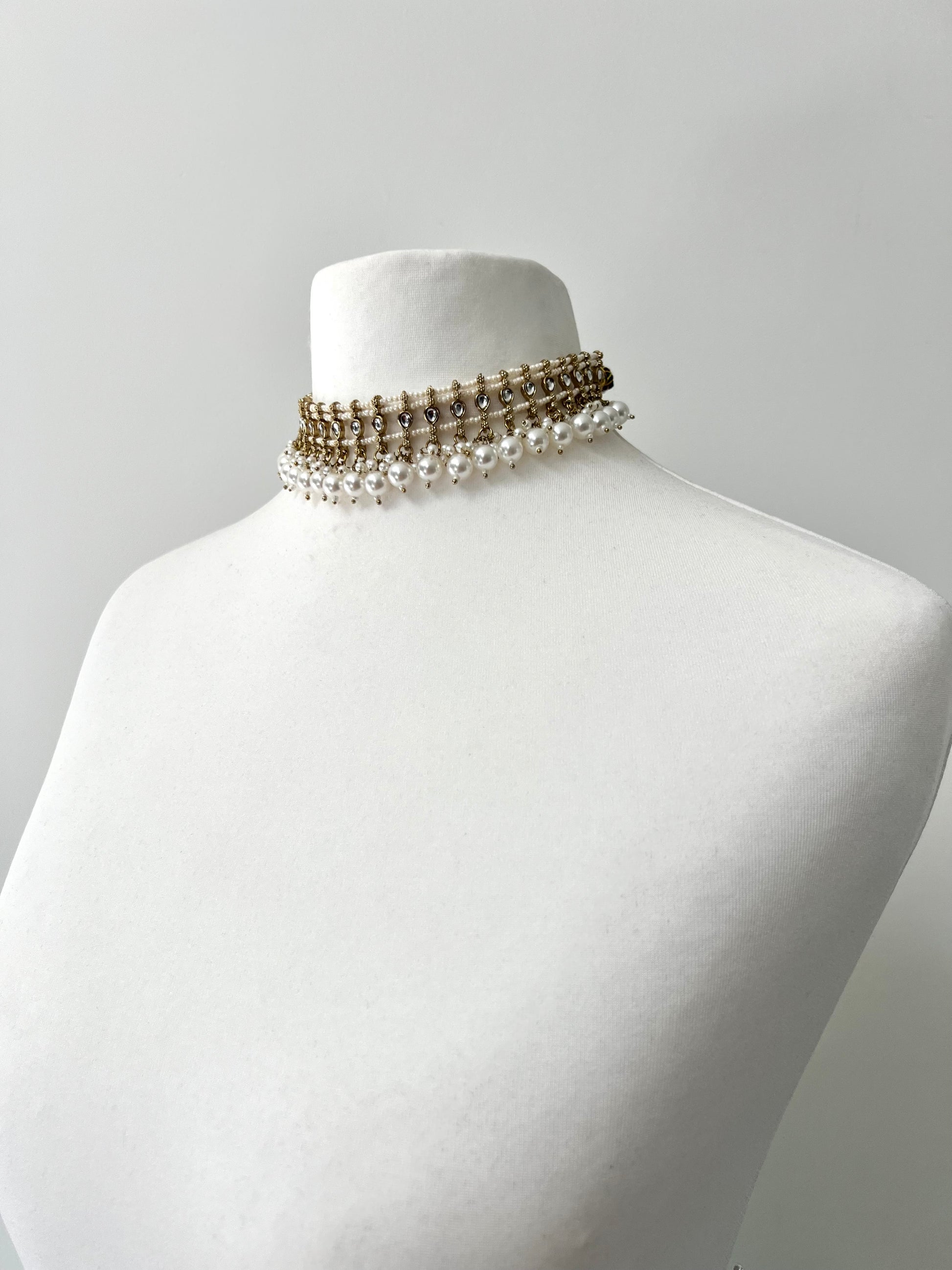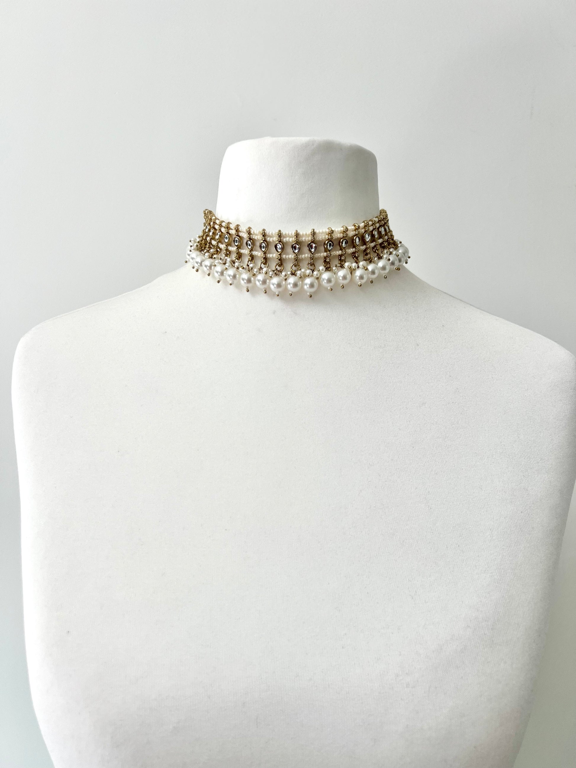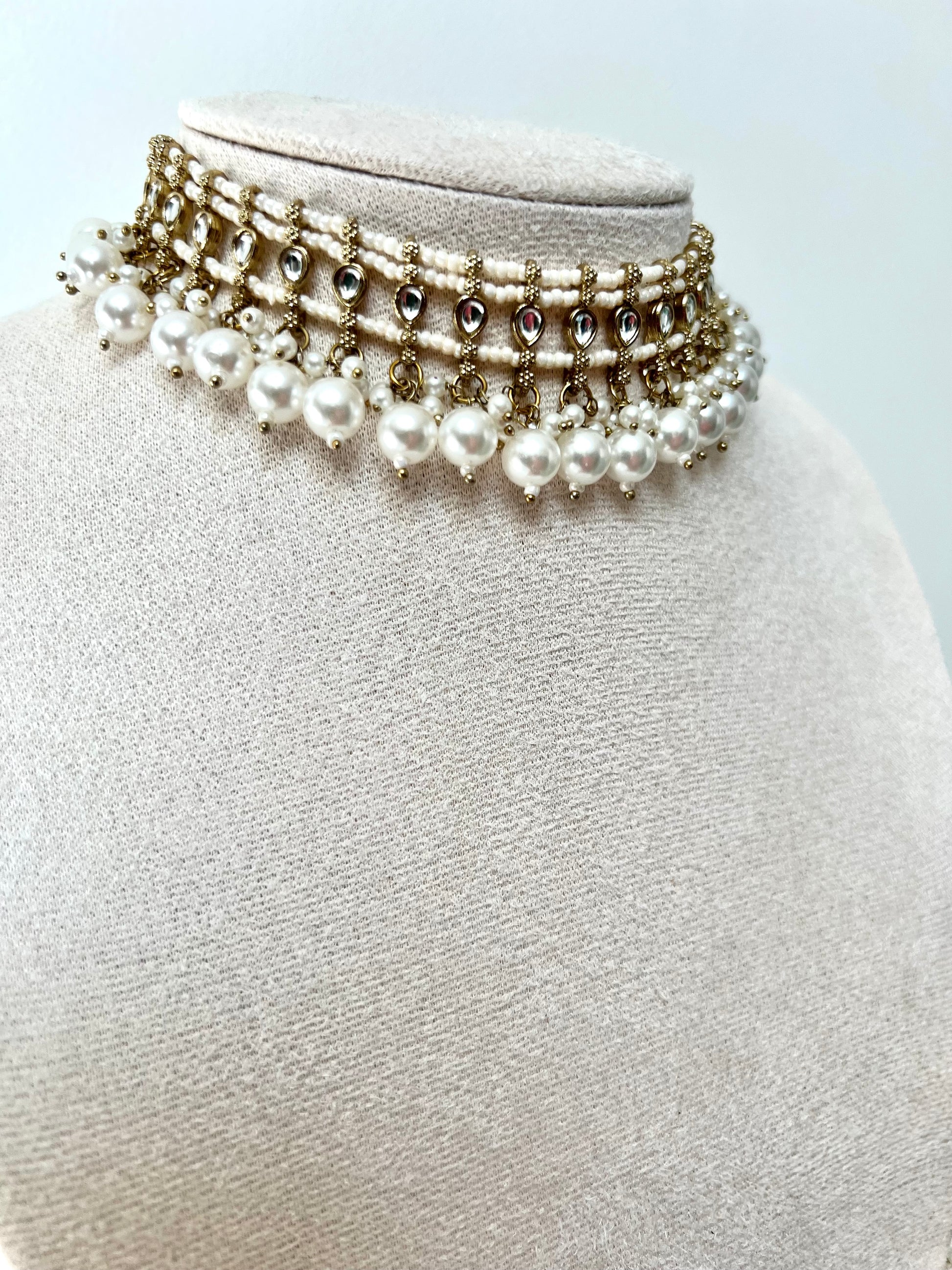 SARELA - Mehndi plated white pearl stoned high band necklace with matching jhumkas and tikka N3294