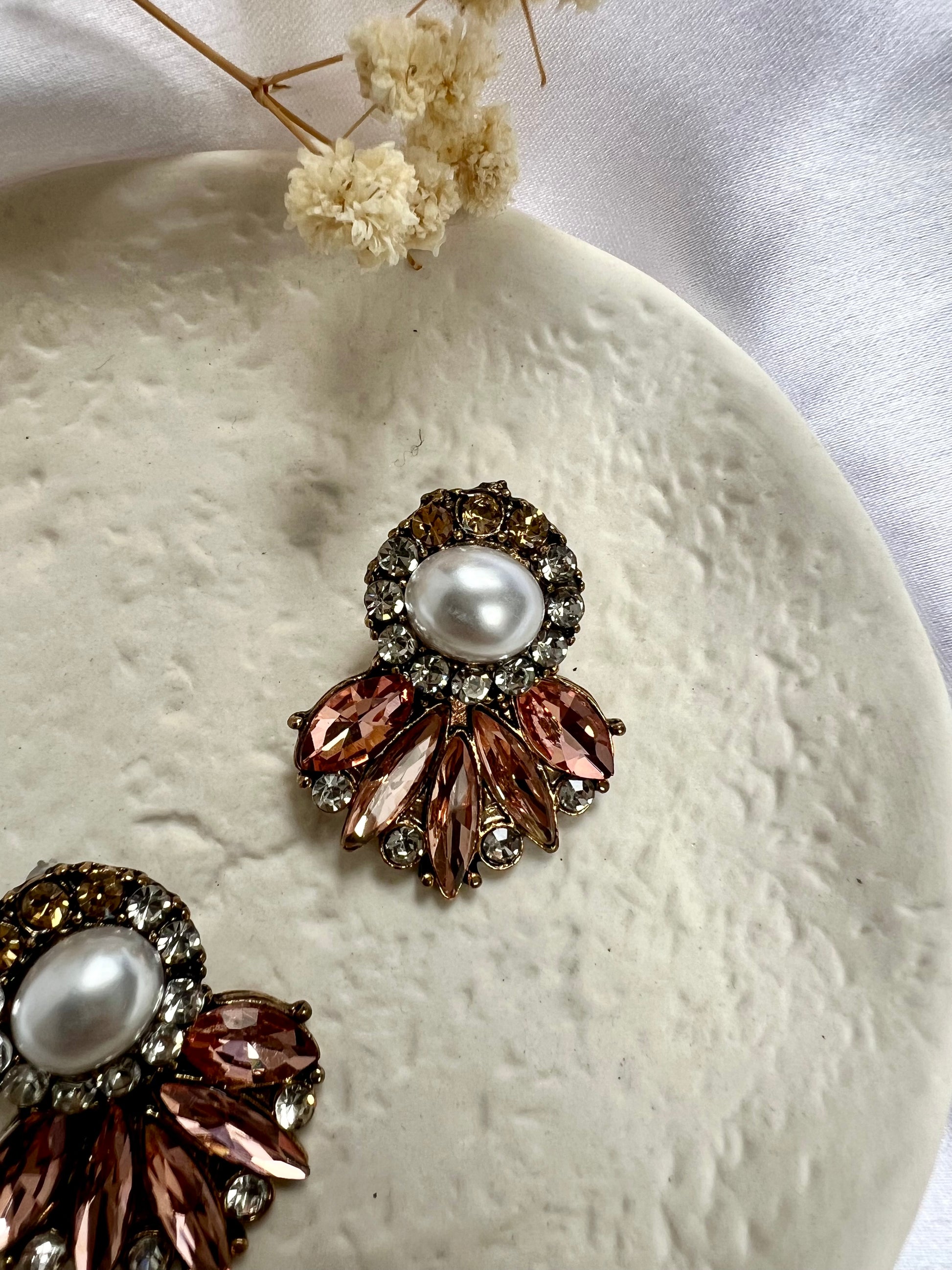 Short antique gold white, champagne and baby pink stoned earrings E3073