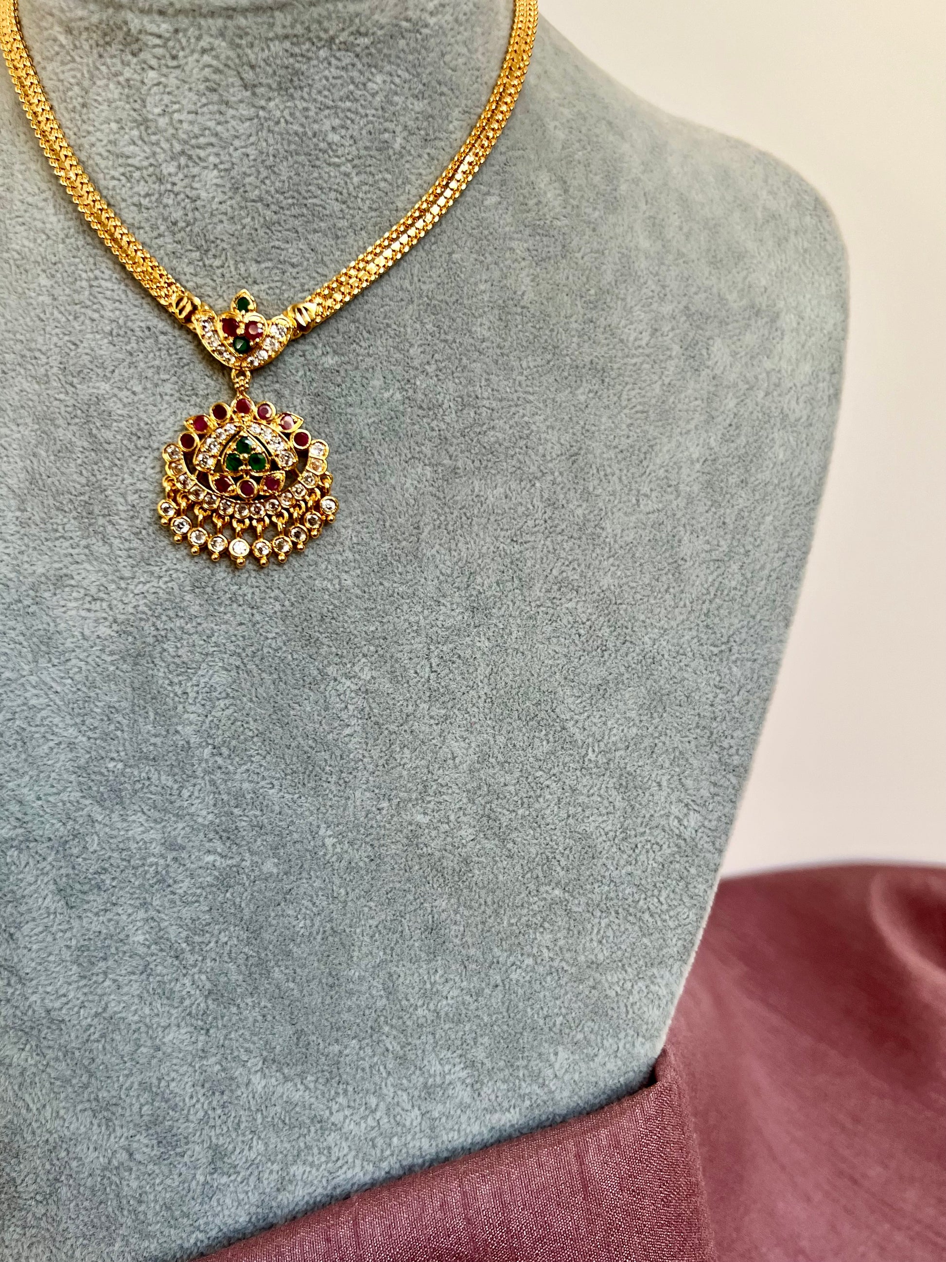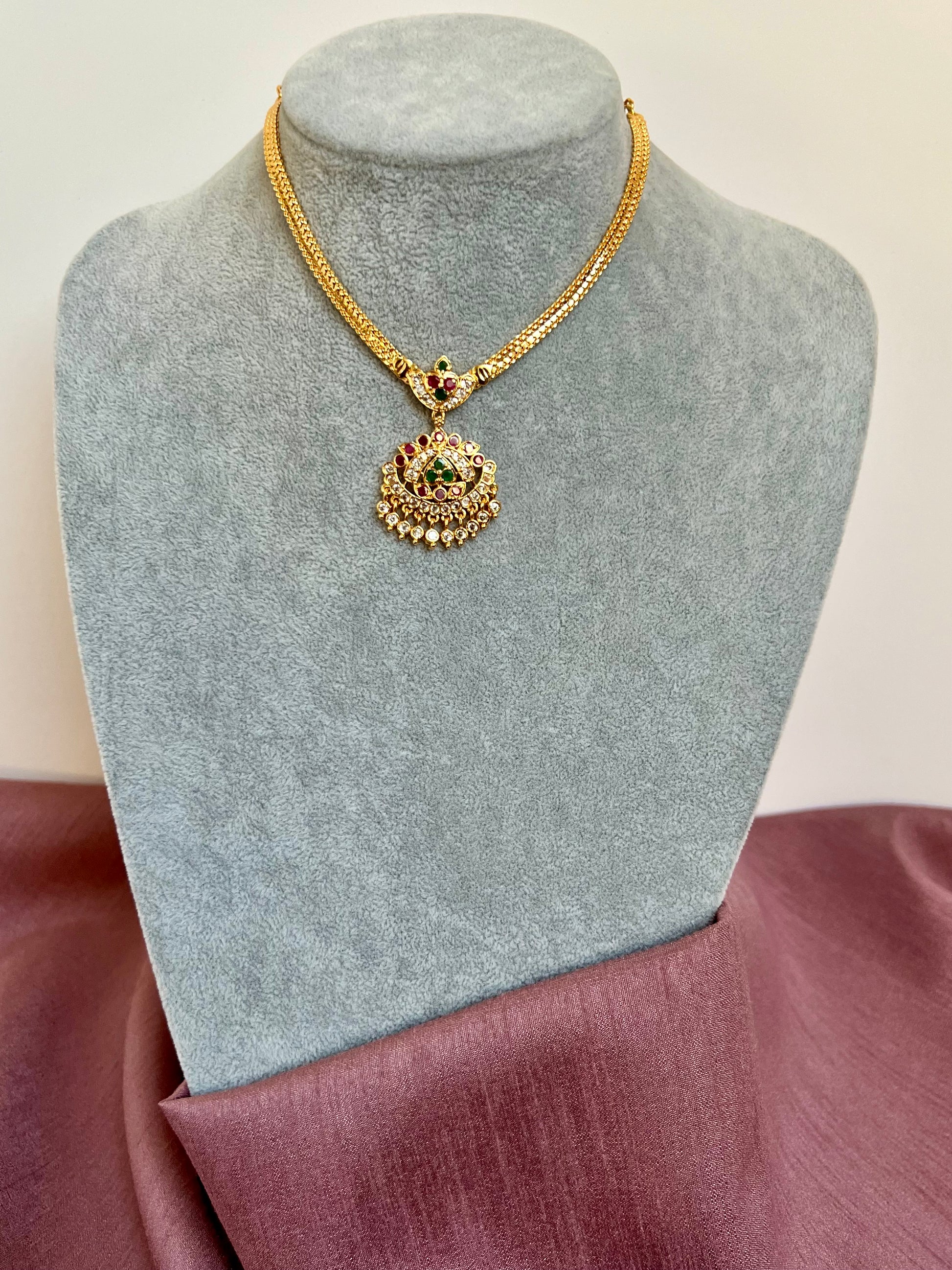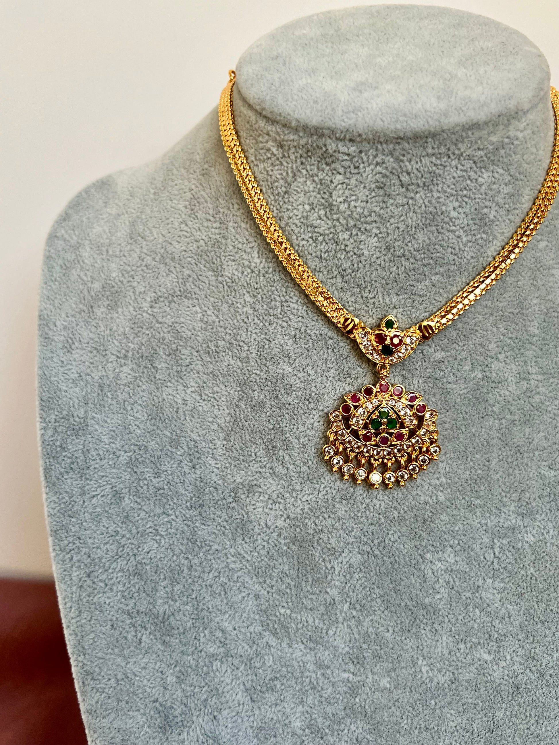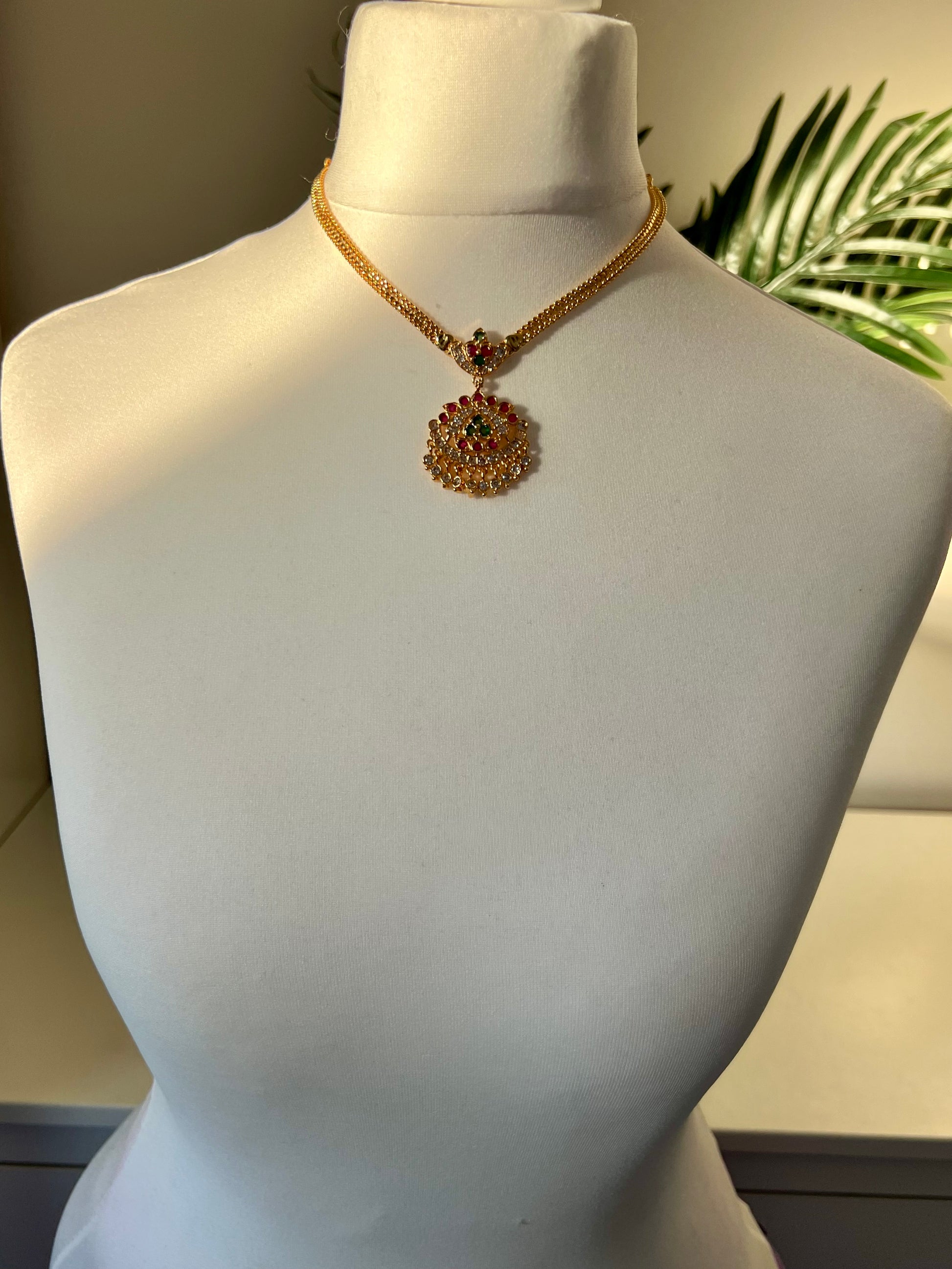 Simple short attigai necklace embellished in ruby, green and white stones.
