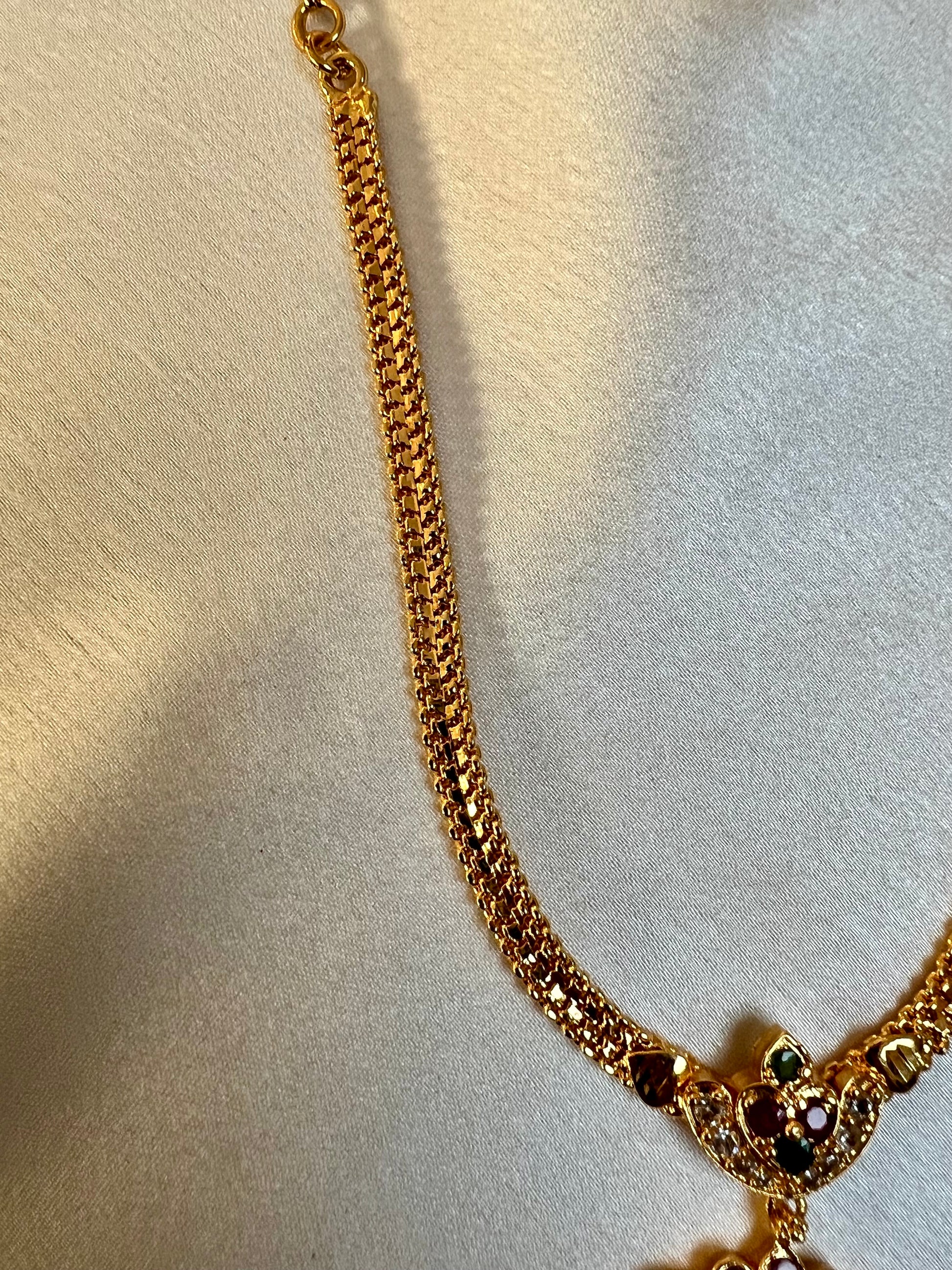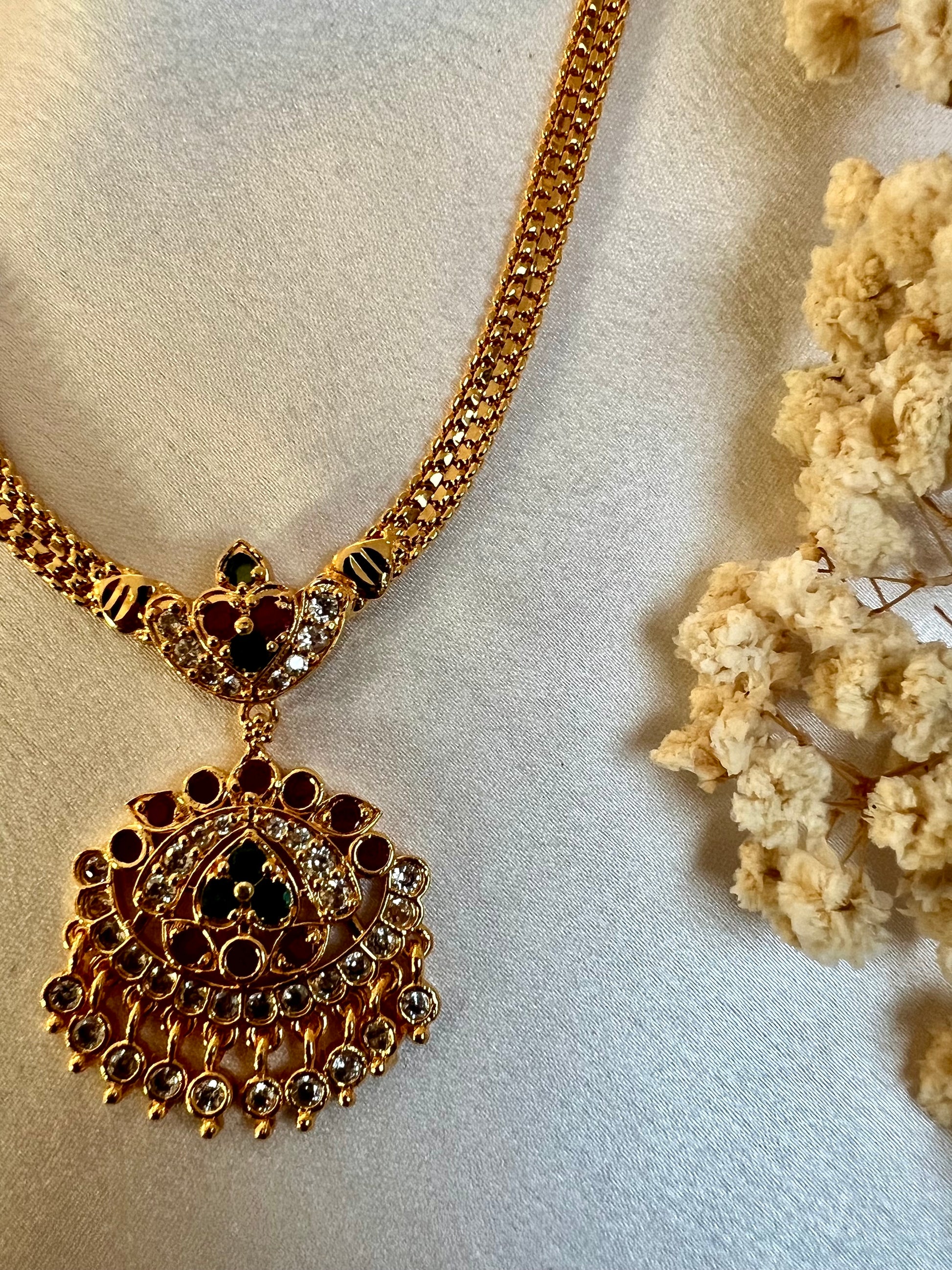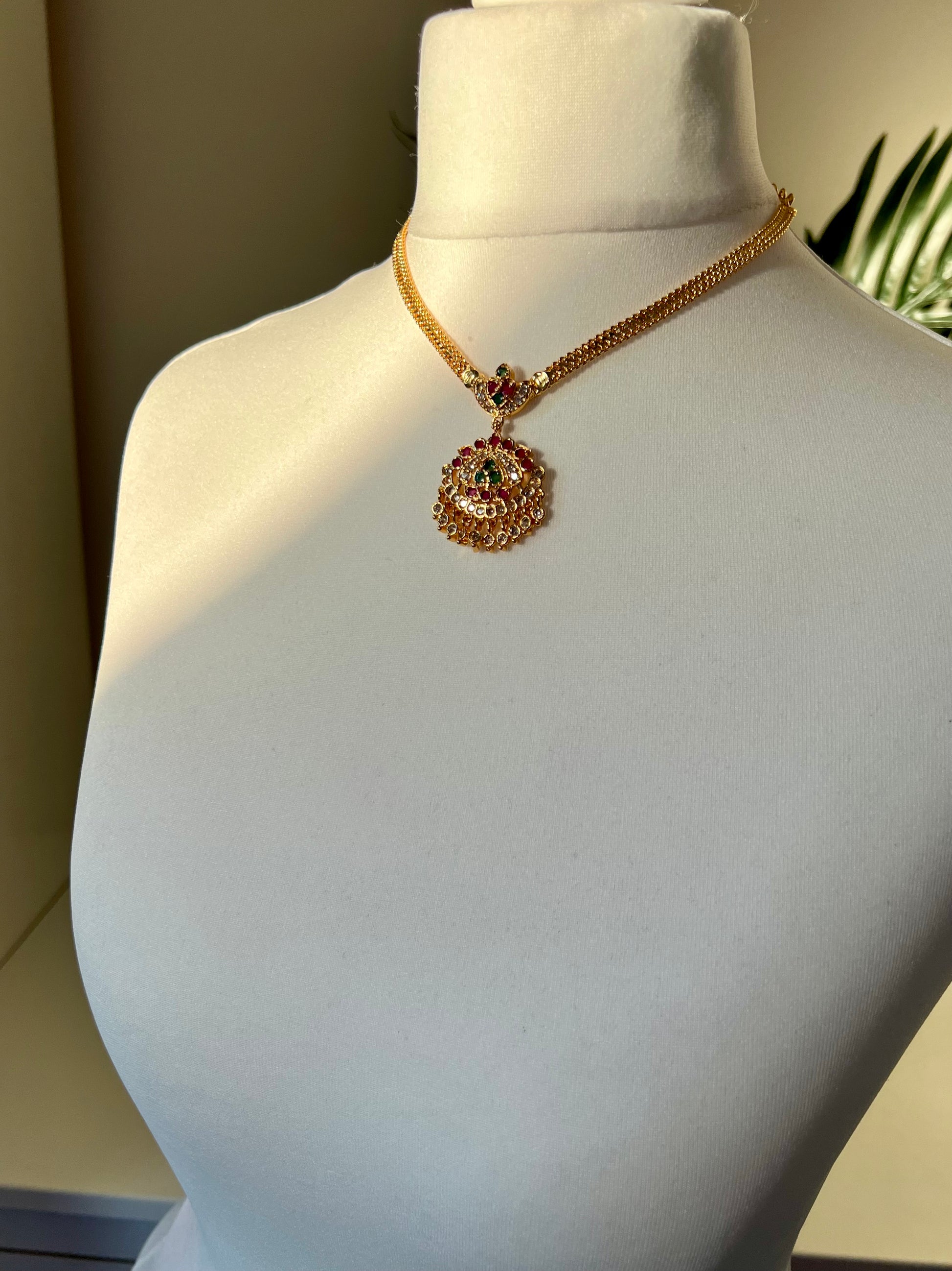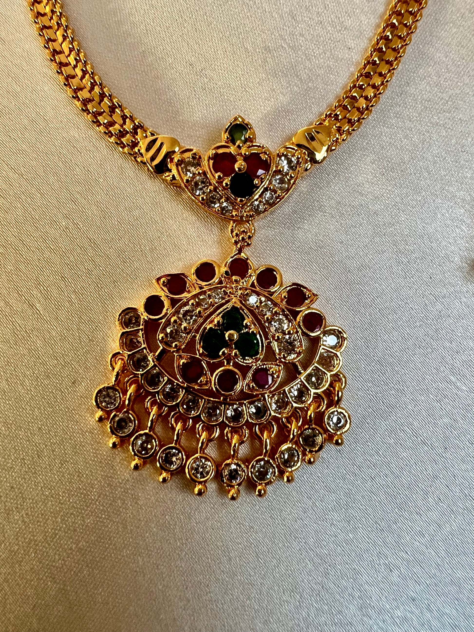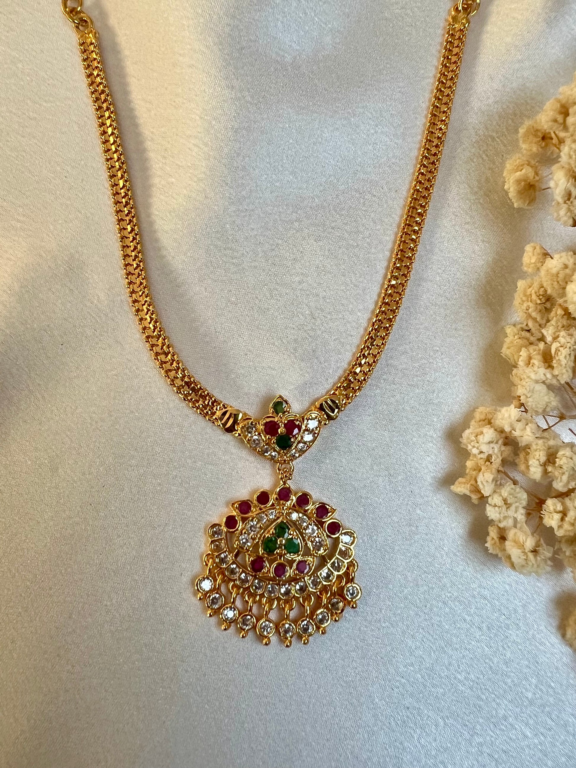 Simple short attigai necklace embellished in ruby, green and white stones.