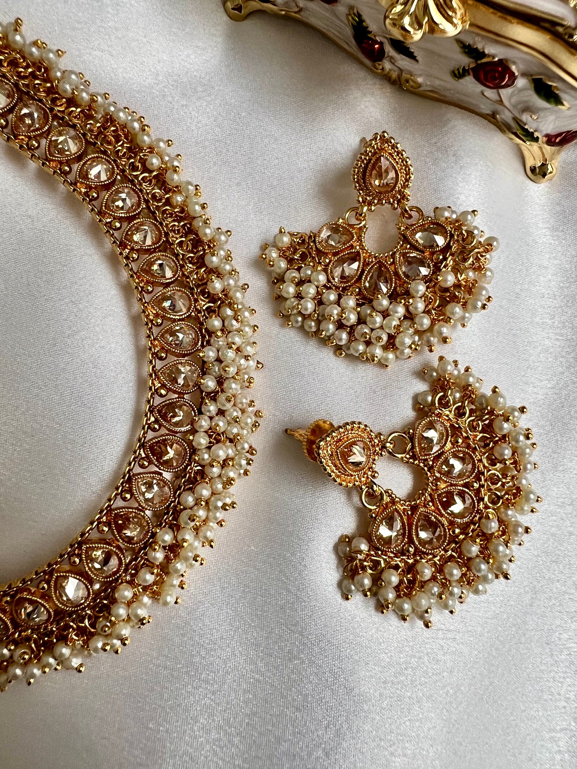 Beautiful golden base with clear delicate kundan stones and hanging ivory pearls, complement earrings included.