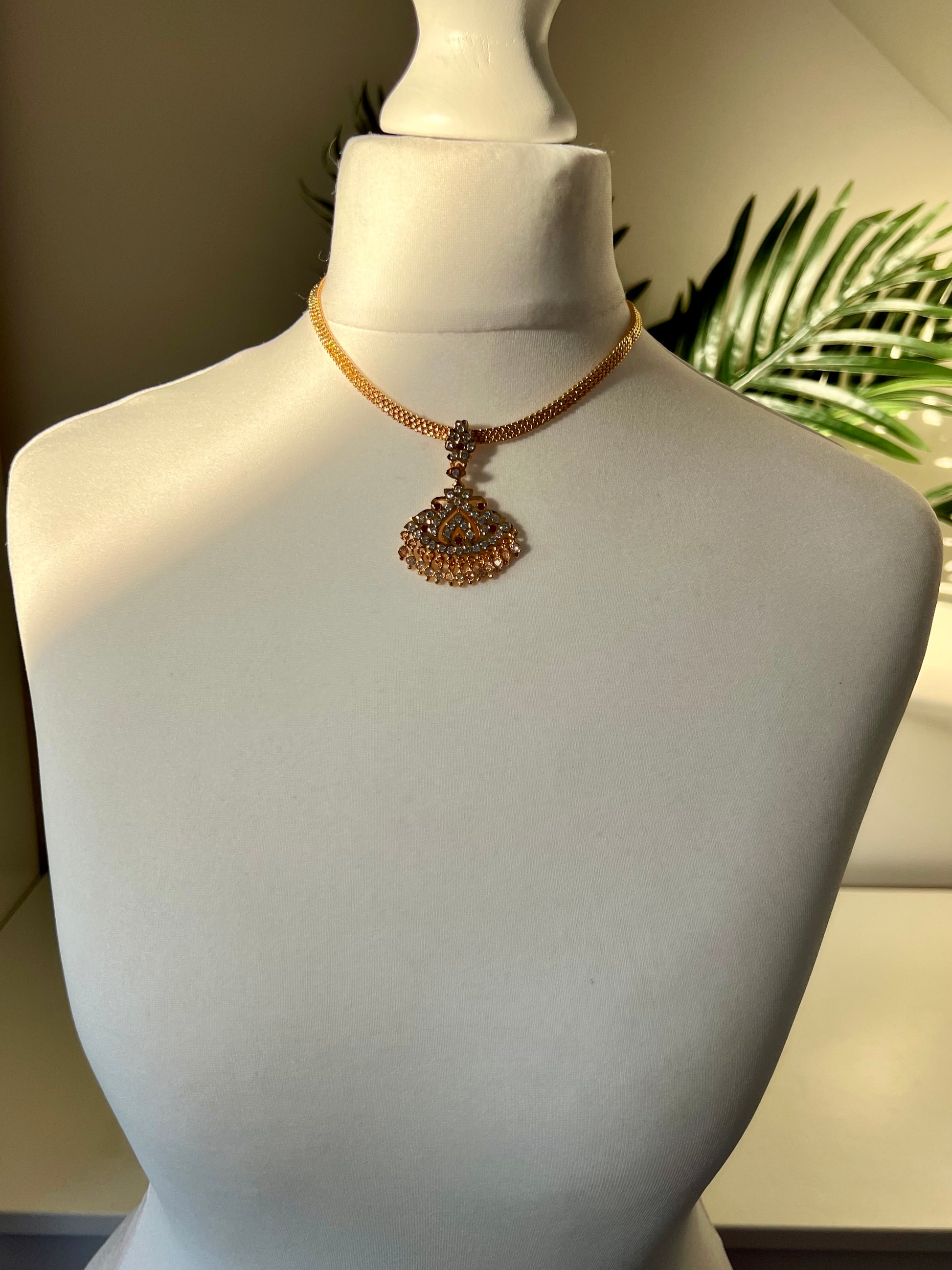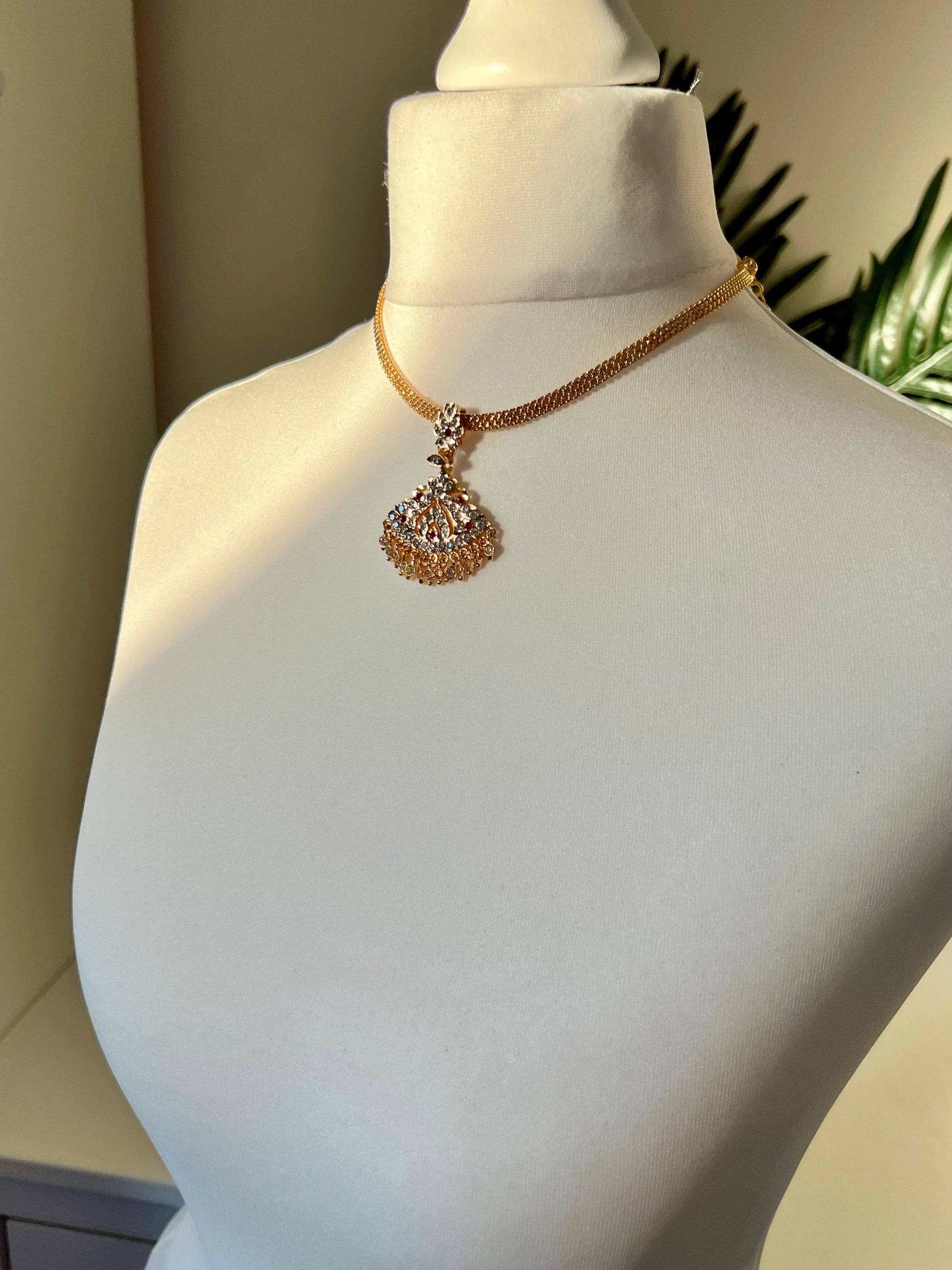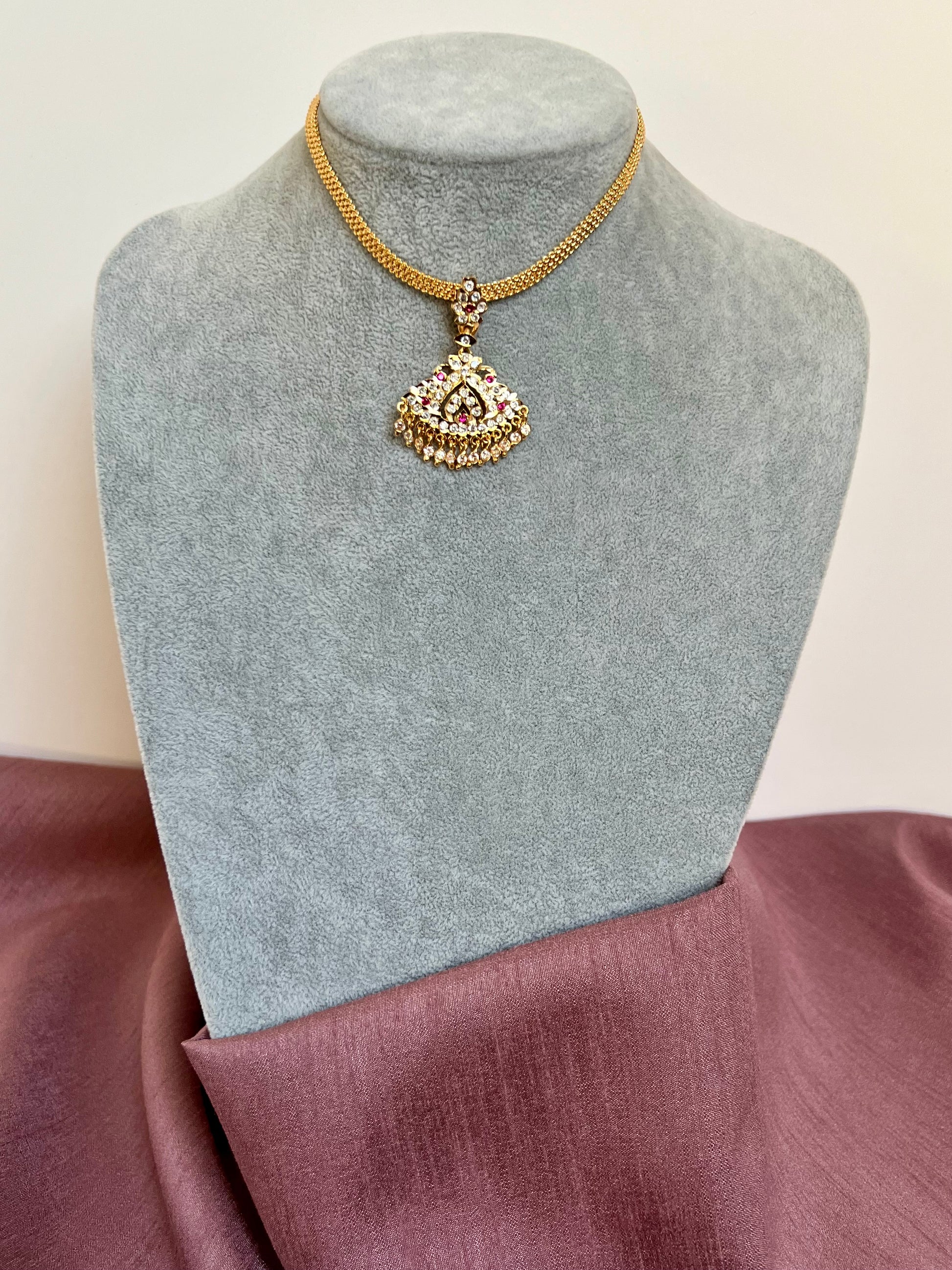 Beautiful simple short attigai impon necklace embellished with white and ruby stones.