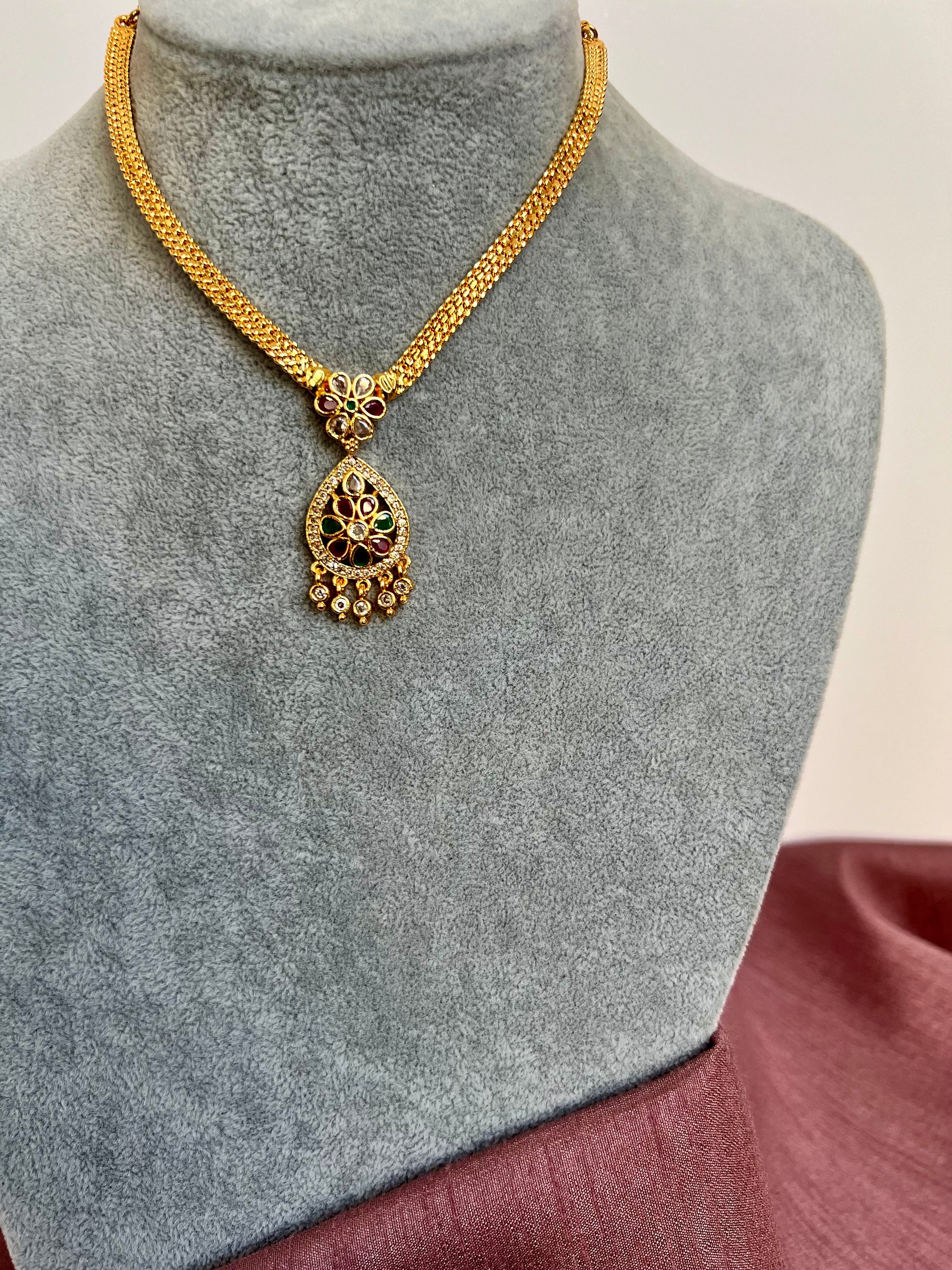 Short south Indian traditional small pendant necklace beautifully crafted and embellished with white, ruby and green stones.