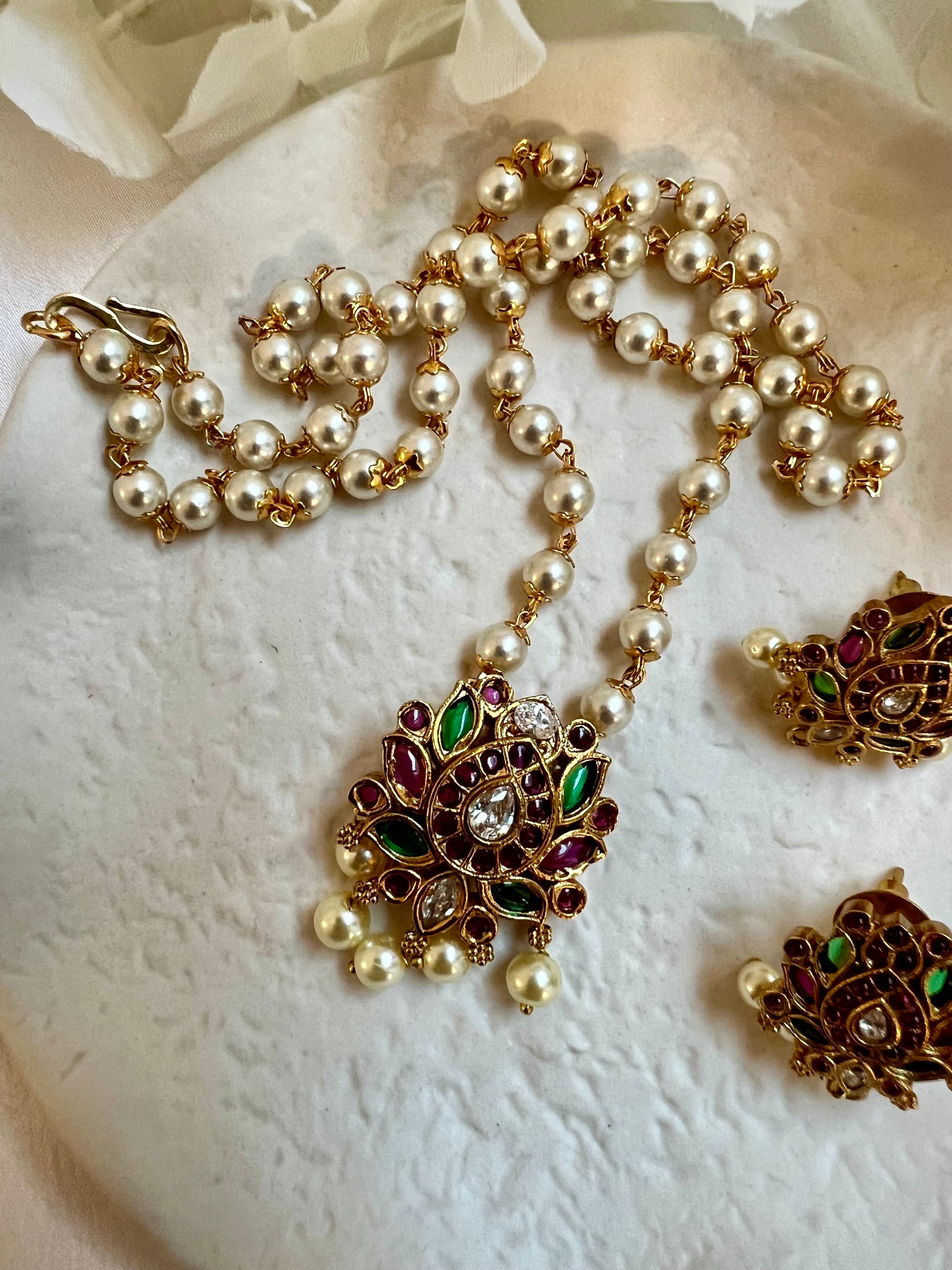 AVEENA - Short pearl lotus necklace in rubygreen with matching earrings N3015