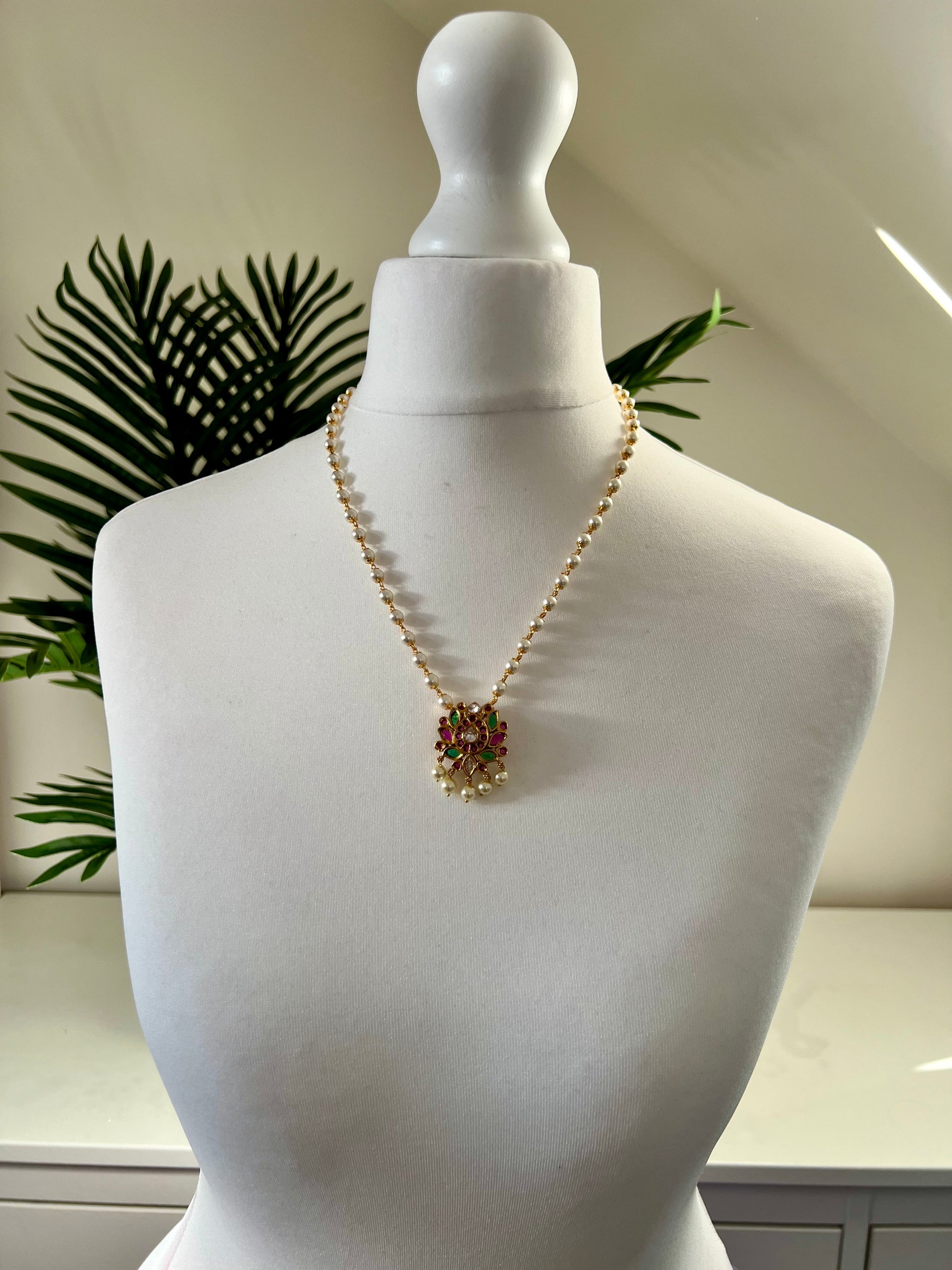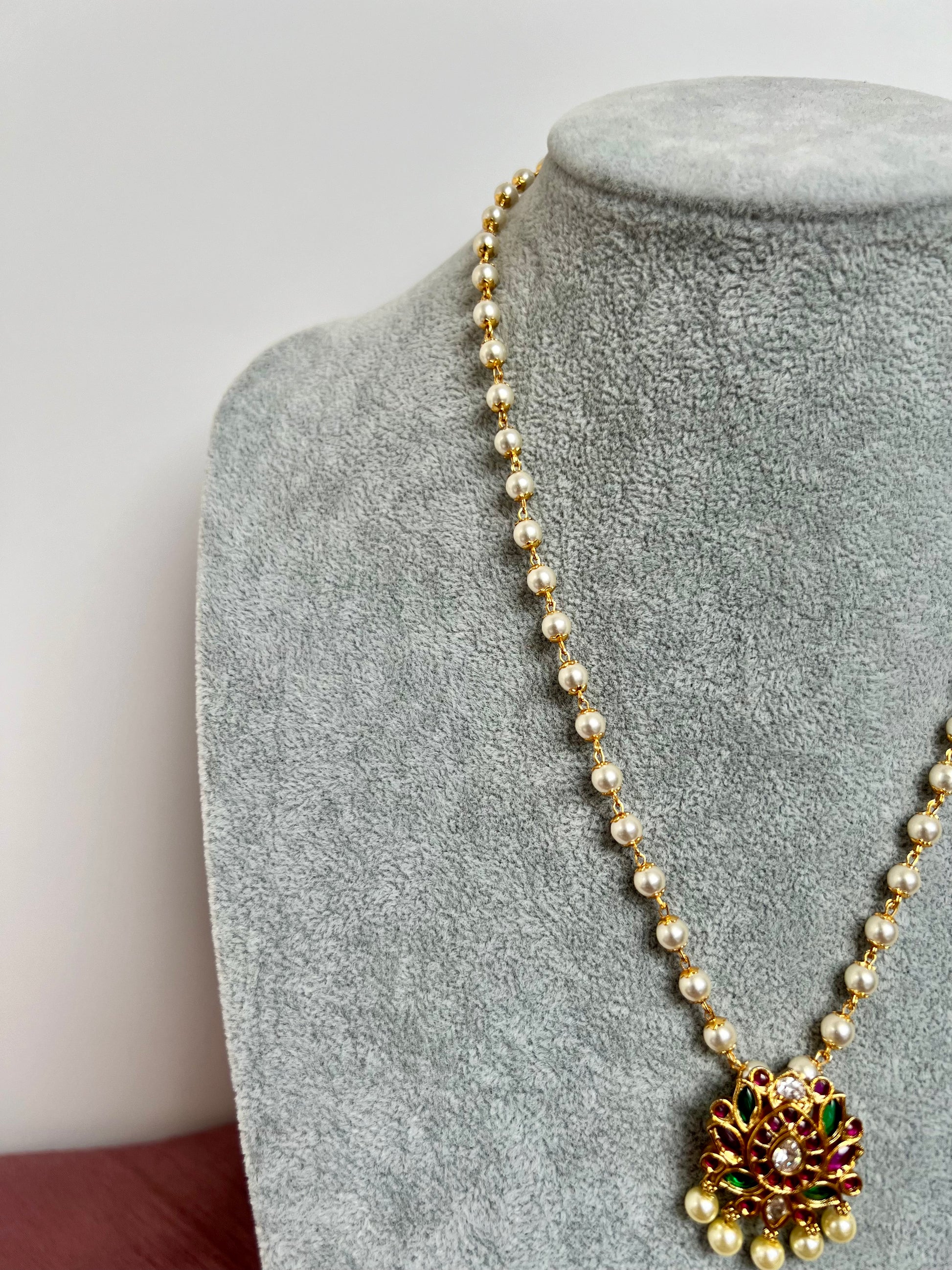 Short gold necklace with a pearl chain and a lotus flower pendant that is embellished with purple and green stones. Includes two small lotus flower stud earrings with dangling pearls.