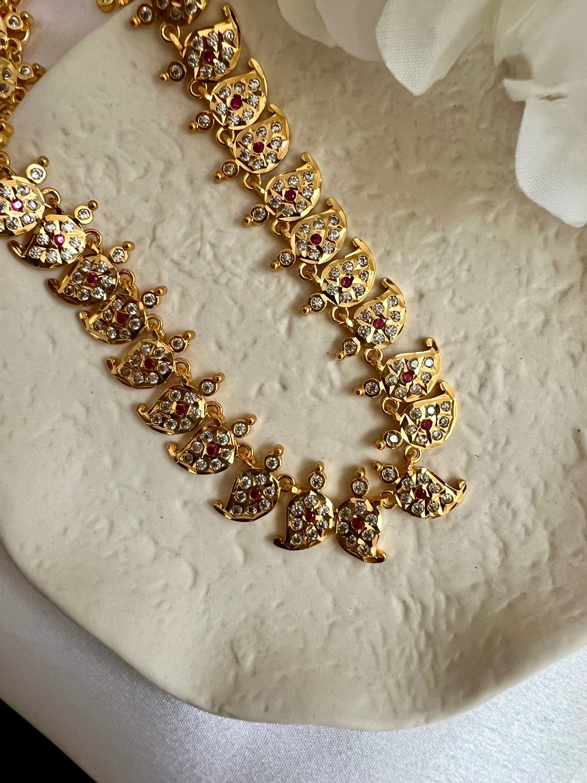 A traditional mango shaped impon chain made of ruby and white stones, perfect to wear on its own or layer it up with our other impon jewelleries.