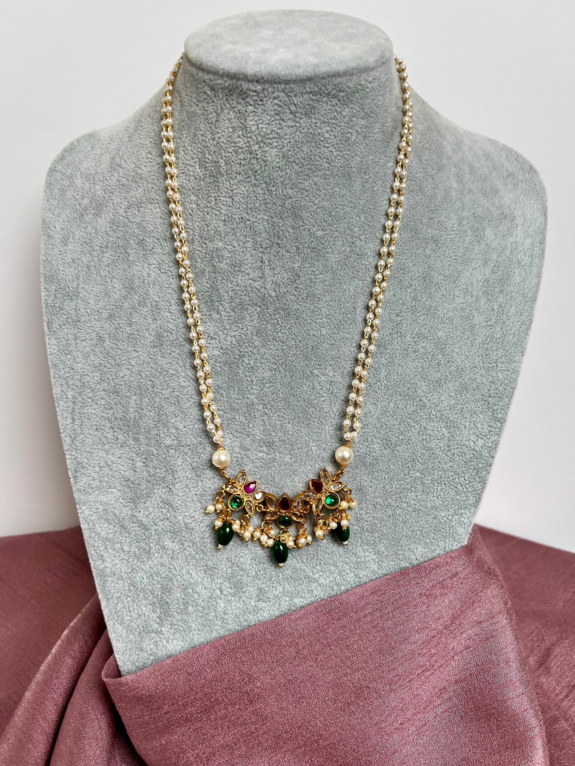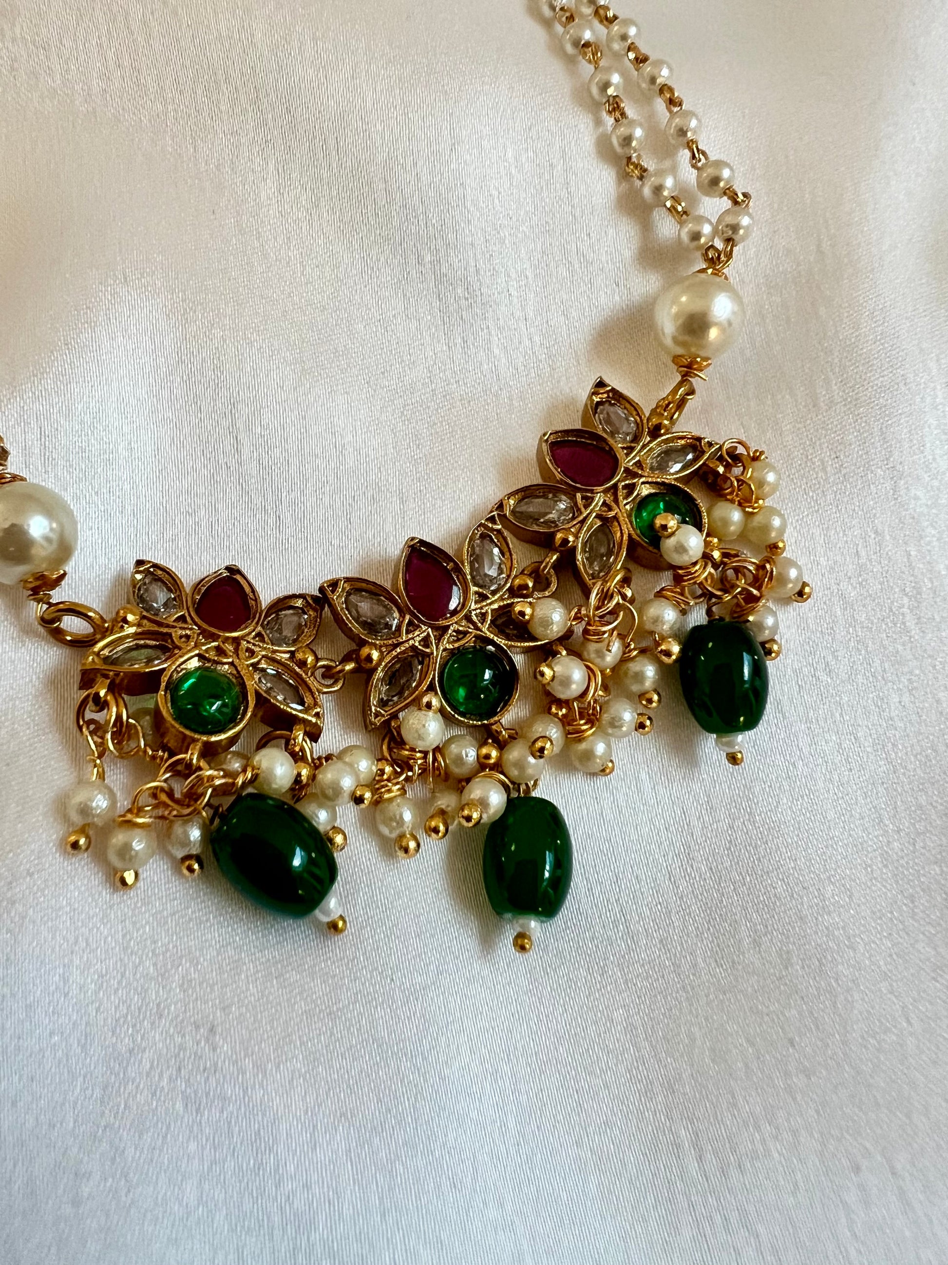 A simple short chain necklace with beaded pearls, with a beautiful triple lotus pendant encased in a golden base and embellished in rubygreen stones, small dangling white pearls and green beads.