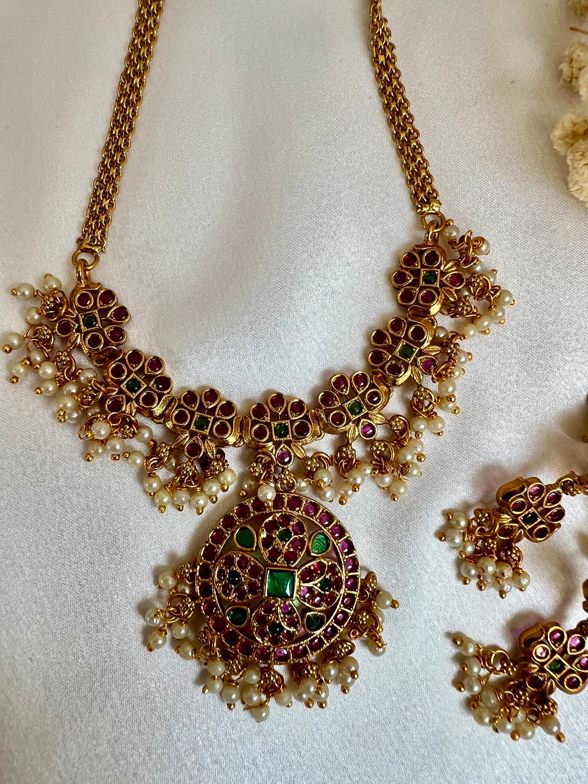 A beautiful short necklace set embellished with rubygreen stones and dangling pearls, comes with matching flat earrings.