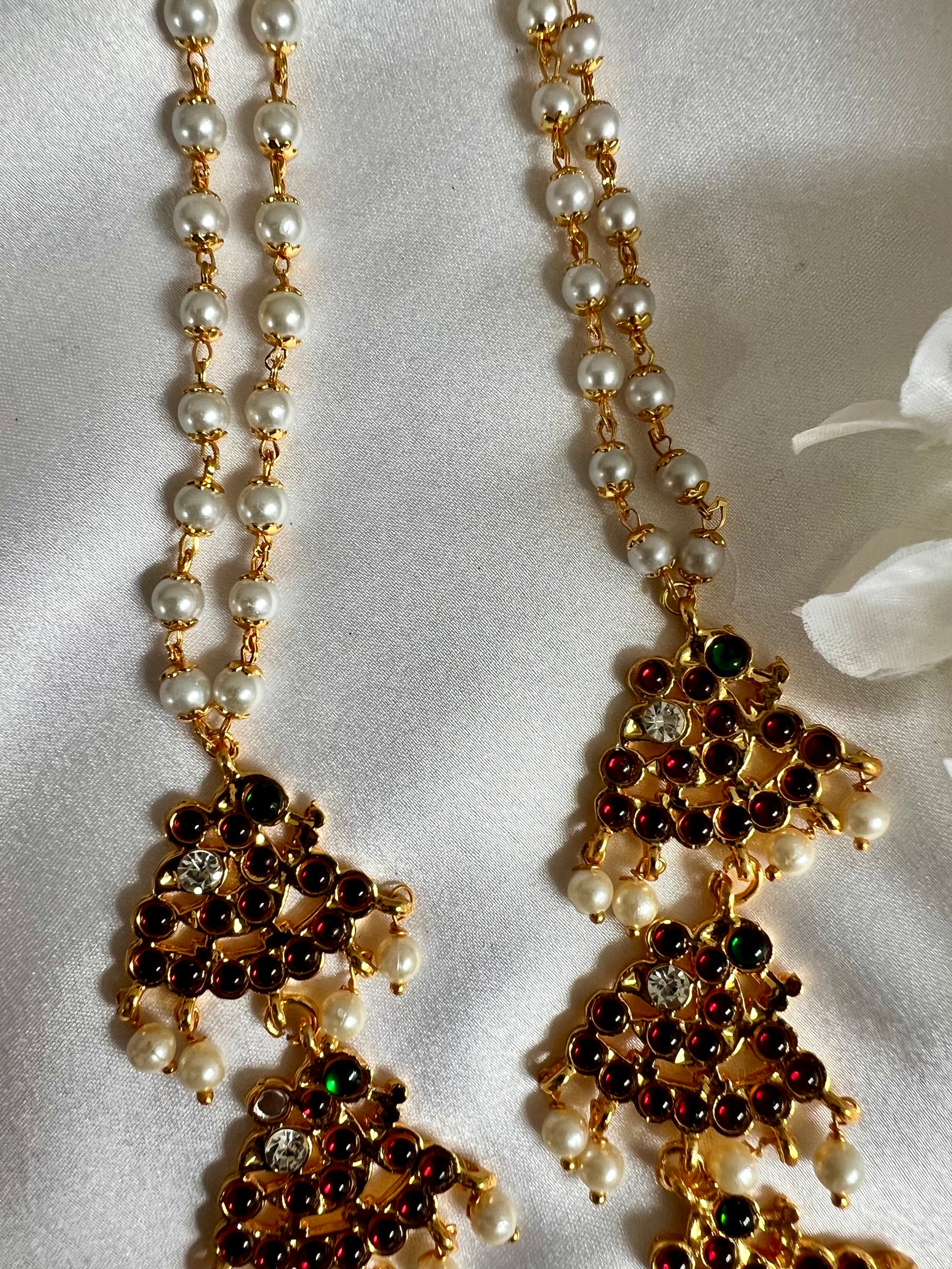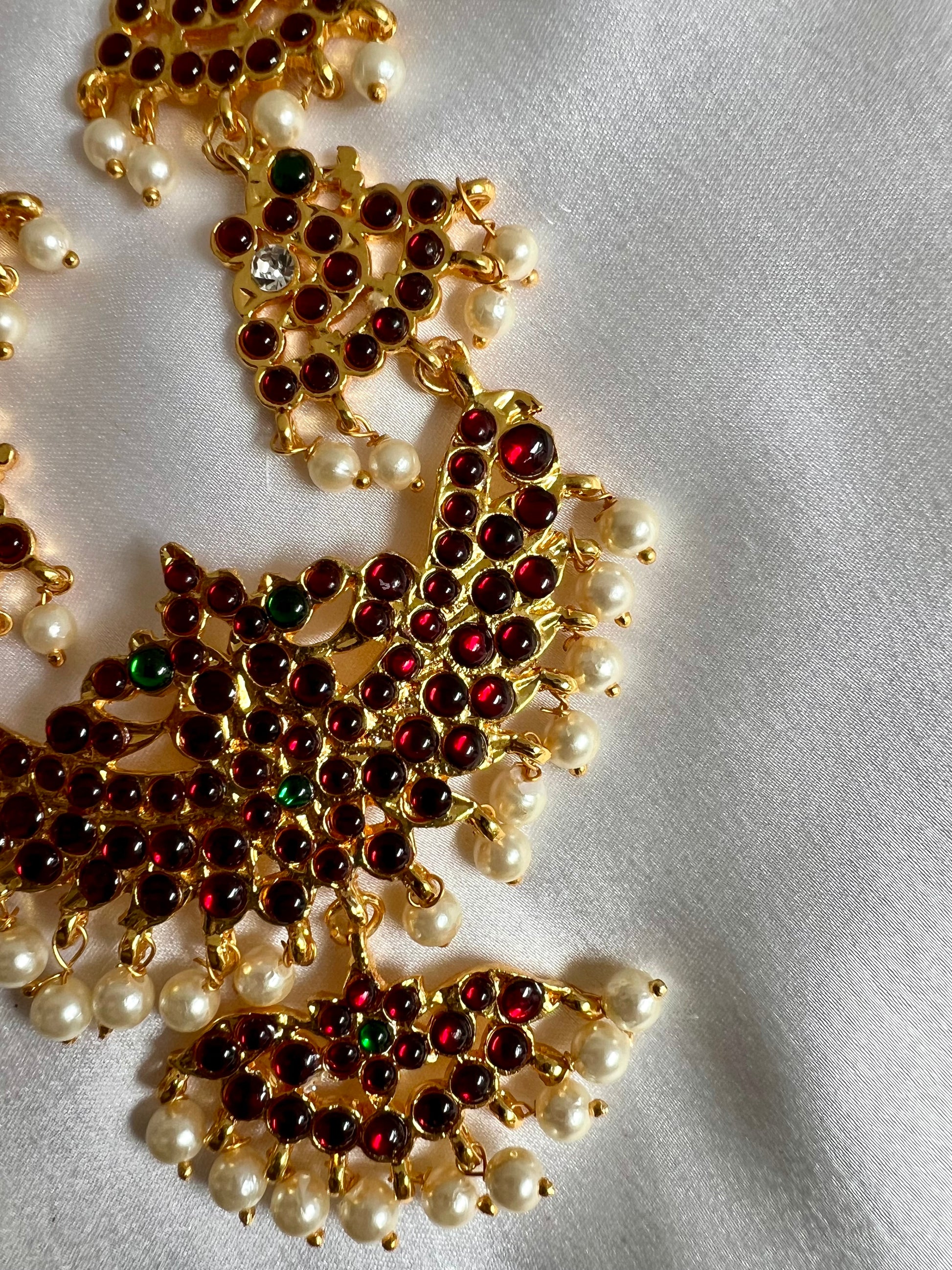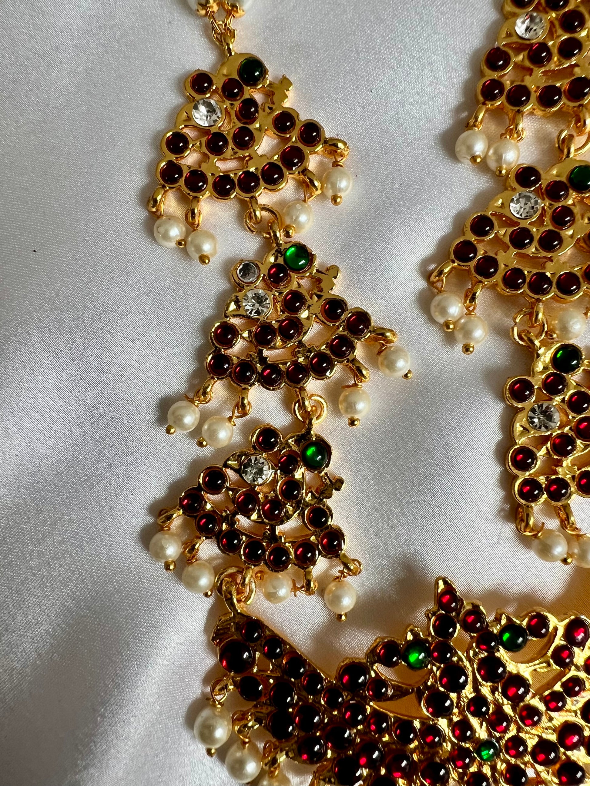A stunning traditional South Indian Kemp imitation jewellery embellished with ruby kemp stones with pearls hanging down to give it that pop. A beautiful piece to wear on its own with a traditional outfit.