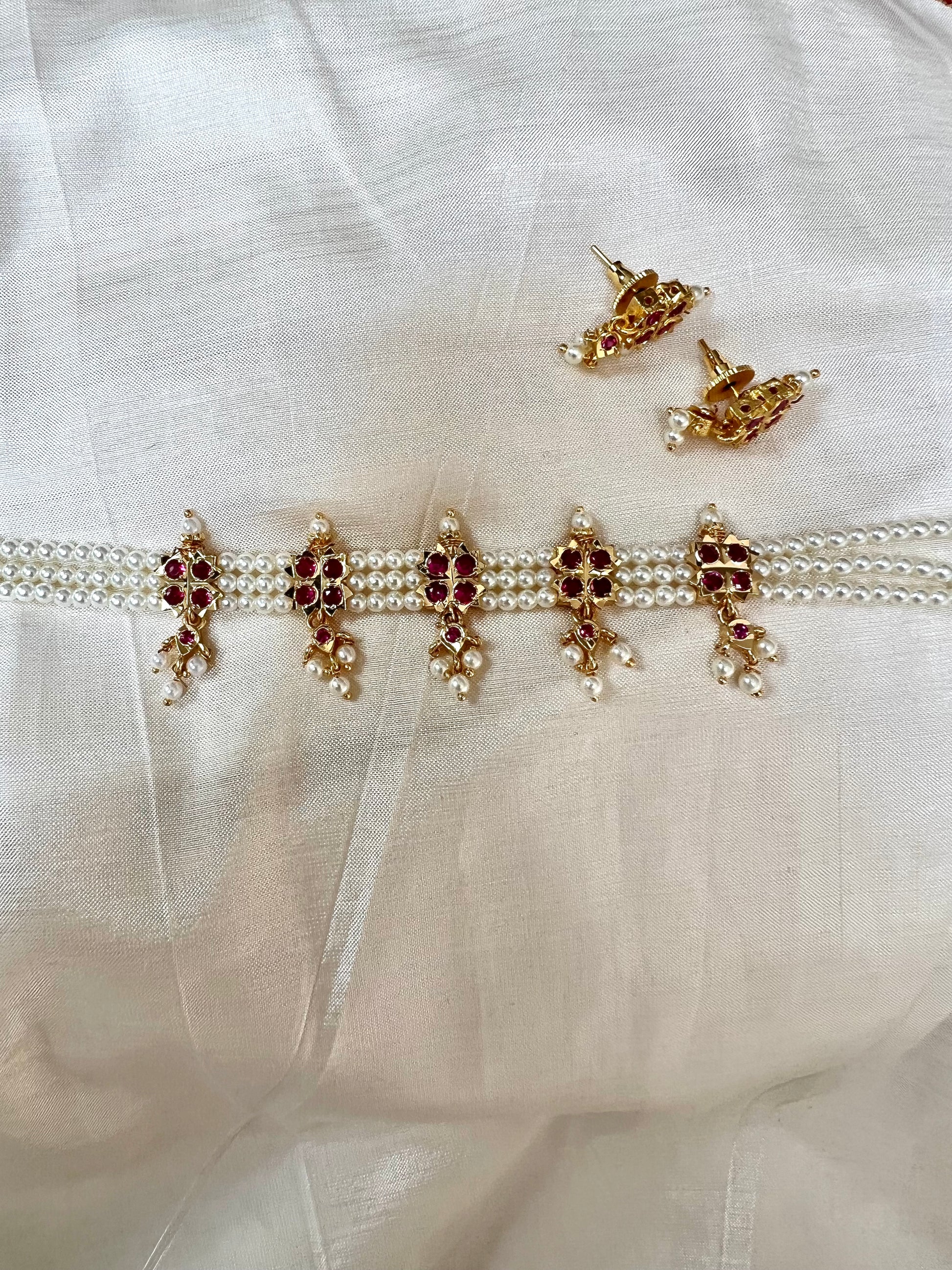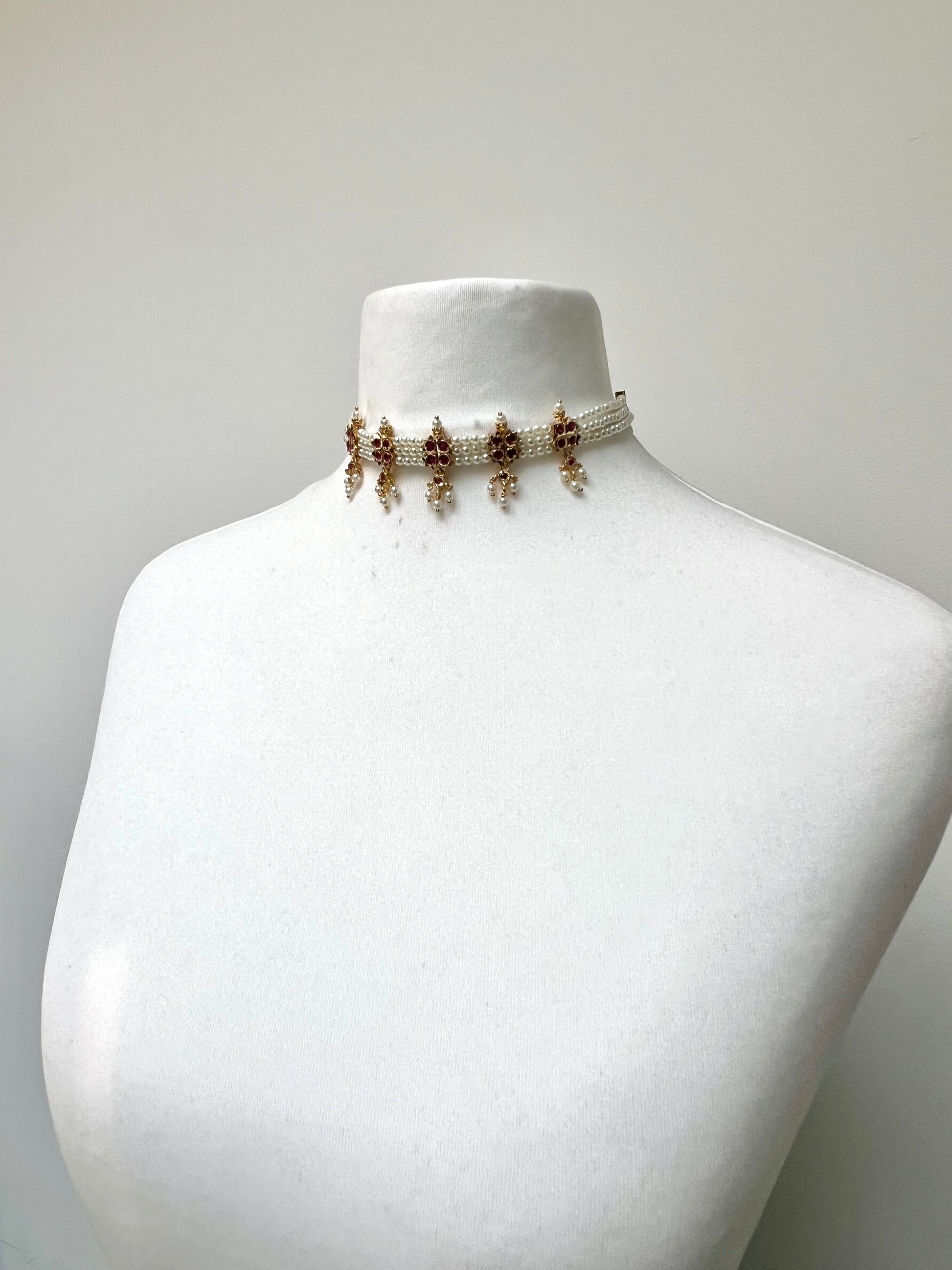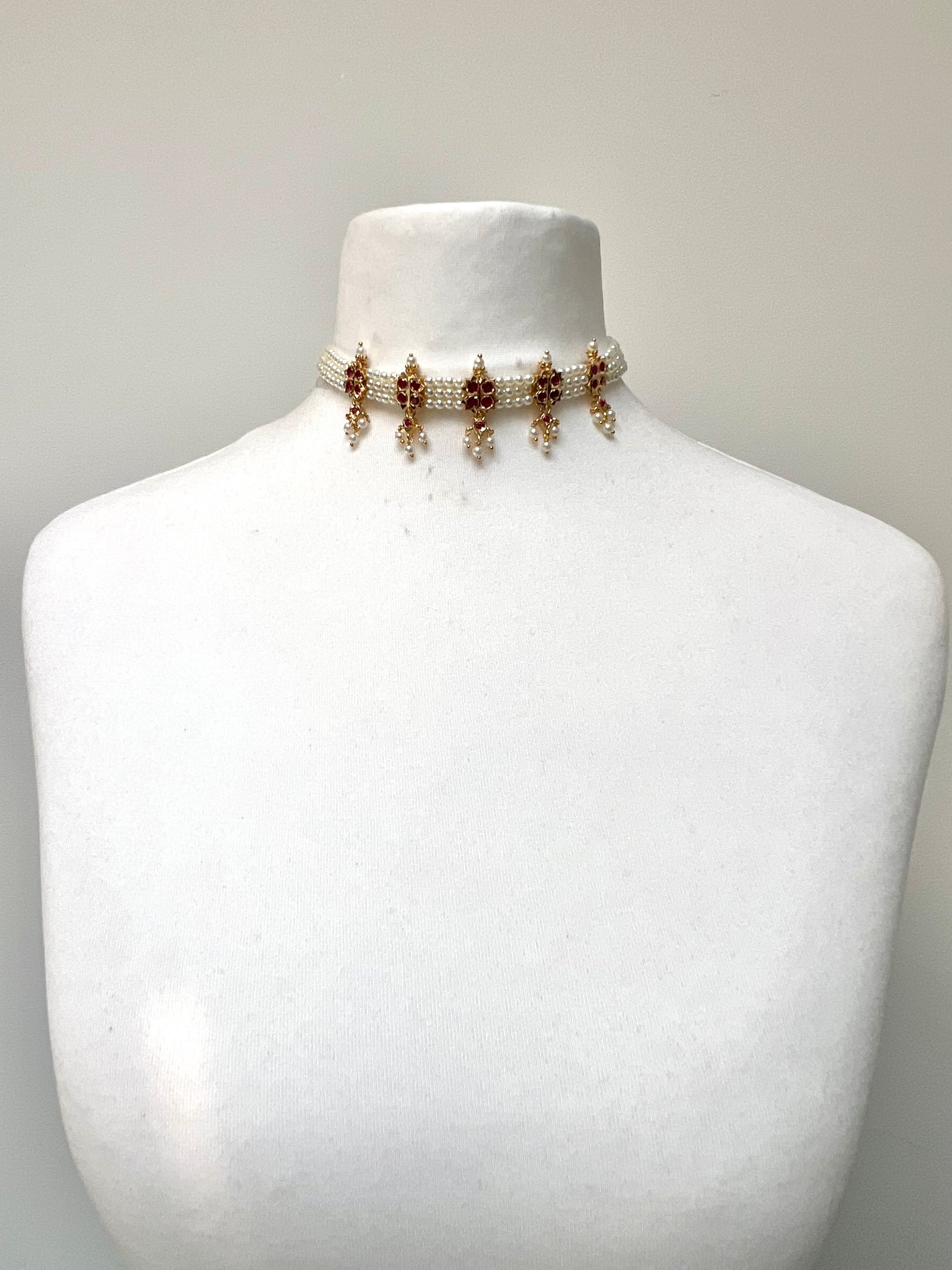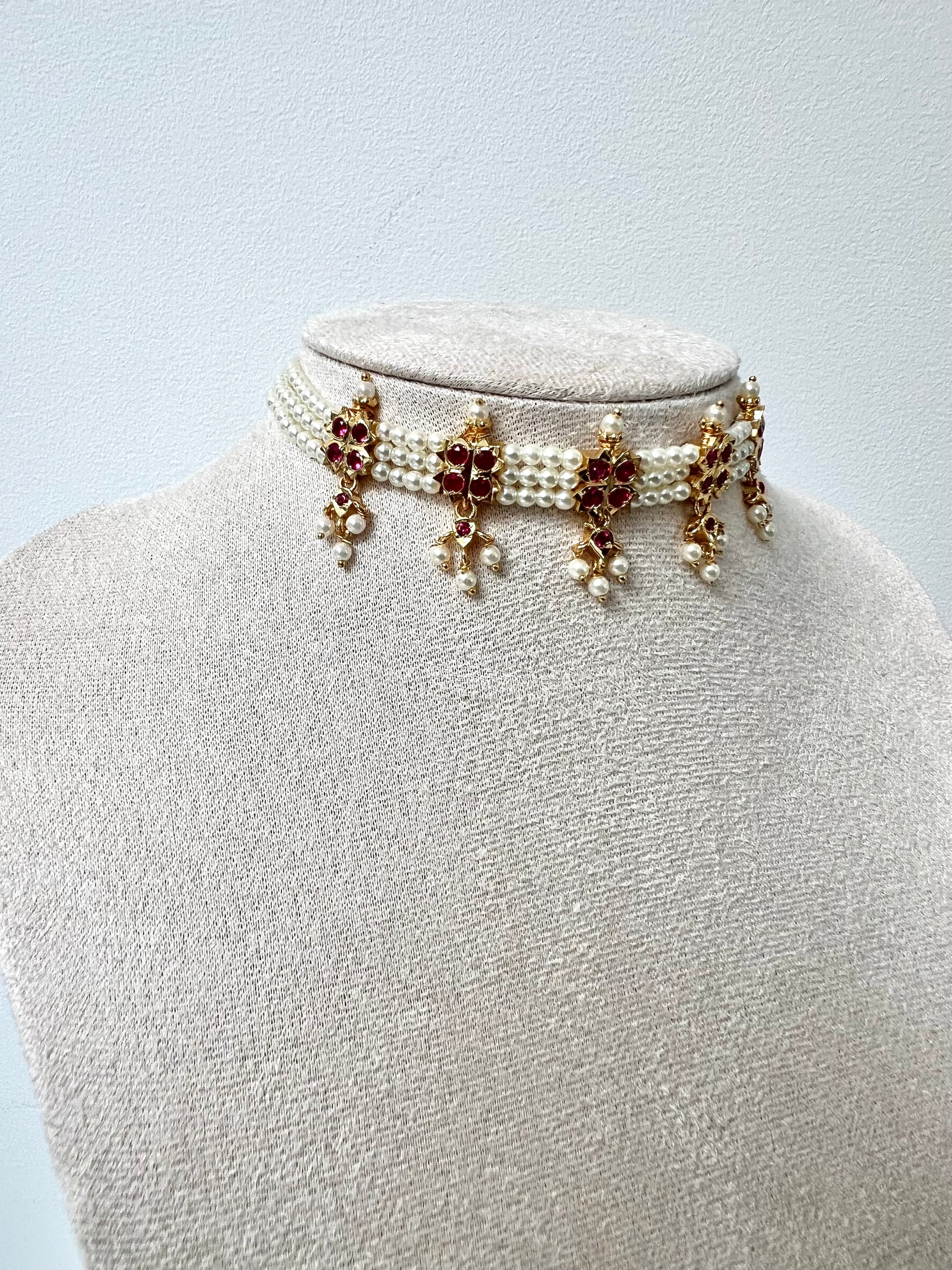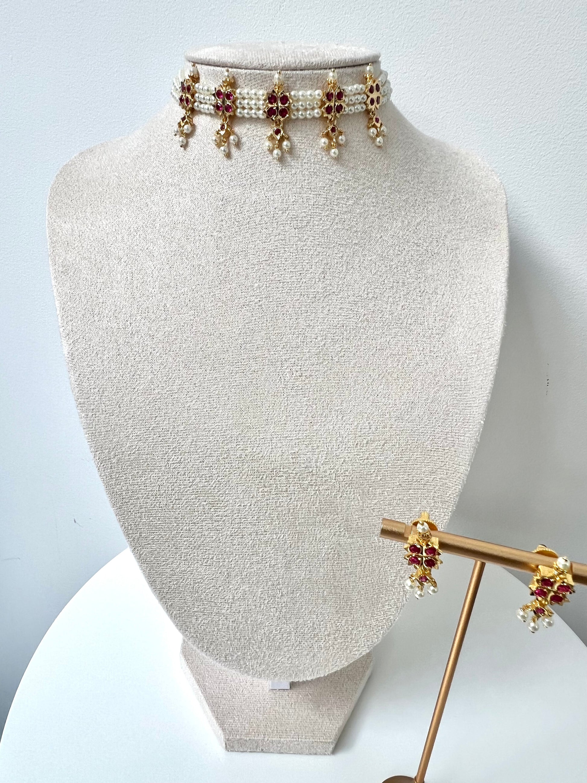 SUNDARI - Impon pearl choker in ruby and white with matching earrings N3303