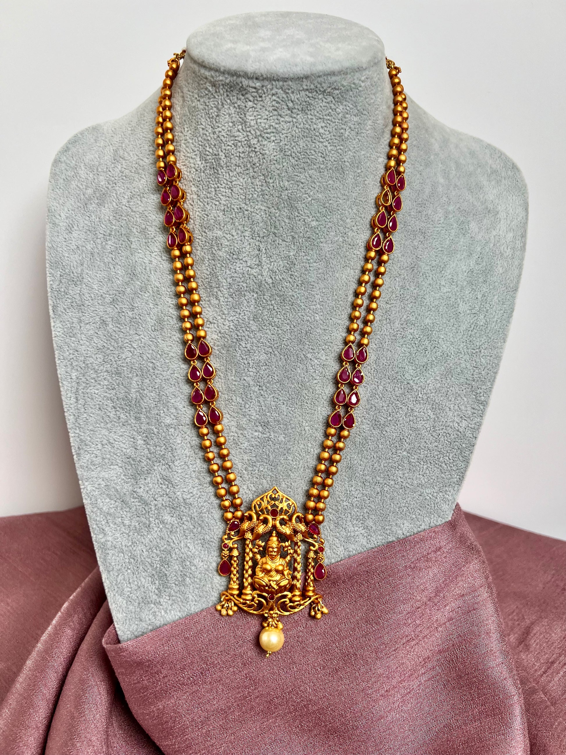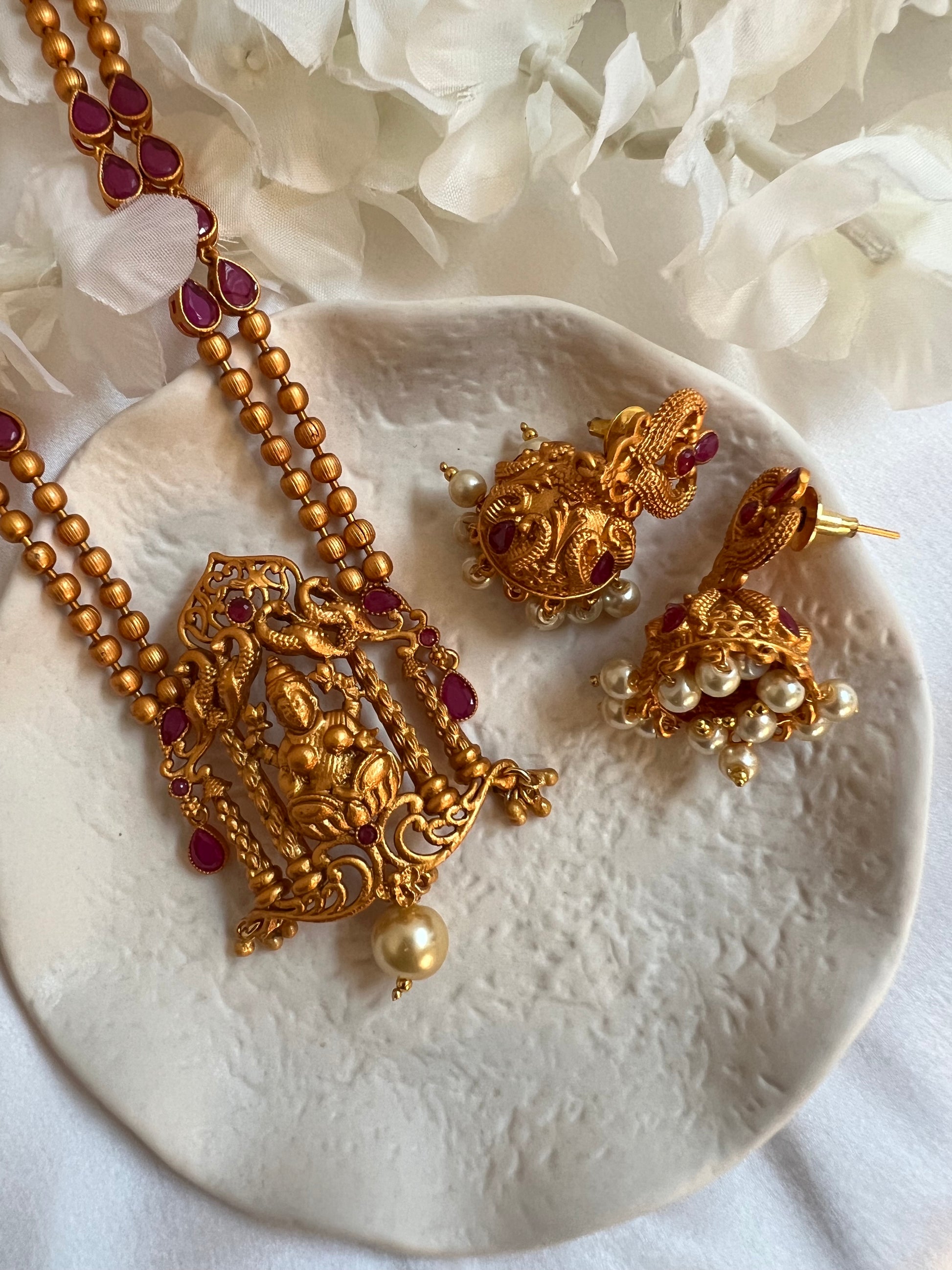 Unique Antique Lakshmi temple necklace set in yellow gold and ruby stones, with matching jhumkas