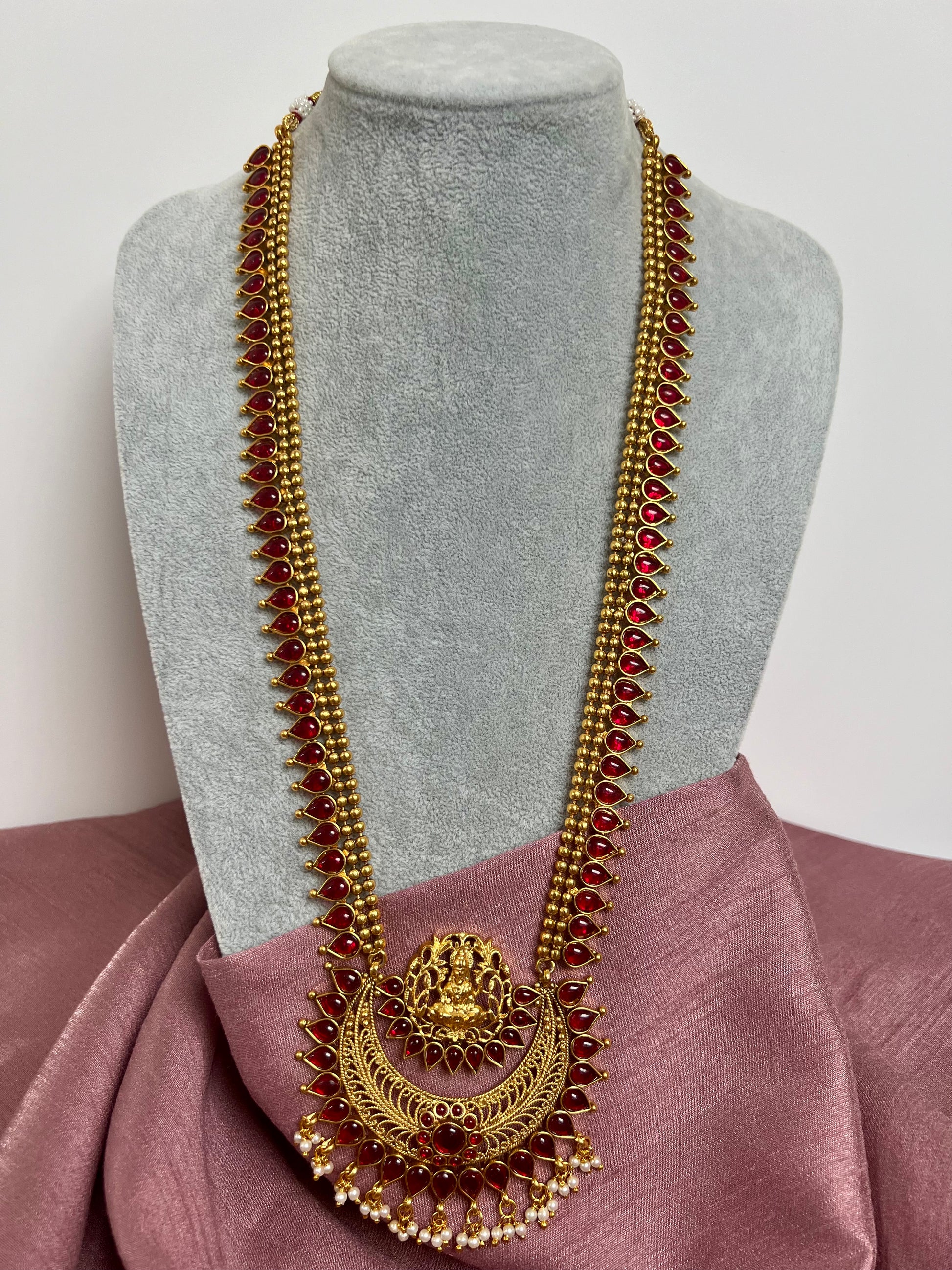This long golden Lakshmi temple necklace is embellished with teardrop ruby stones, small white dangling pearls and golden beads. Along with beautiful matching jhumkas, this statement piece screams for attention!