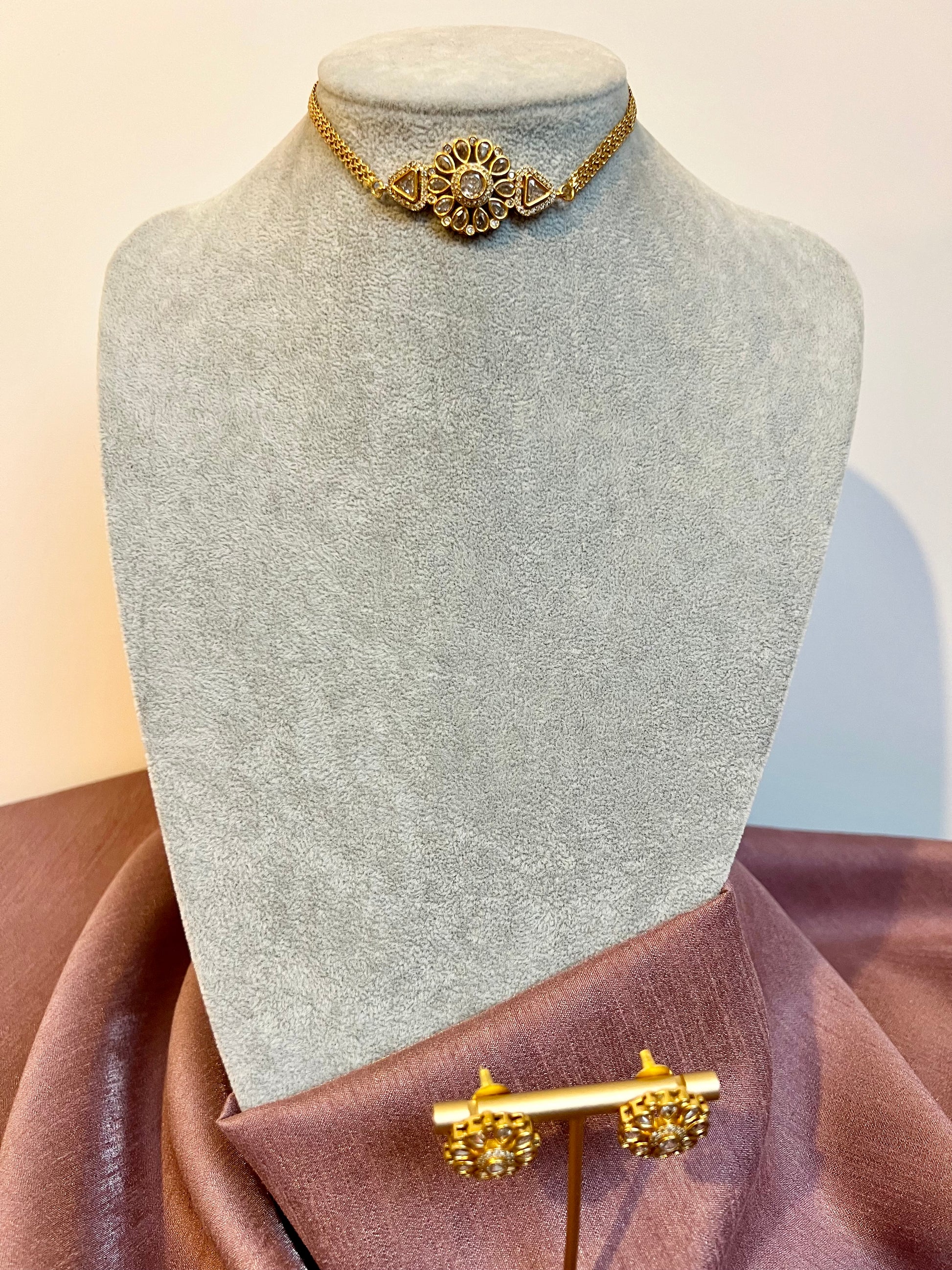 Small golden choker necklace embellished with sparkly white stones, comes with matching earrings.