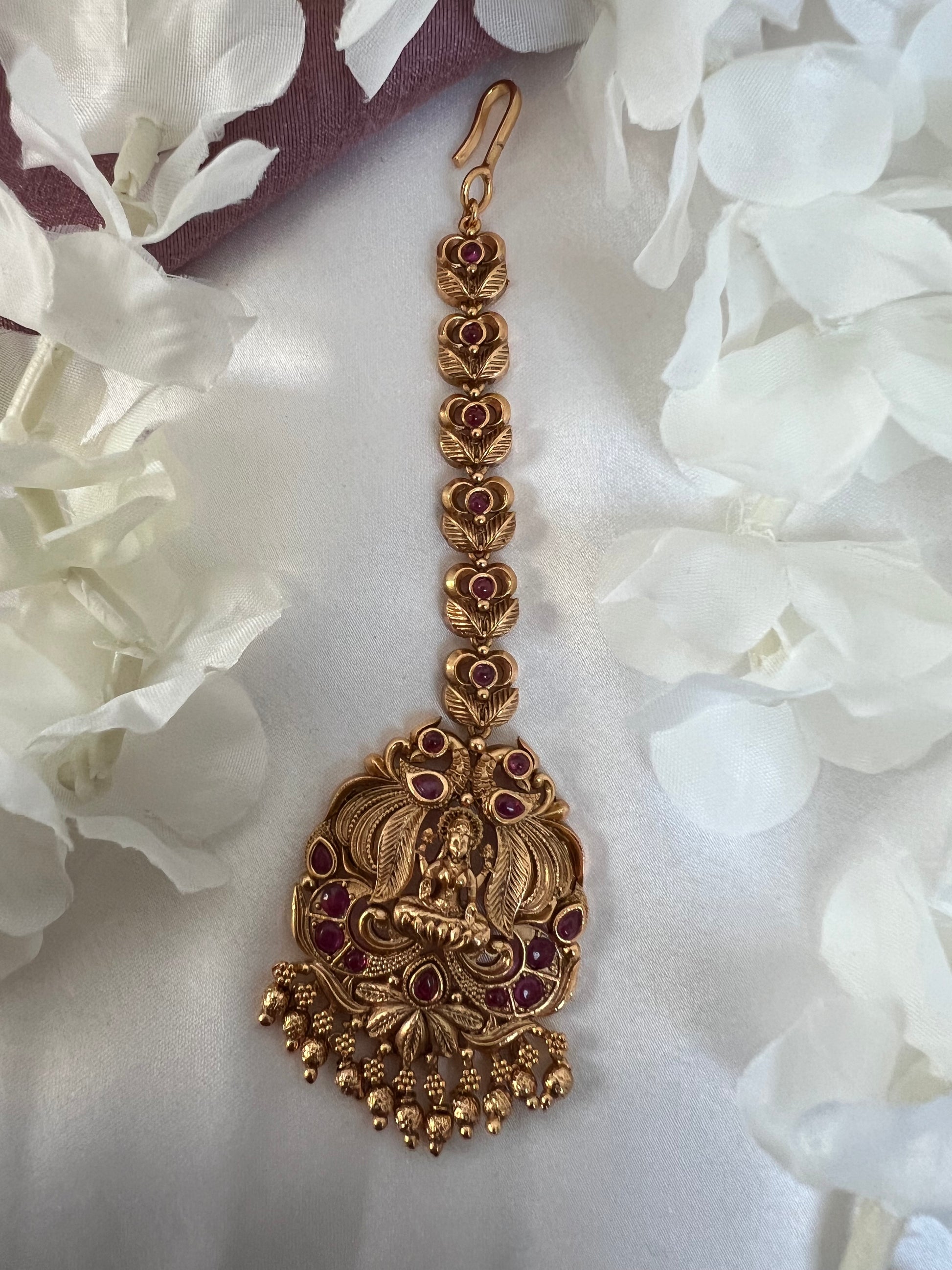 Premium quality antique temple matte gold plated maang tikka in ruby with a intricate God Lakshmi design, simple Indian jewellery at its finest.