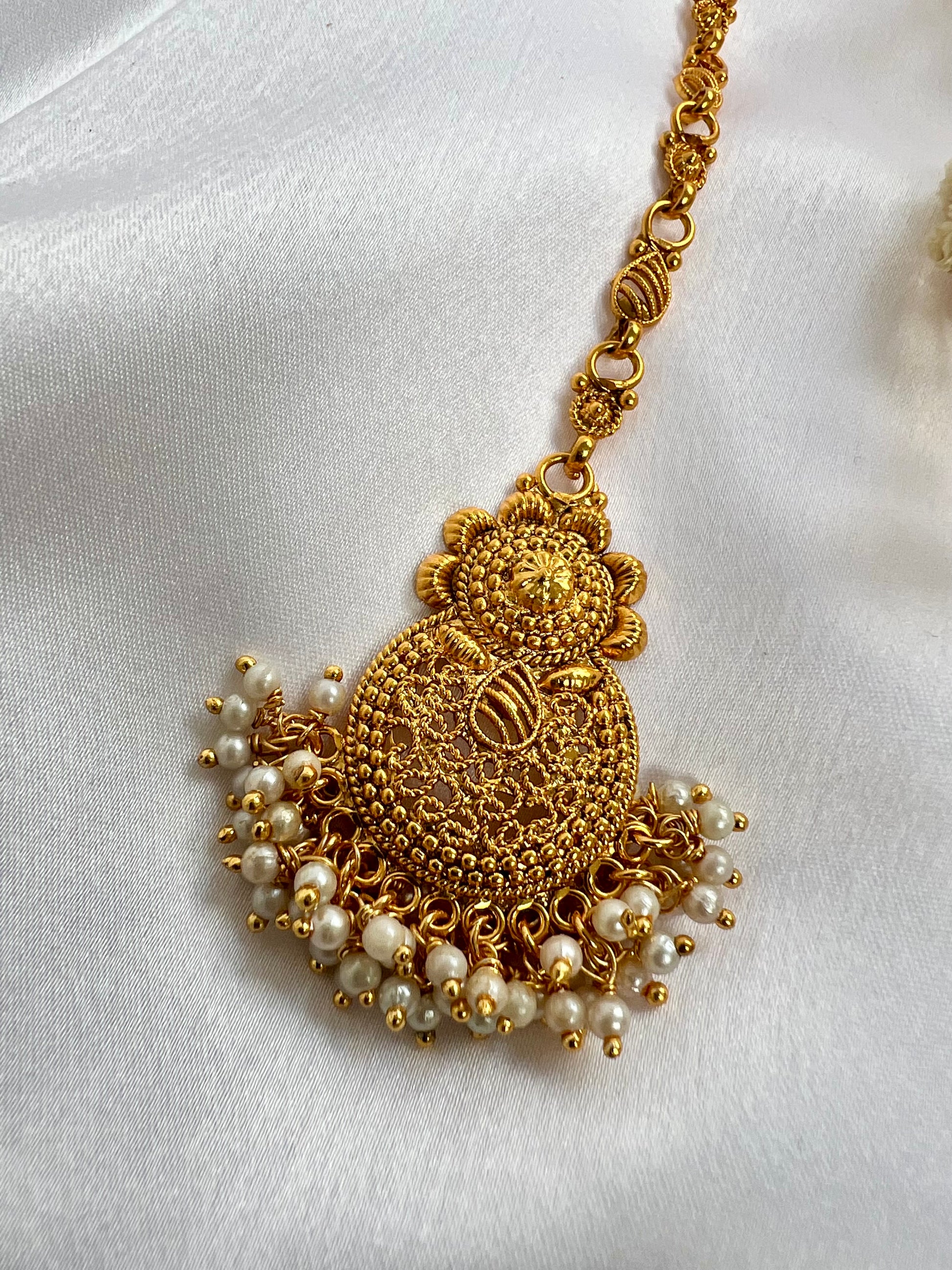 Premium quality gold plated maang tikka with an intricate design and white pearls, simple Indian jewellery at its finest.