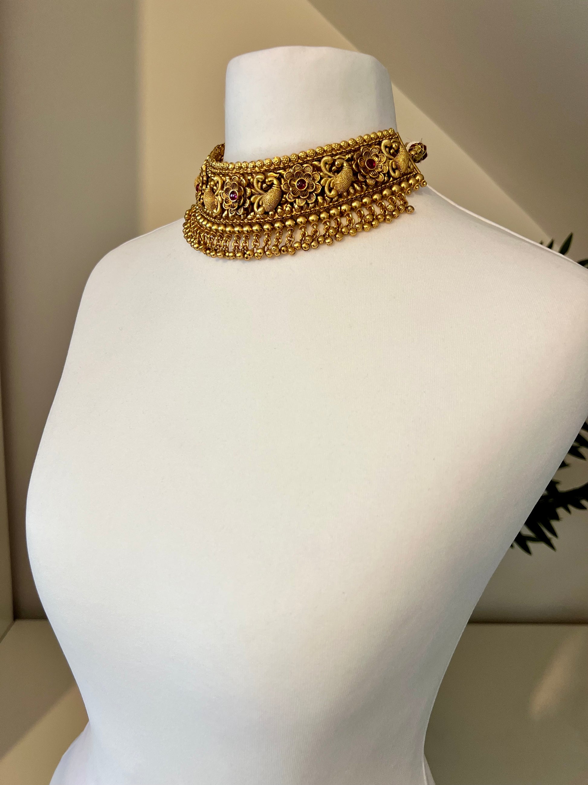 Antique high neck jewellery piece with peacock motifs and flower, embellished with golden dangling pearls and ruby stones, comes with matching jhumkas and tikka