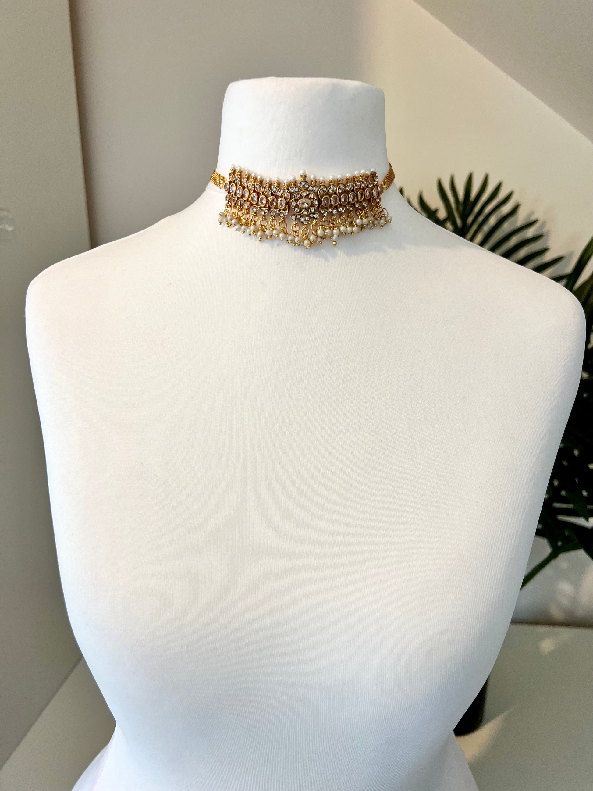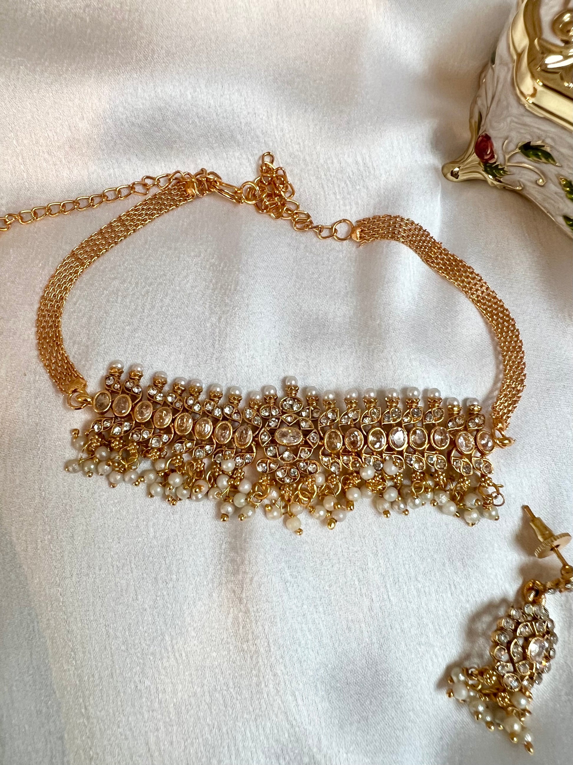 Simple yet stunningly beautiful small choker necklace embellished with white stones and pearls, this jewellery set will match with any outfit and perfect for bridesmaids too.